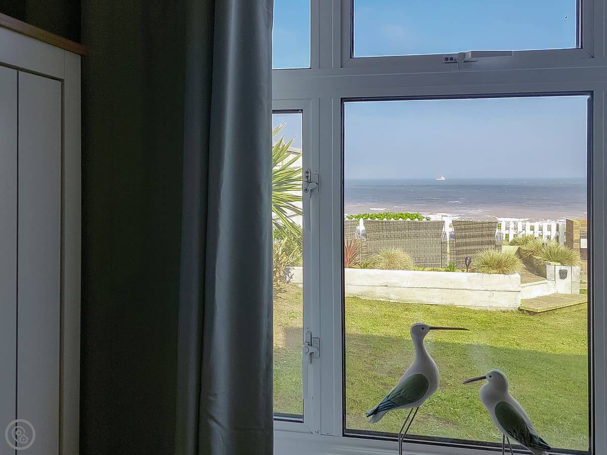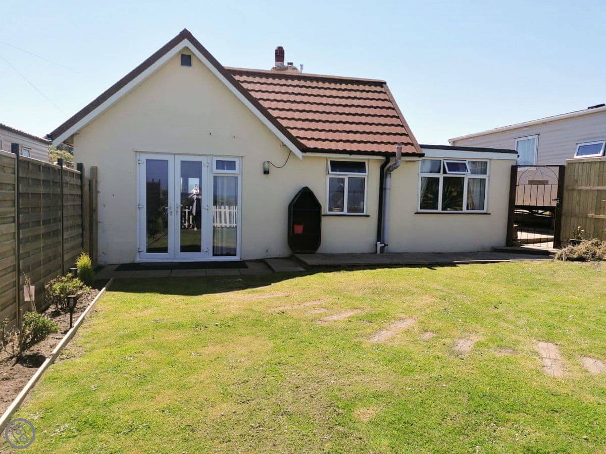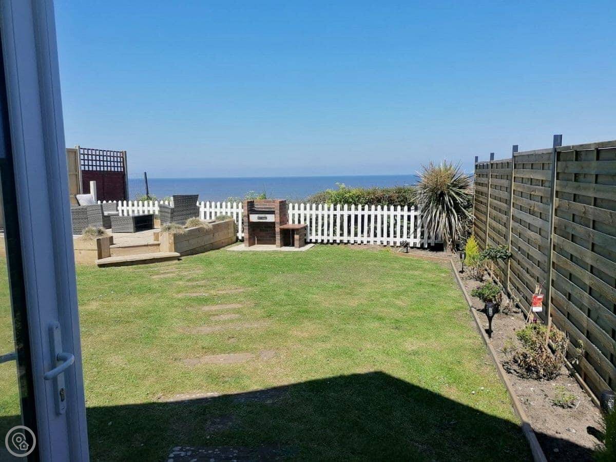 Sea View Cottage is in East Runton, Norfolk. It's a bungalow. The main thing is the view from the living room, you can see all the way along the beach to Cromer Pier. It's on the edge of a caravan site, but you've got your own enclosed garden and patio.