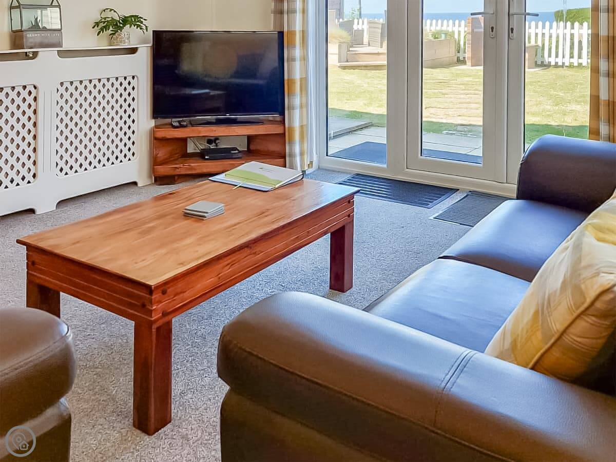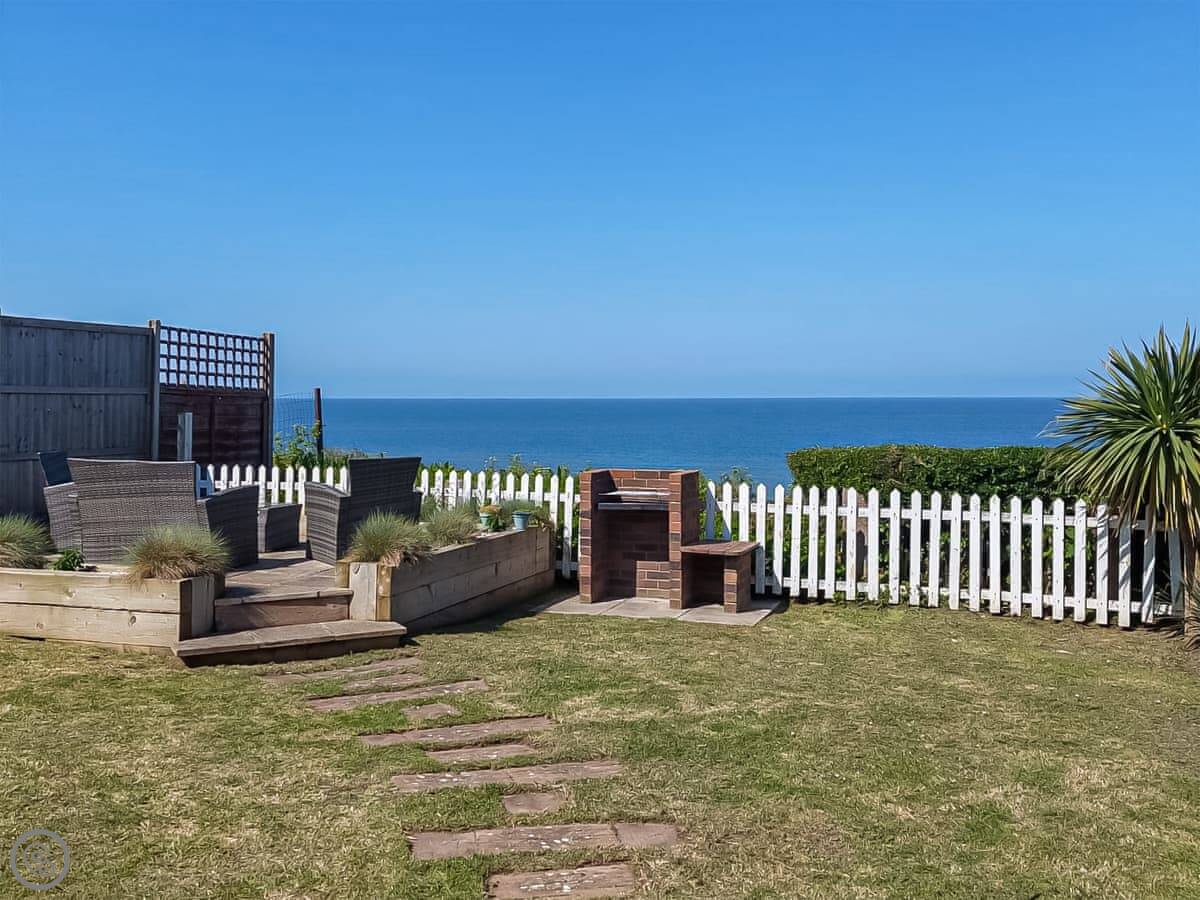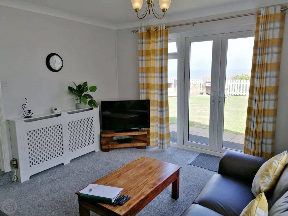 Sea View Cottage is in East Runton, Norfolk. It's a bungalow. The main thing is the view from the living room, you can see all the way along the beach to Cromer Pier. It's on the edge of a caravan site, but you've got your own enclosed garden and patio.