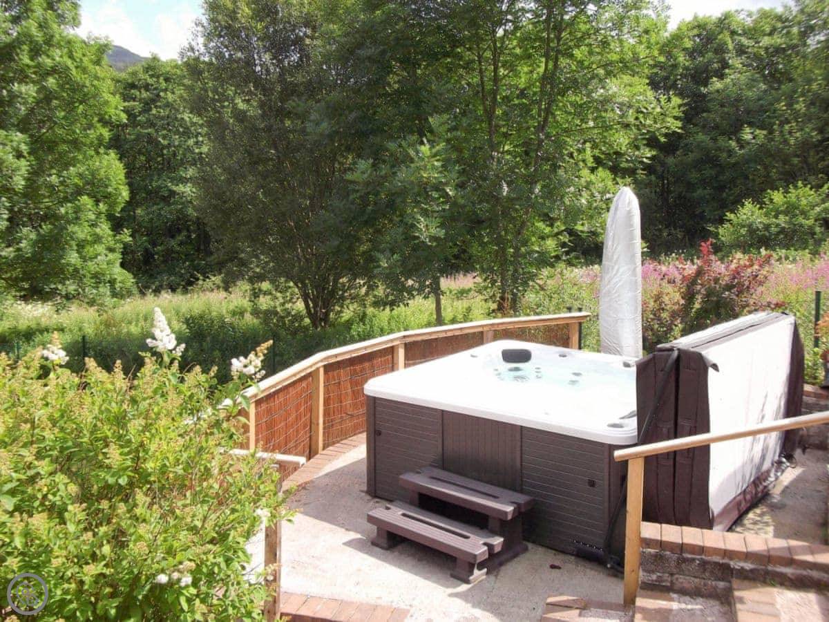 The garden has a patio with seating, and a garden room you can use if the weather isn't great. You get a good view of the hills from there. There's also a hot tub. And a wood burning stove for colder nights.