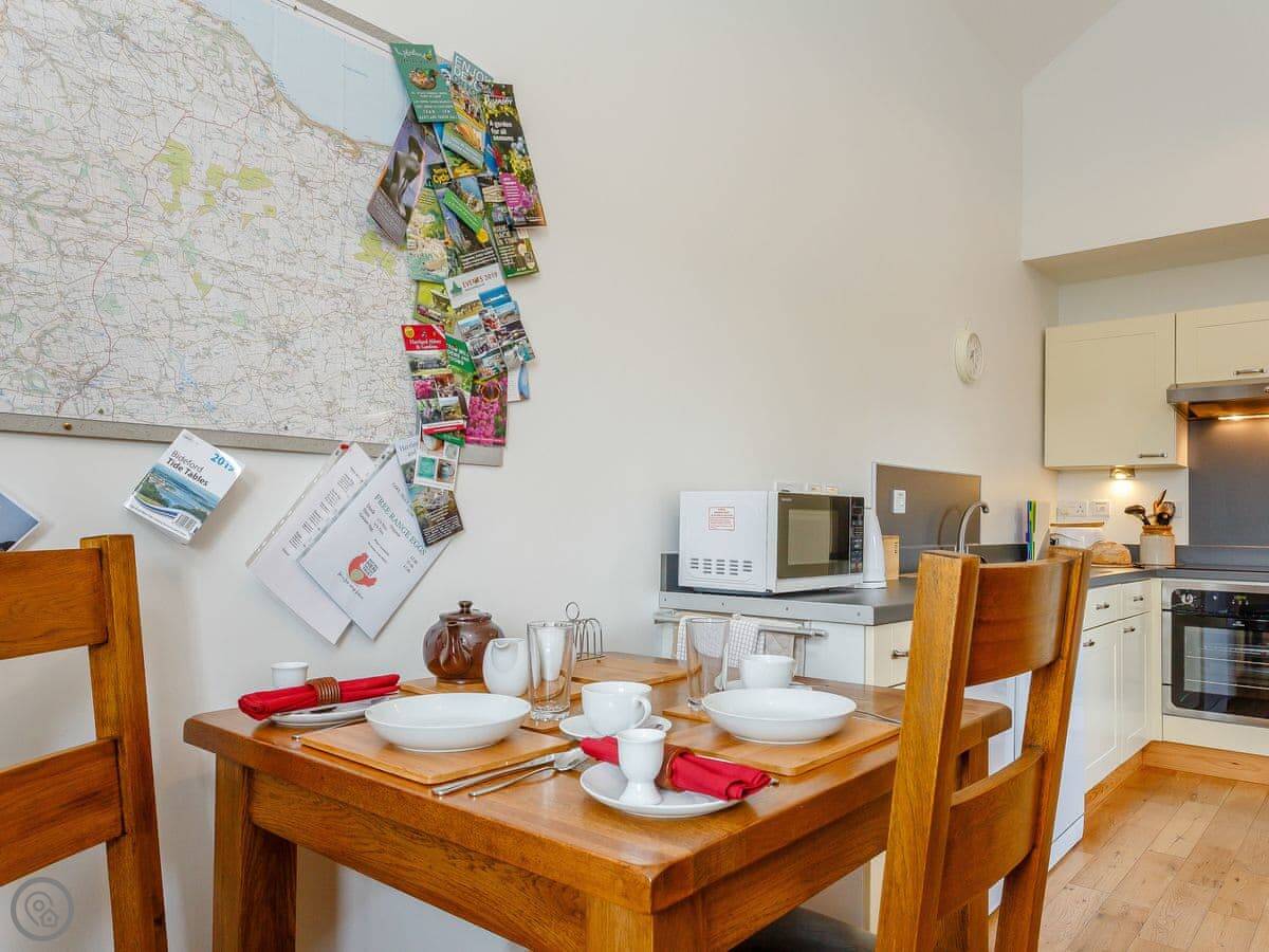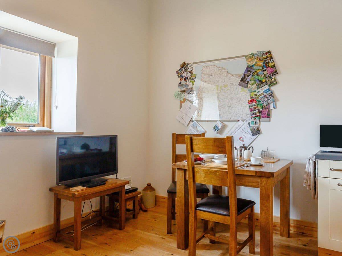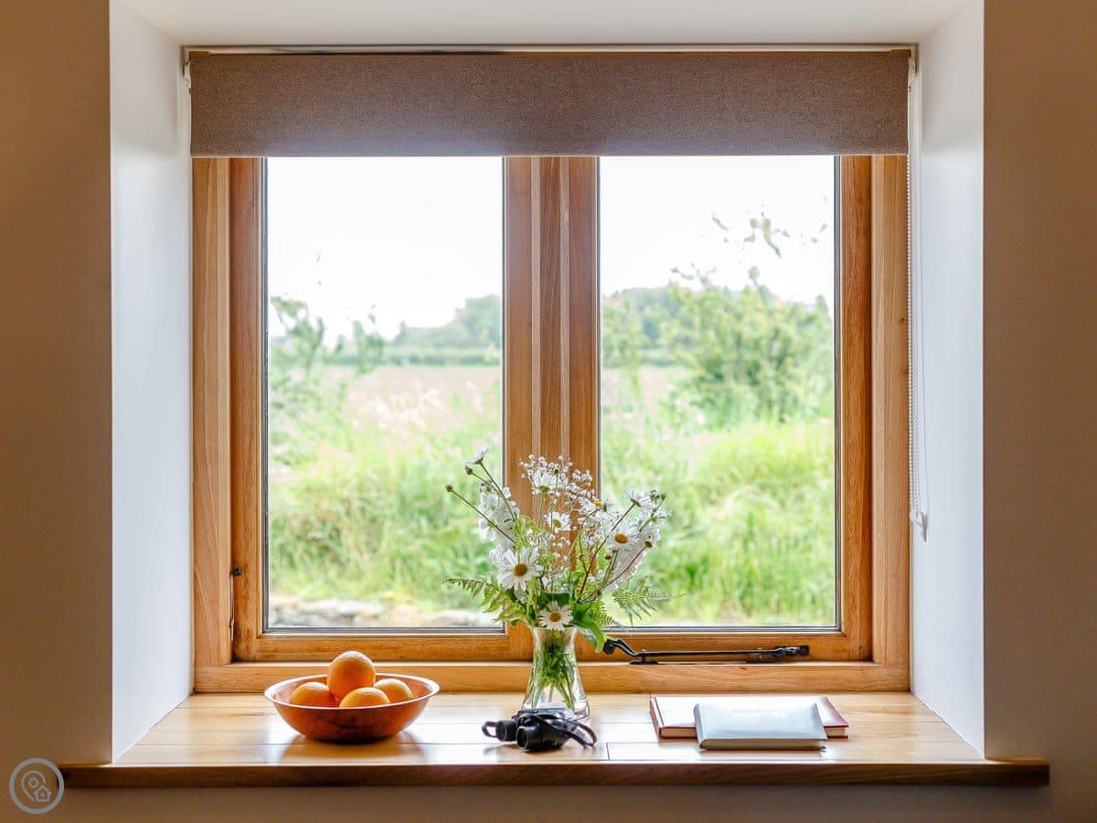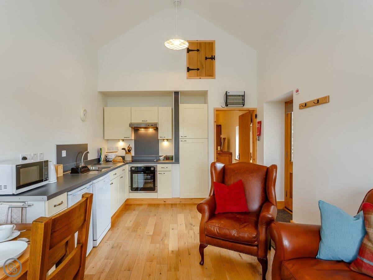The barn has high ceilings and oak floors. It's open plan downstairs. There's a patio area outside your door that's just for you, with a table and chairs. You share a bigger garden area with the other barns, which has a barbecue and a herb garden. There's a large meadow too, which is good for letting dogs run.