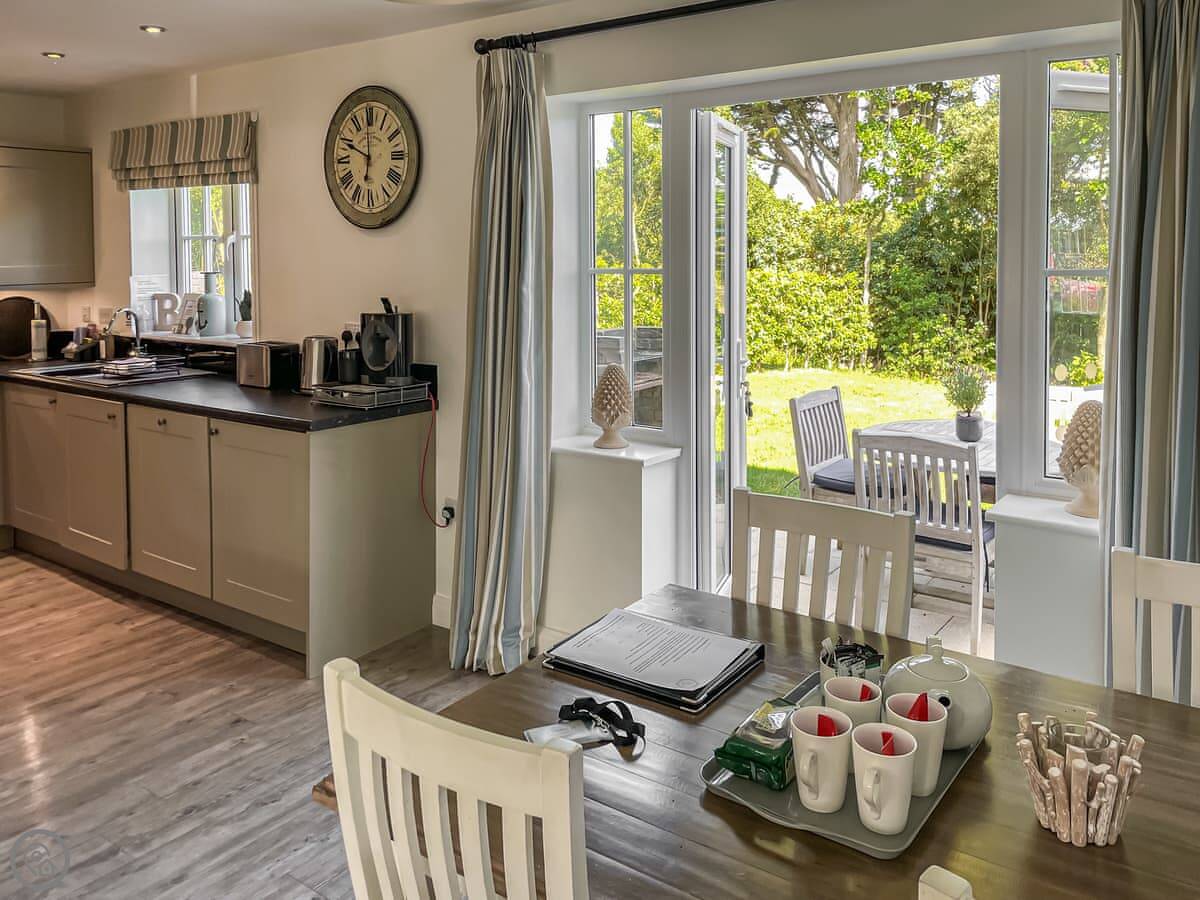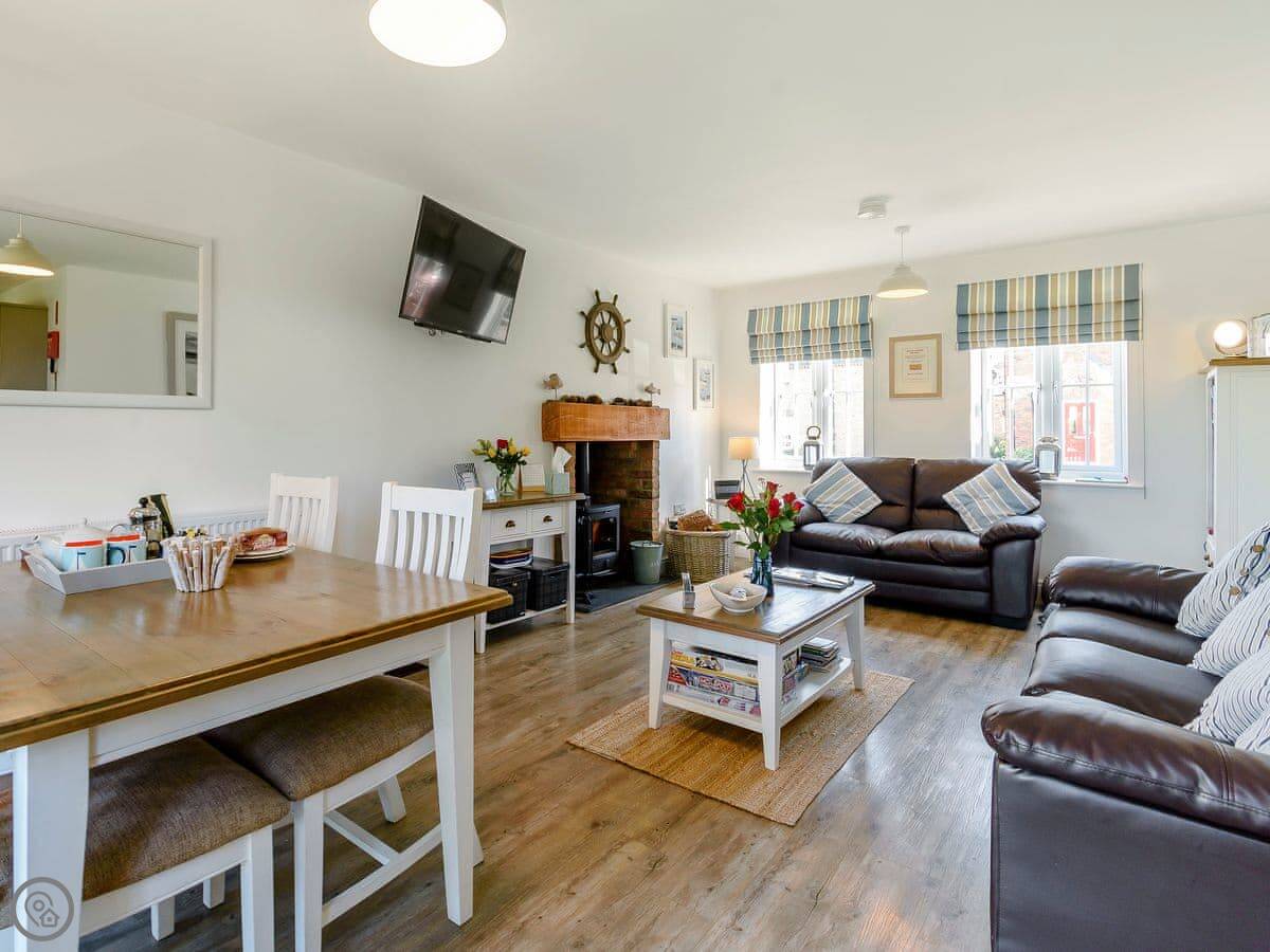 Downstairs is open plan with a wood burner. French doors go out to your own bit of grass with seating and a barbecue. It's decorated for Christmas if you're staying then.