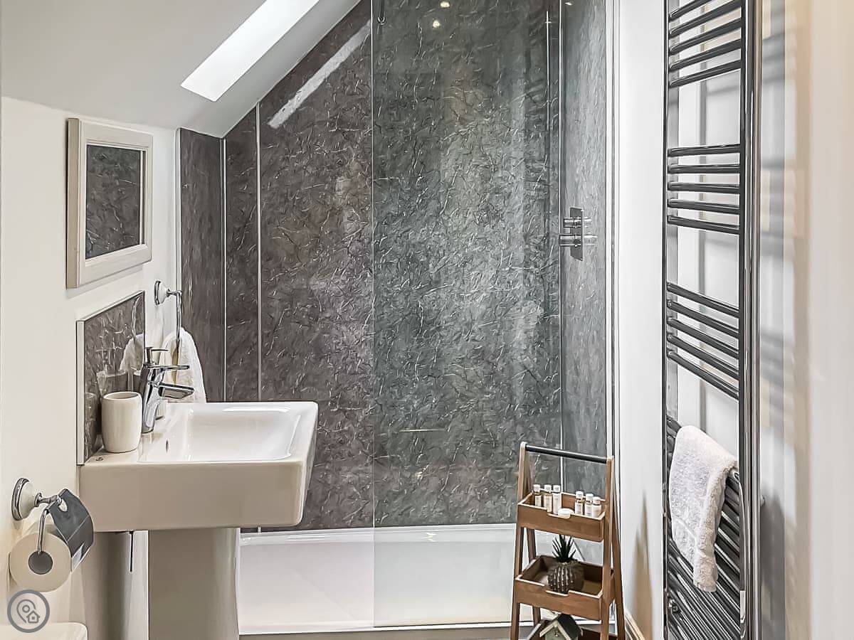 It sleeps four. Two bedrooms, both with their own bathrooms with rainfall showers. The main bedroom has a super king memory foam bed. The second room has twin memory foam beds. Both have blackout blinds.
