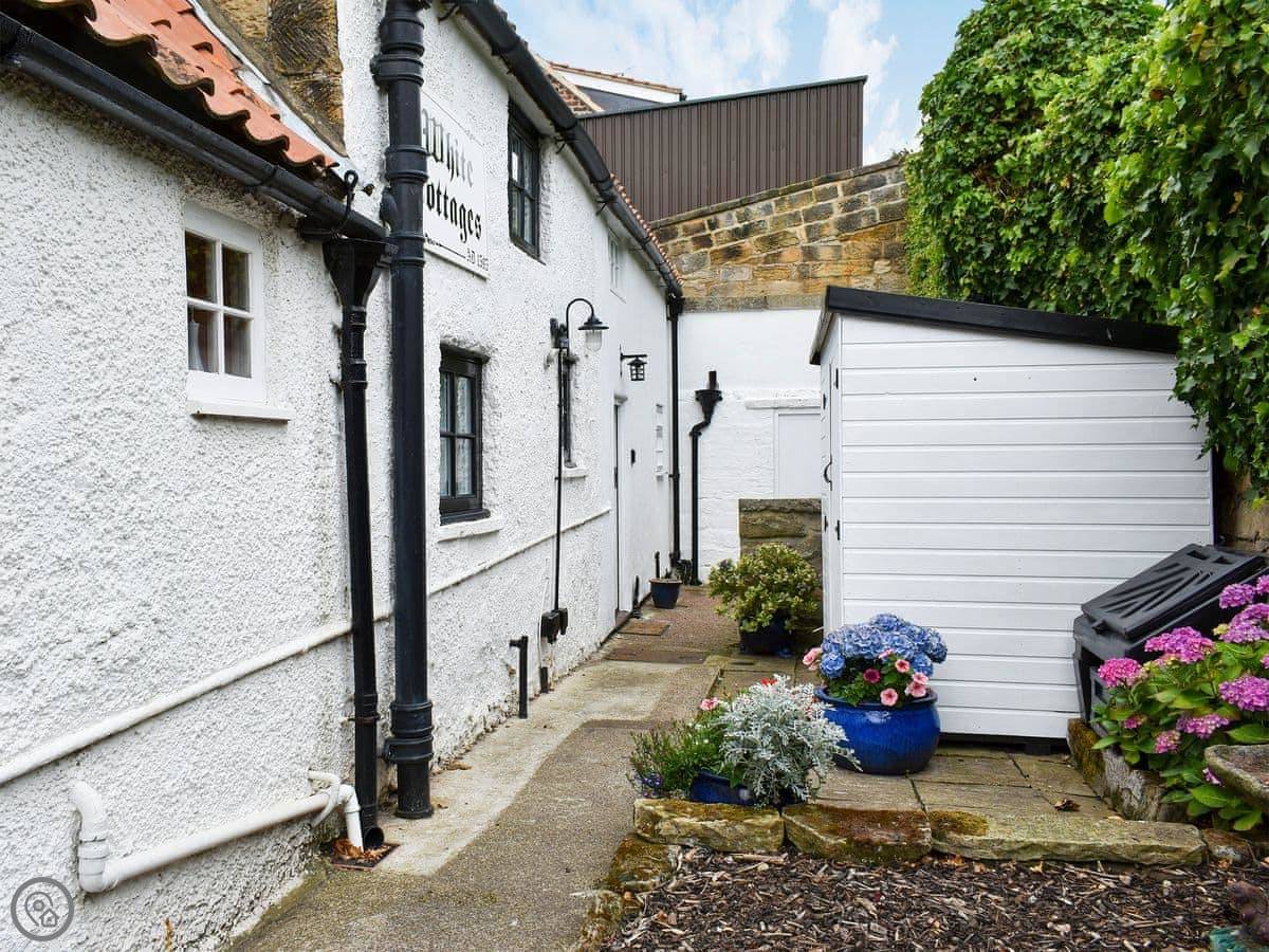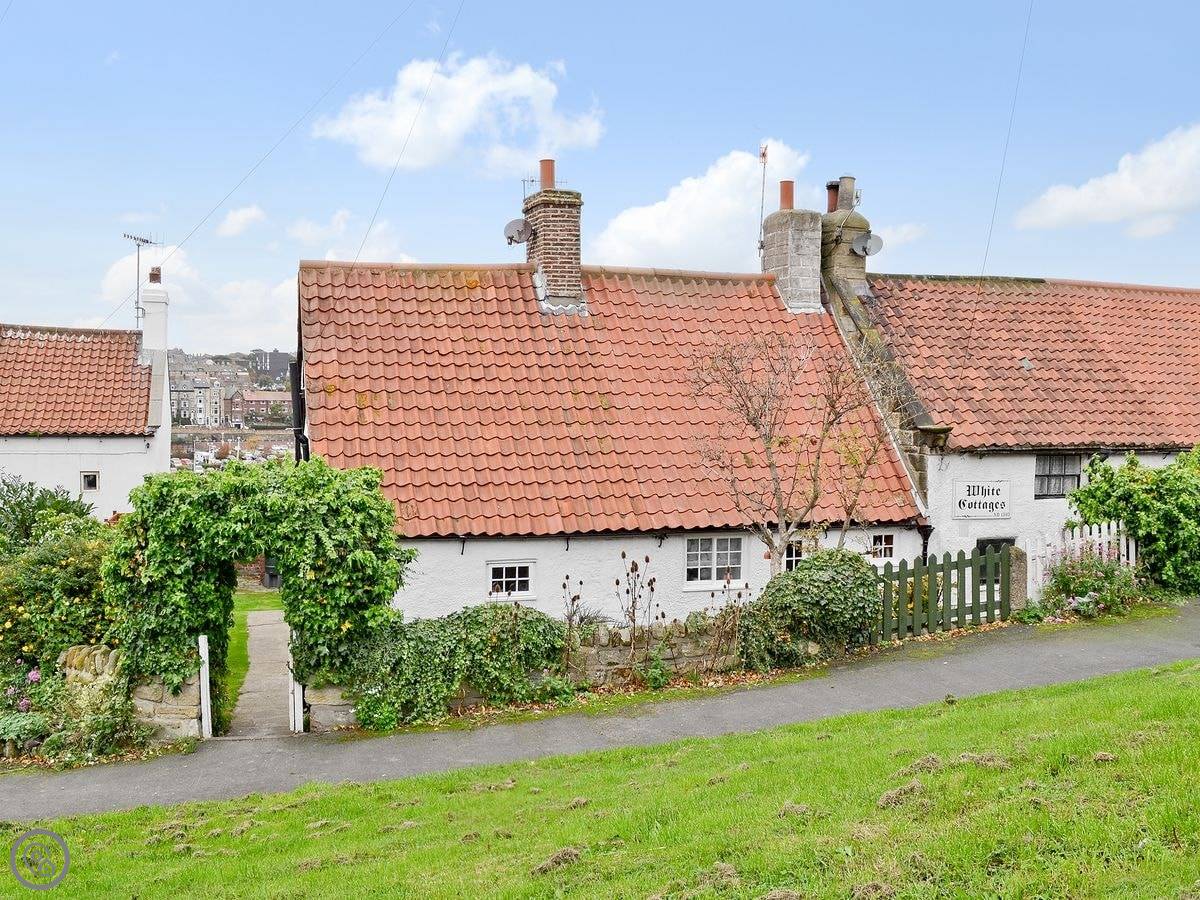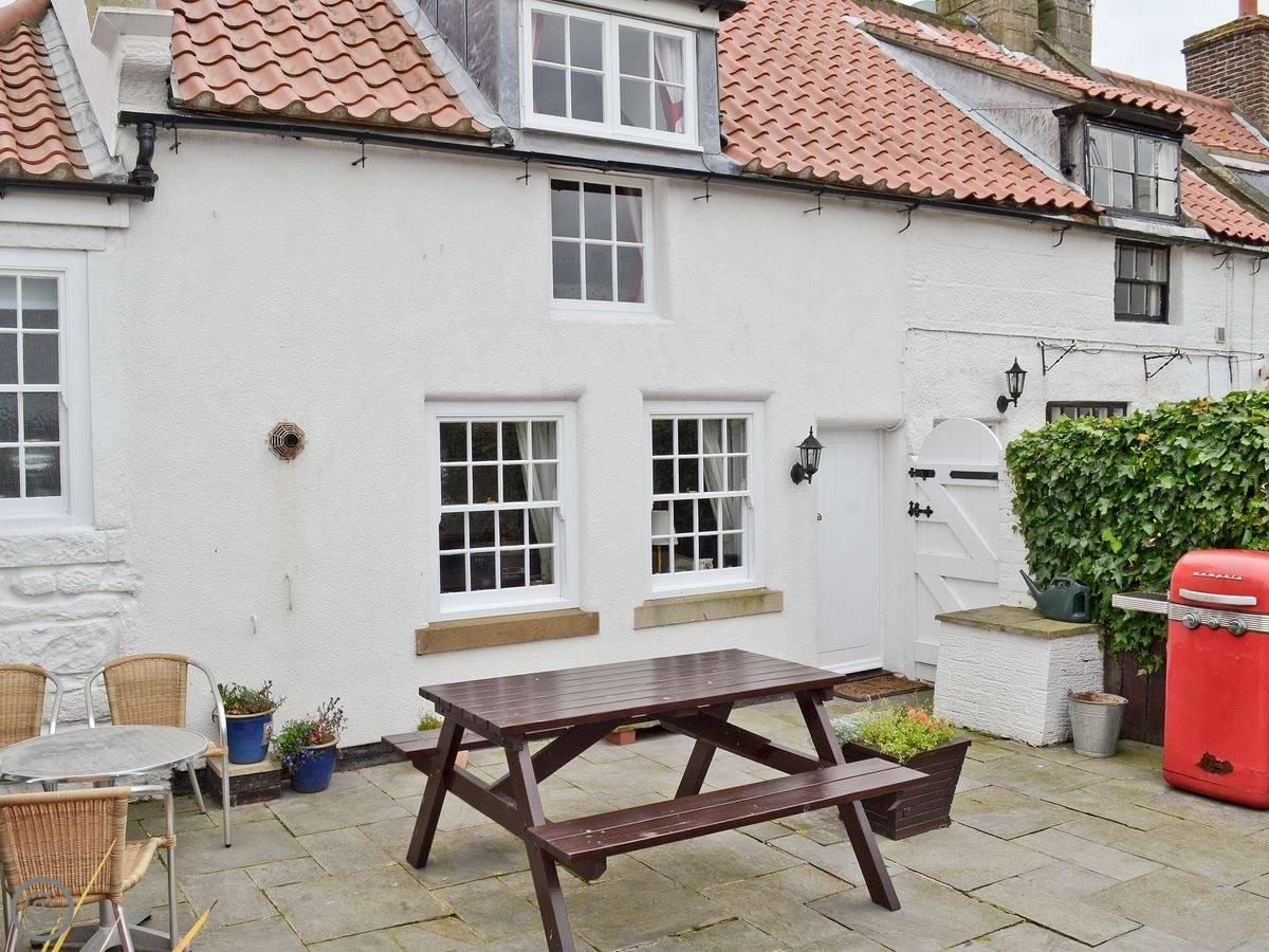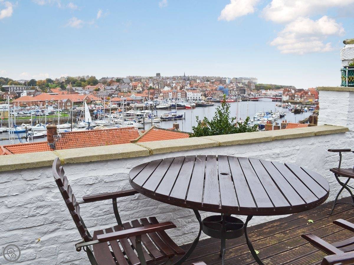 White Cottage is at the top of Whitby, up by the West Cliff. It's a terraced cottage, but it's got its own small patio with a view over the town and out to sea.