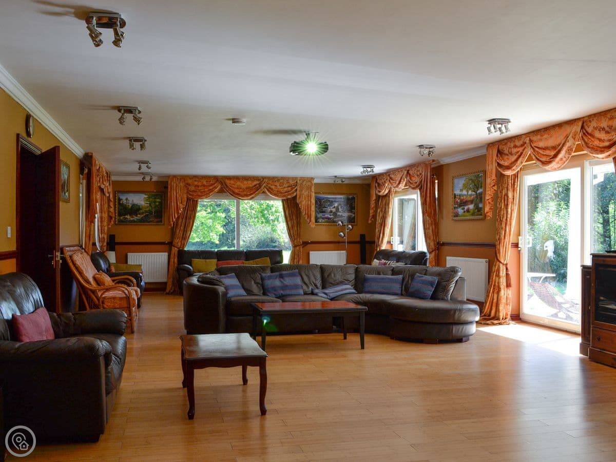 Inside, the main thing is the space. The living room has a big projector screen TV, about 22 foot. The dining room fits everyone. The kitchen is fine, and there's a utility room with two washing machines and two tumble dryers. With a group this size, that's useful.
