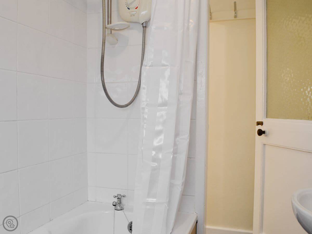 It sleeps four. Two bedrooms and one bathroom. The rating is 3 Star, so it's comfortable and clean. One bedroom has a double bed, the other has bunk beds. They're fine for kids. The stairs are a bit steep and narrow. Just so you know.
