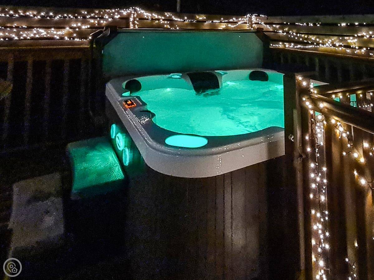 Outside, there's a patio and an enclosed garden area. The hot tub is out there, tucked off to the side among some trees. You get that to yourselves.