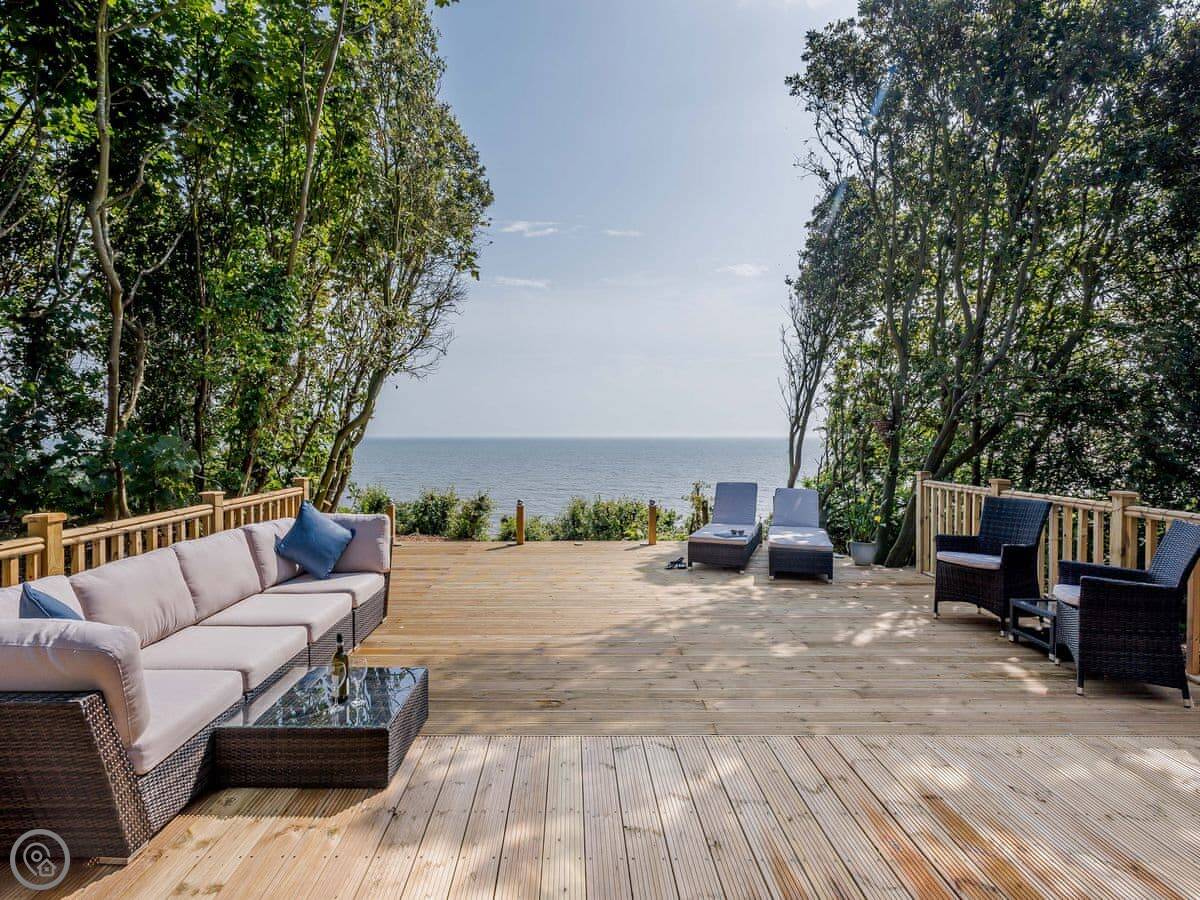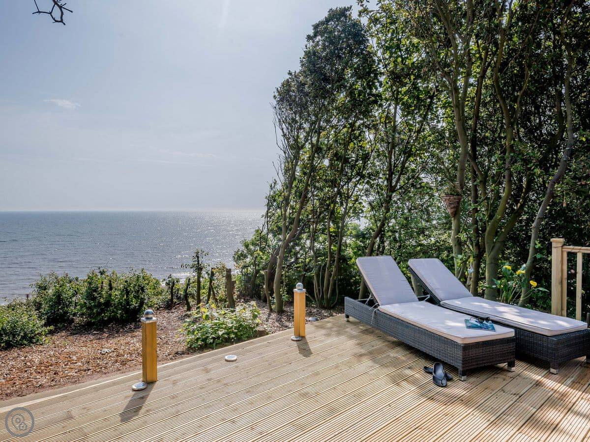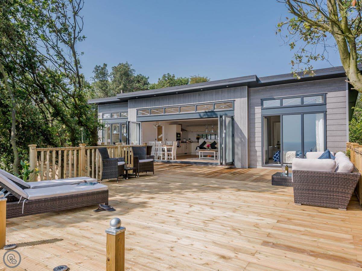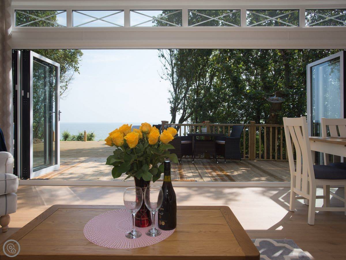 The big doors at the front open right up onto a deck. You can sit out there and look at the sea. There’s a path down to the beach from the site. It takes about three minutes to walk.