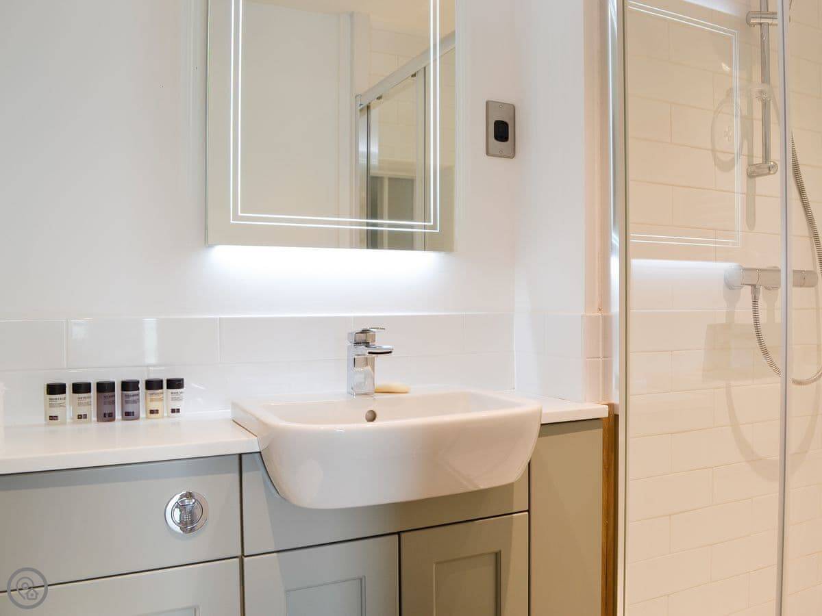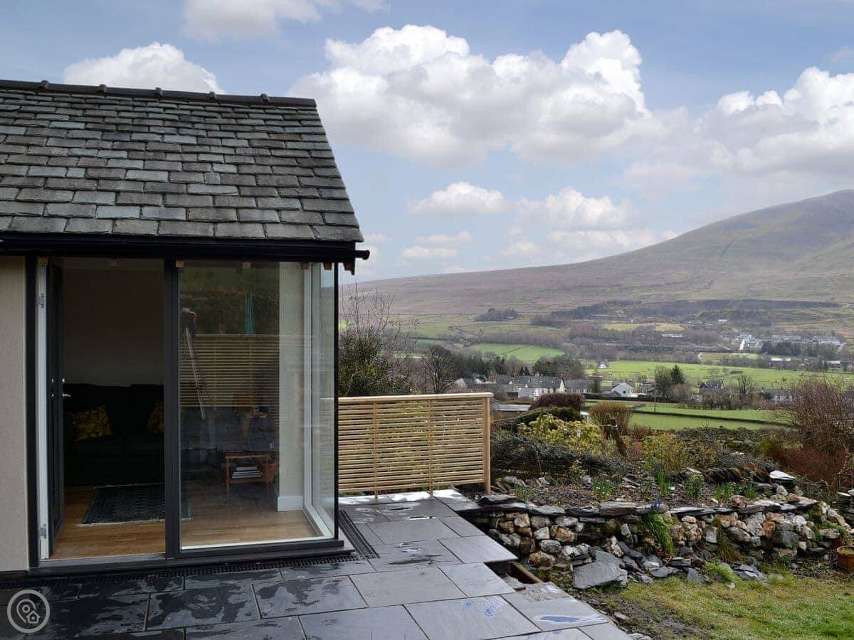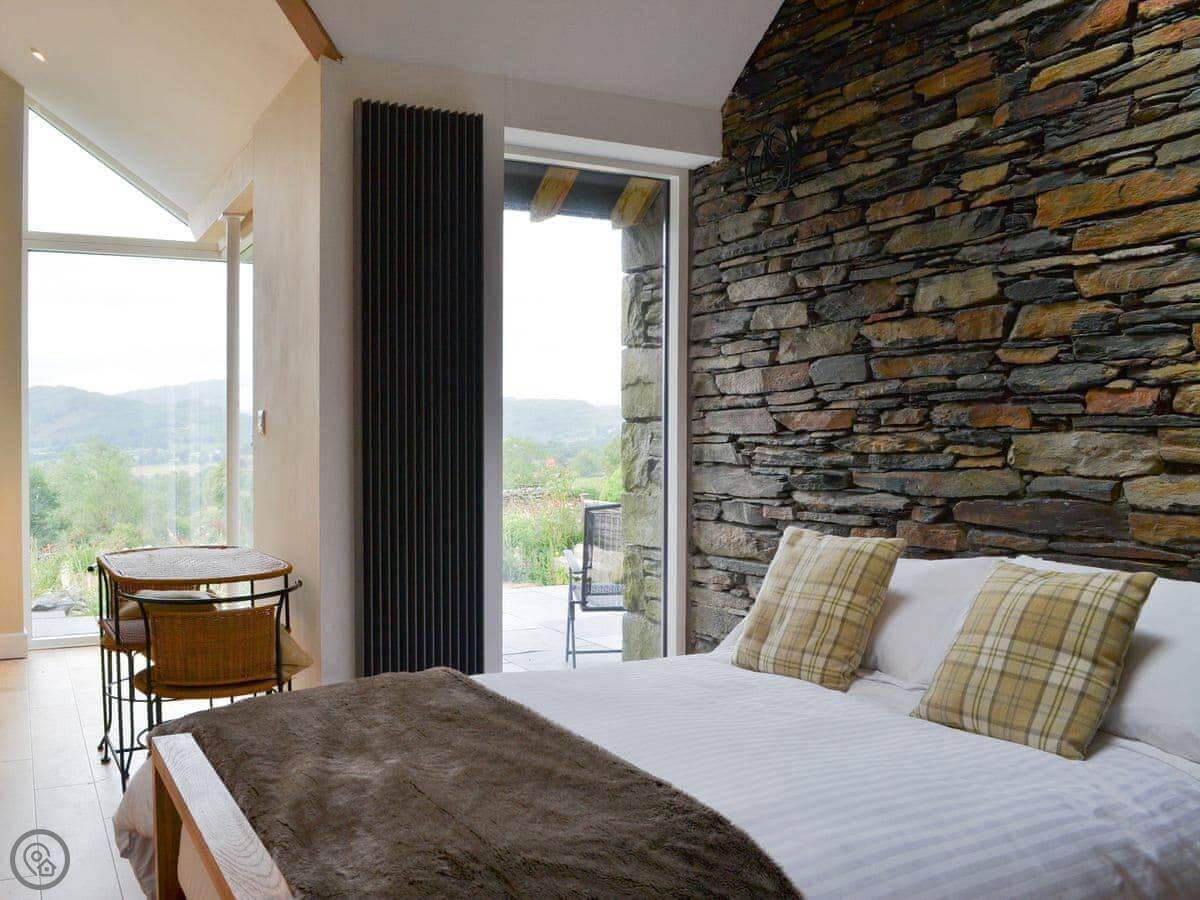 Everything's on one level. It's an open plan space, so the living area, kitchen and bed are all in one room. The bathroom is separate. The main thing is the view. There's a big window that looks straight out towards the fells. You can see them from the bed.