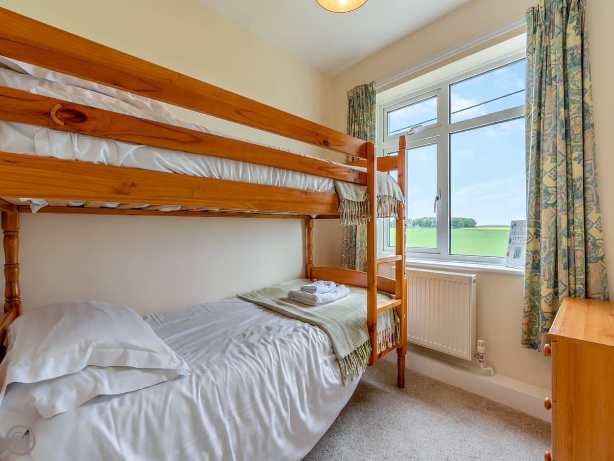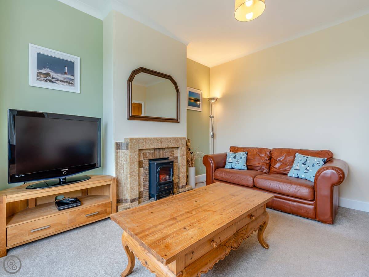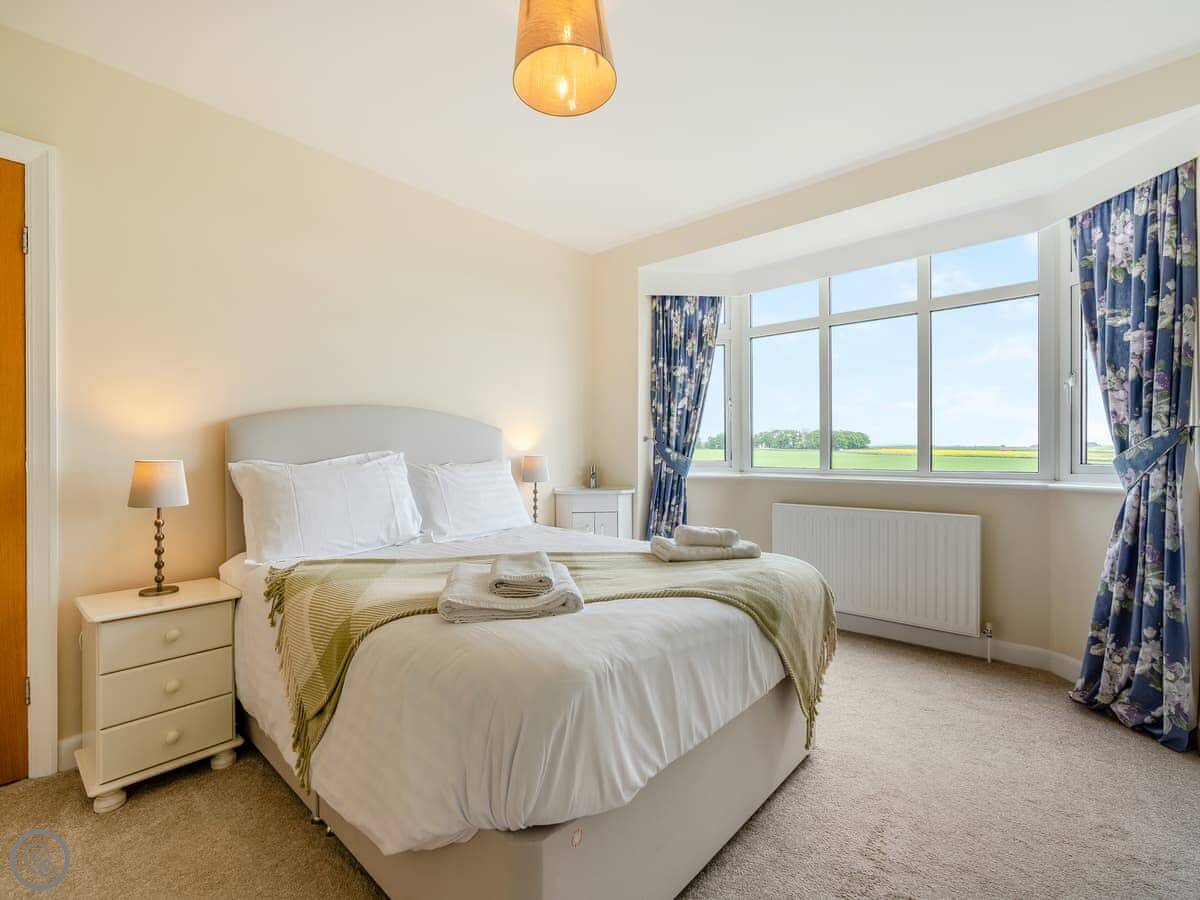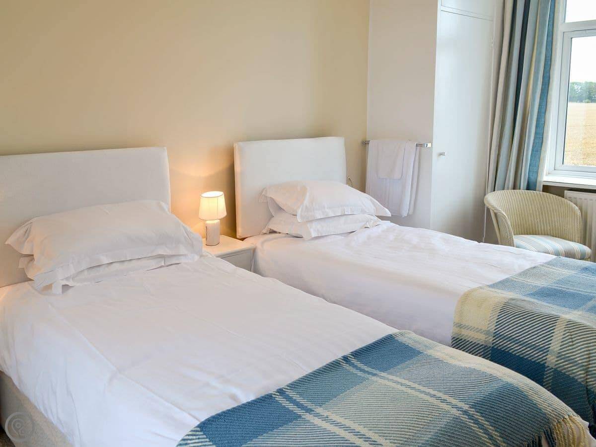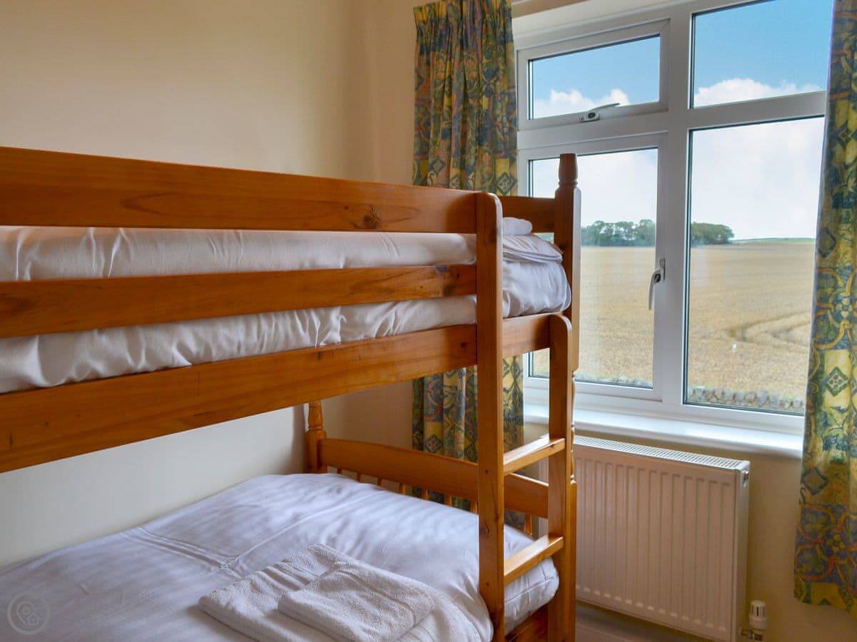 Northwinds is in Seahouses, just at the edge of town. You're on the north side. It means it's a bit quieter here, but you can walk into the harbour in about 15 minutes. The front of the house looks out over fields towards Bamburgh Castle. You can see the sea from the upstairs windows.