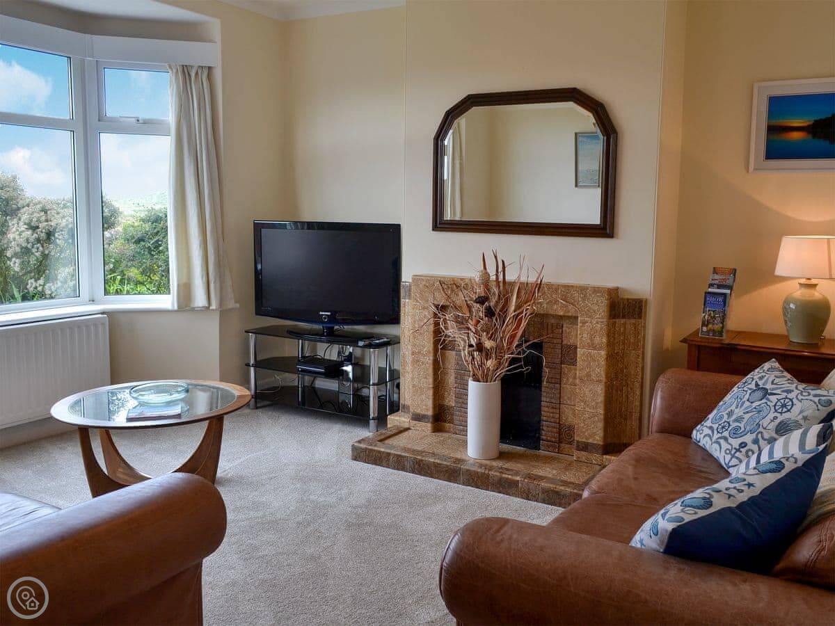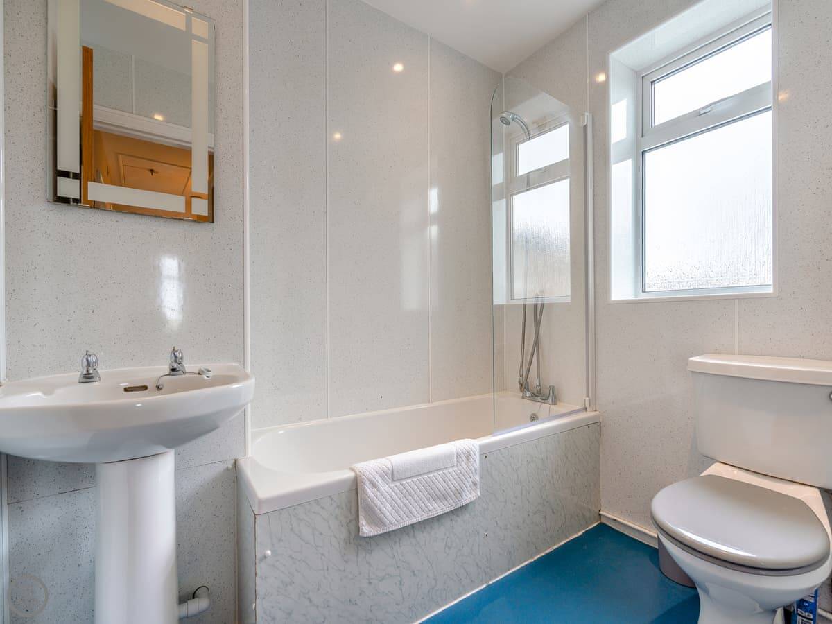 It sleeps six, in four bedrooms. There's one bathroom, upstairs with the bedrooms. It was all done up a few years ago, so it's in good order. The kitchen is fine, everything works. Downstairs there's the main living room at the front, and a smaller second room at the back with another sofa and a table. Good for kids or if someone wants a bit of quiet.