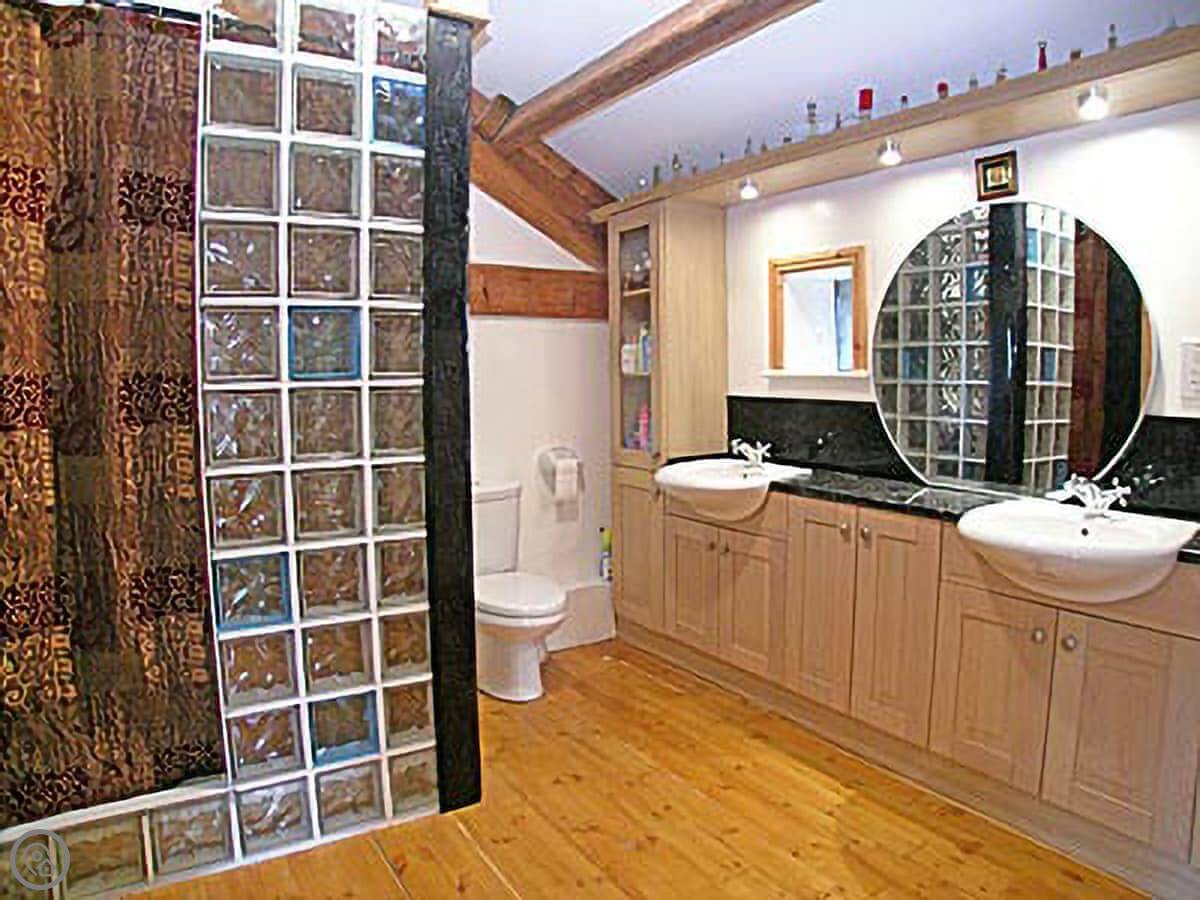 It sleeps twelve, which is a lot. Five bedrooms, four of them have their own bathroom. It's got a 4 Star rating. It's been done up with wooden floors and beams. The living space is all open plan, kitchen, dining, and sitting area. There's a big inglenook fireplace with a woodburning stove.