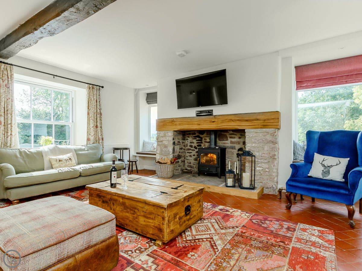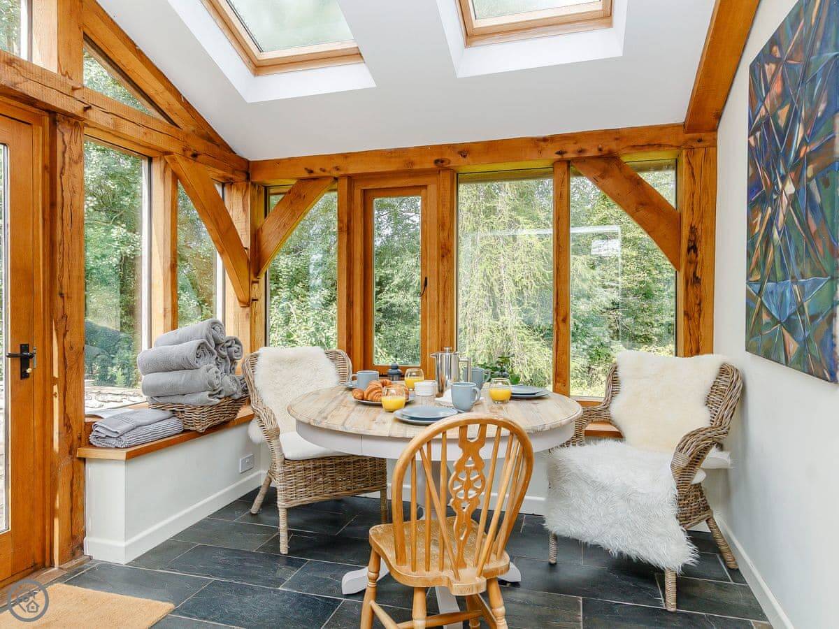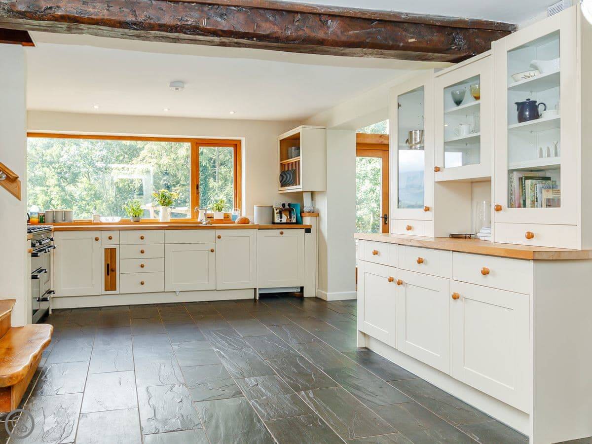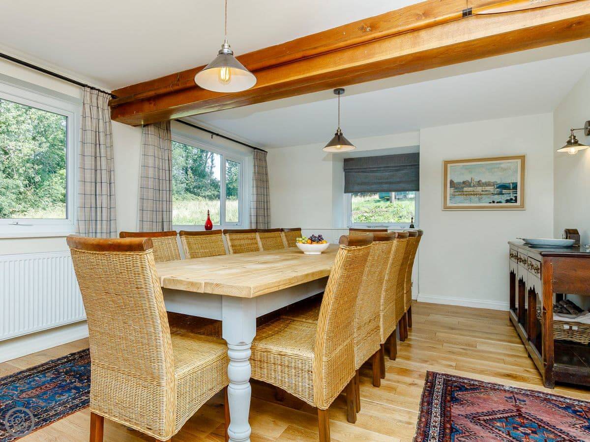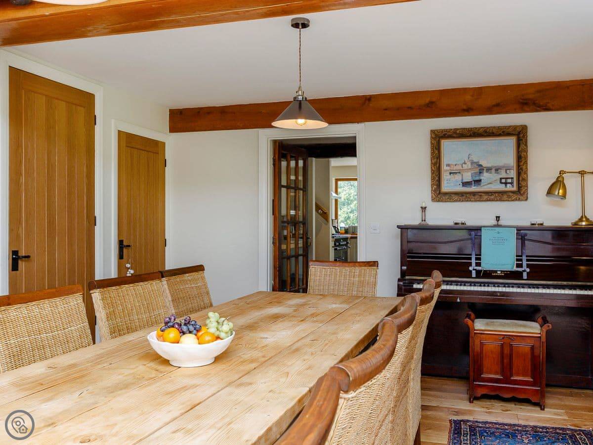The spacious kitchen is down a few steps and has a large 5-ring gas ’Rangemaster’ cooker, an American style fridge/freezer, a dishwasher, a microwave and a filter coffee machine. The kitchen, which has underfloor heating, has a sunny oak-framed breakfast nook with seating for four, with glorious views over the garden and Brecon Beacons. It’s the perfect place to enjoy a cup of tea or coffee whilst reading the papers. The convenient utility room leading off the kitchen has a washing machine, a tumble dryer and plenty of room for muddy coats and boots. There is also a shower room with an electric shower, which is the ideal place to wash down muddy children! The formal dining room, adjoining the kitchen, has an impressive 3-metre long farmhouse dining table with seating for twelve people.