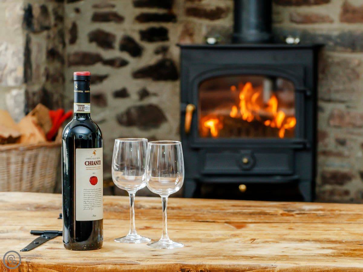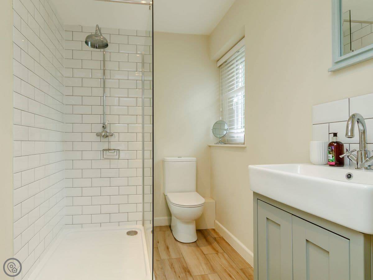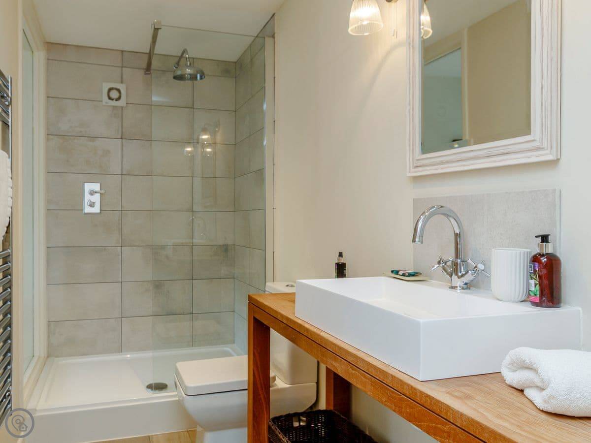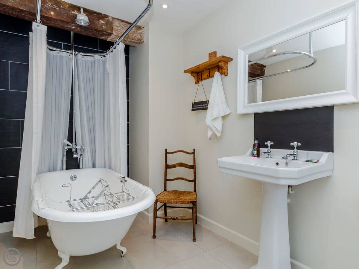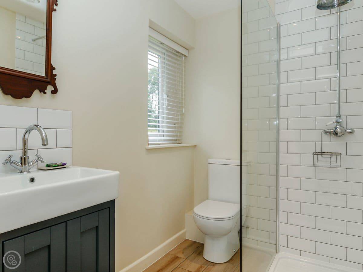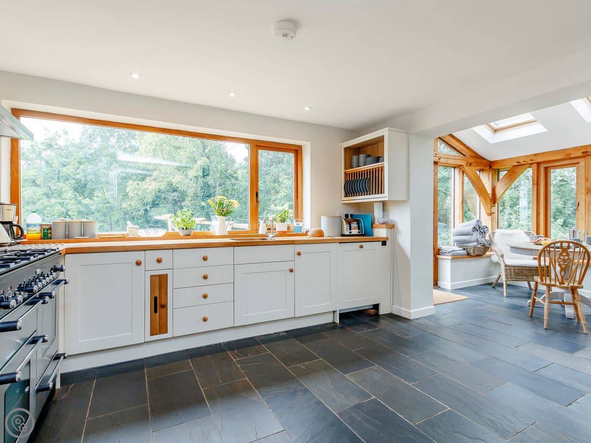 The spacious kitchen is down a few steps and has a large 5-ring gas ’Rangemaster’ cooker, an American style fridge/freezer, a dishwasher, a microwave and a filter coffee machine. The kitchen, which has underfloor heating, has a sunny oak-framed breakfast nook with seating for four, with glorious views over the garden and Brecon Beacons. It’s the perfect place to enjoy a cup of tea or coffee whilst reading the papers. The convenient utility room leading off the kitchen has a washing machine, a tumble dryer and plenty of room for muddy coats and boots. There is also a shower room with an electric shower, which is the ideal place to wash down muddy children! The formal dining room, adjoining the kitchen, has an impressive 3-metre long farmhouse dining table with seating for twelve people.