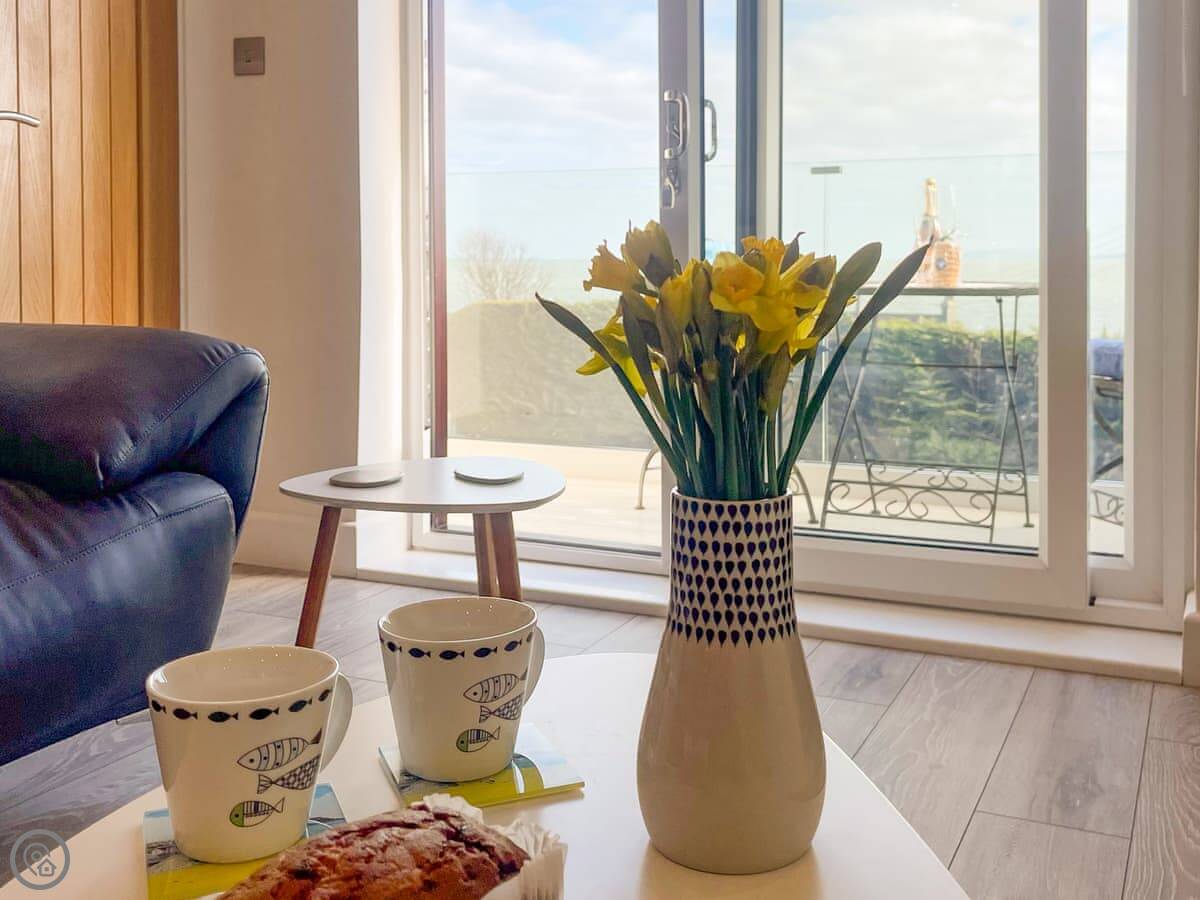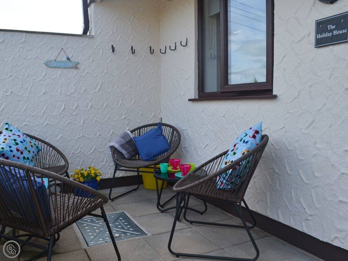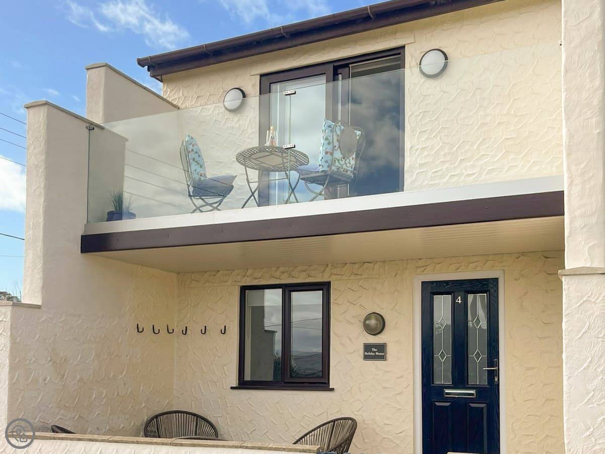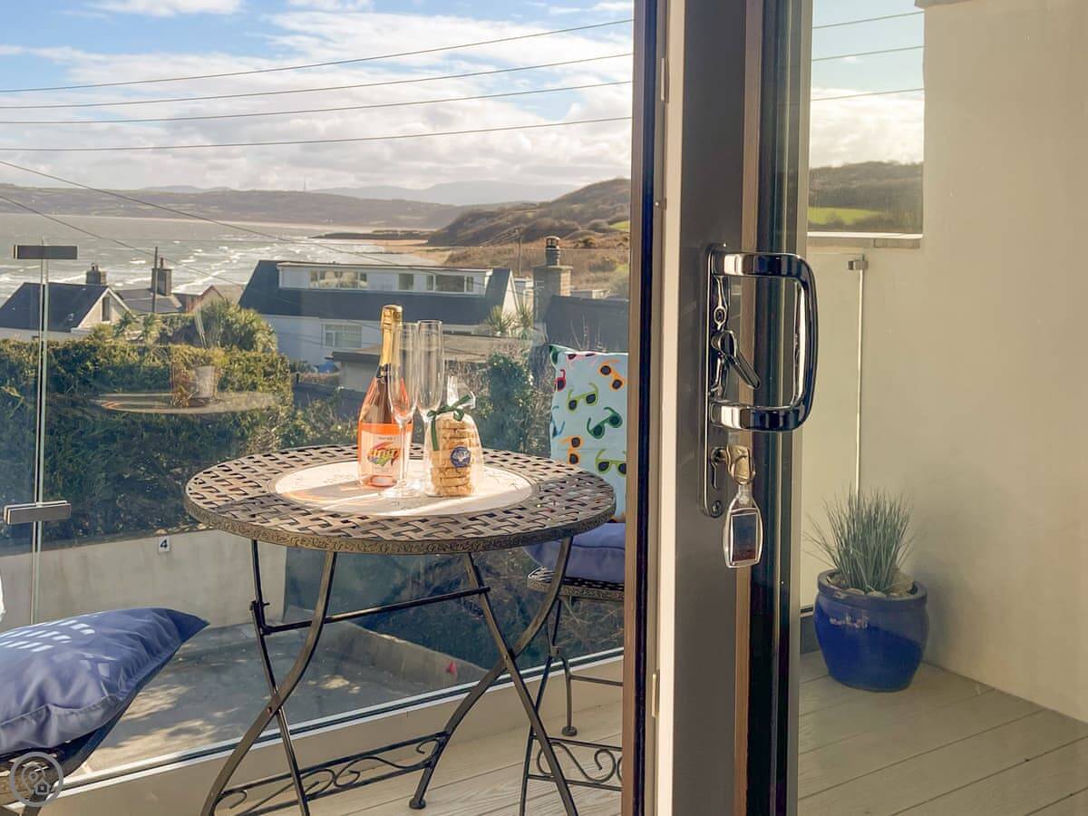 The Holiday House is in Benllech on the east coast of Anglesey. It's what they call an upside-down house. That means the living area and kitchen are upstairs, so you get the views from up there. There's a private balcony off the living room. You look out over the bay.