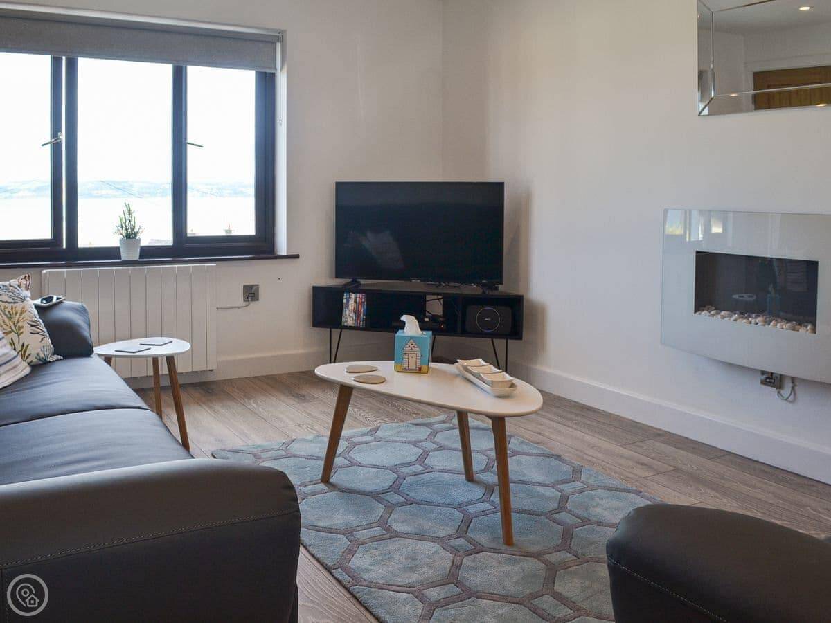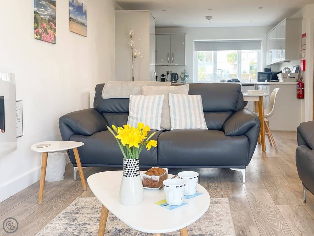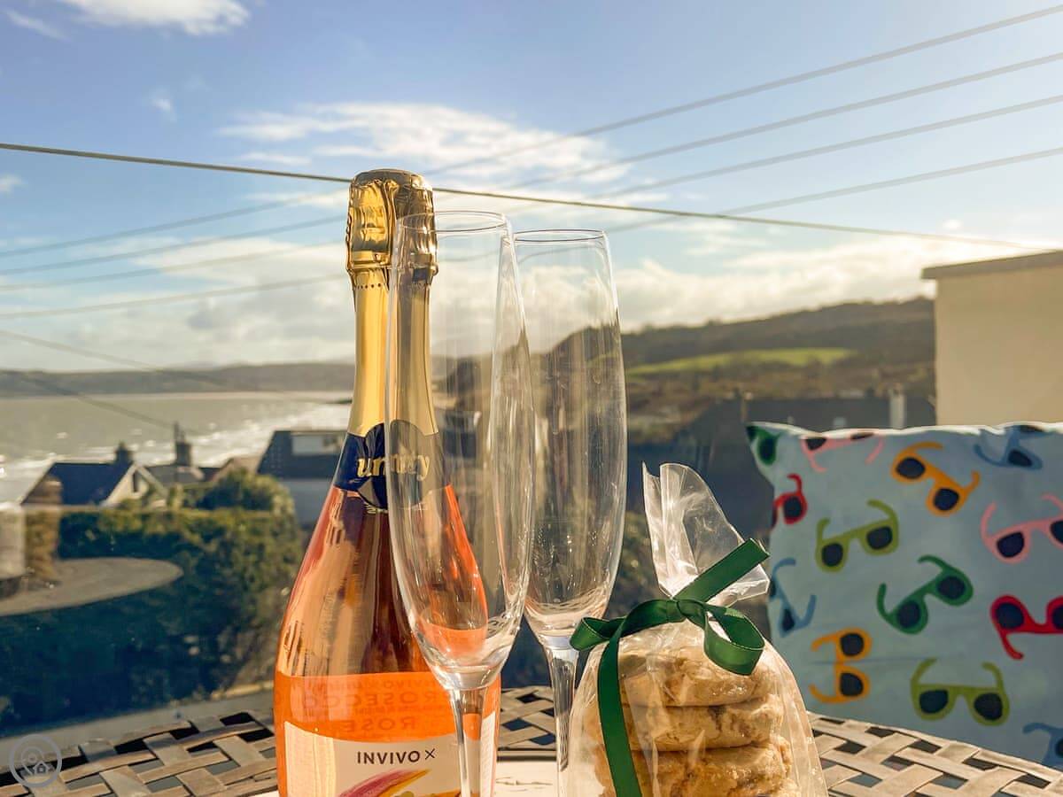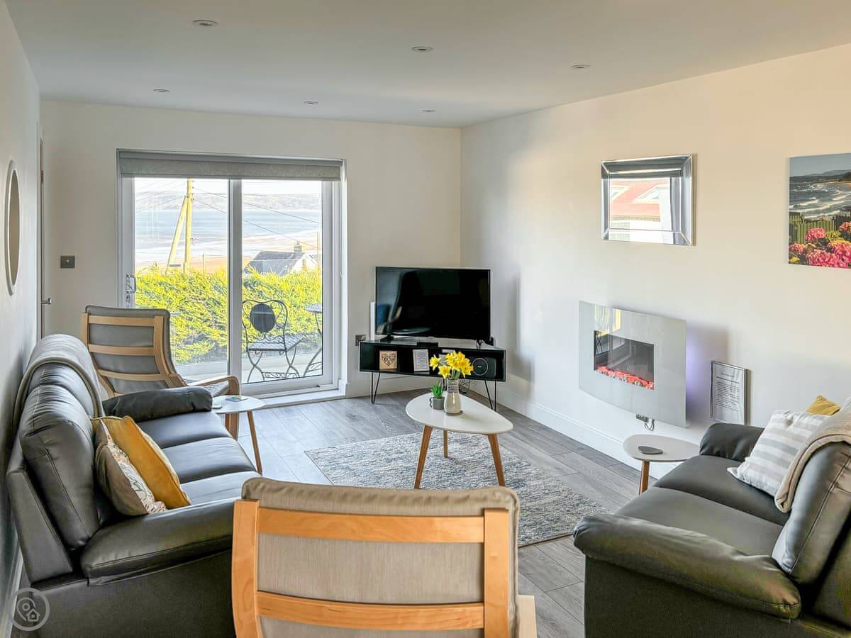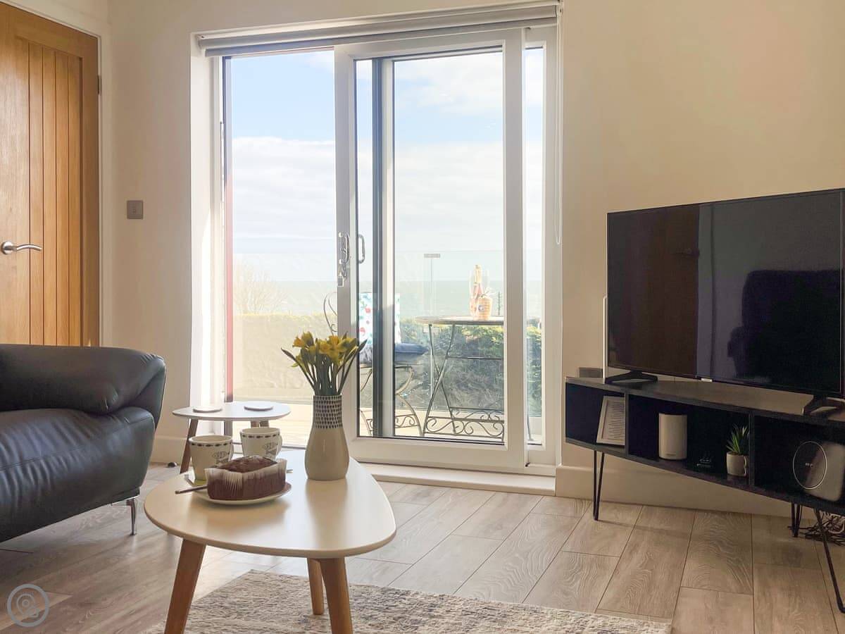 The Holiday House is in Benllech on the east coast of Anglesey. It's what they call an upside-down house. That means the living area and kitchen are upstairs, so you get the views from up there. There's a private balcony off the living room. You look out over the bay.