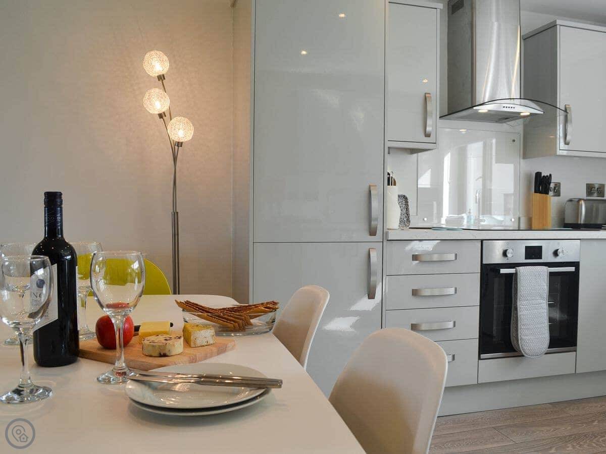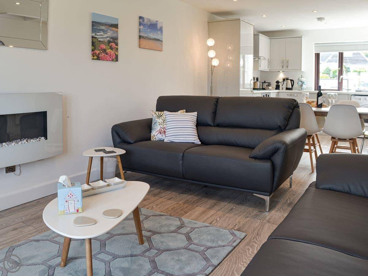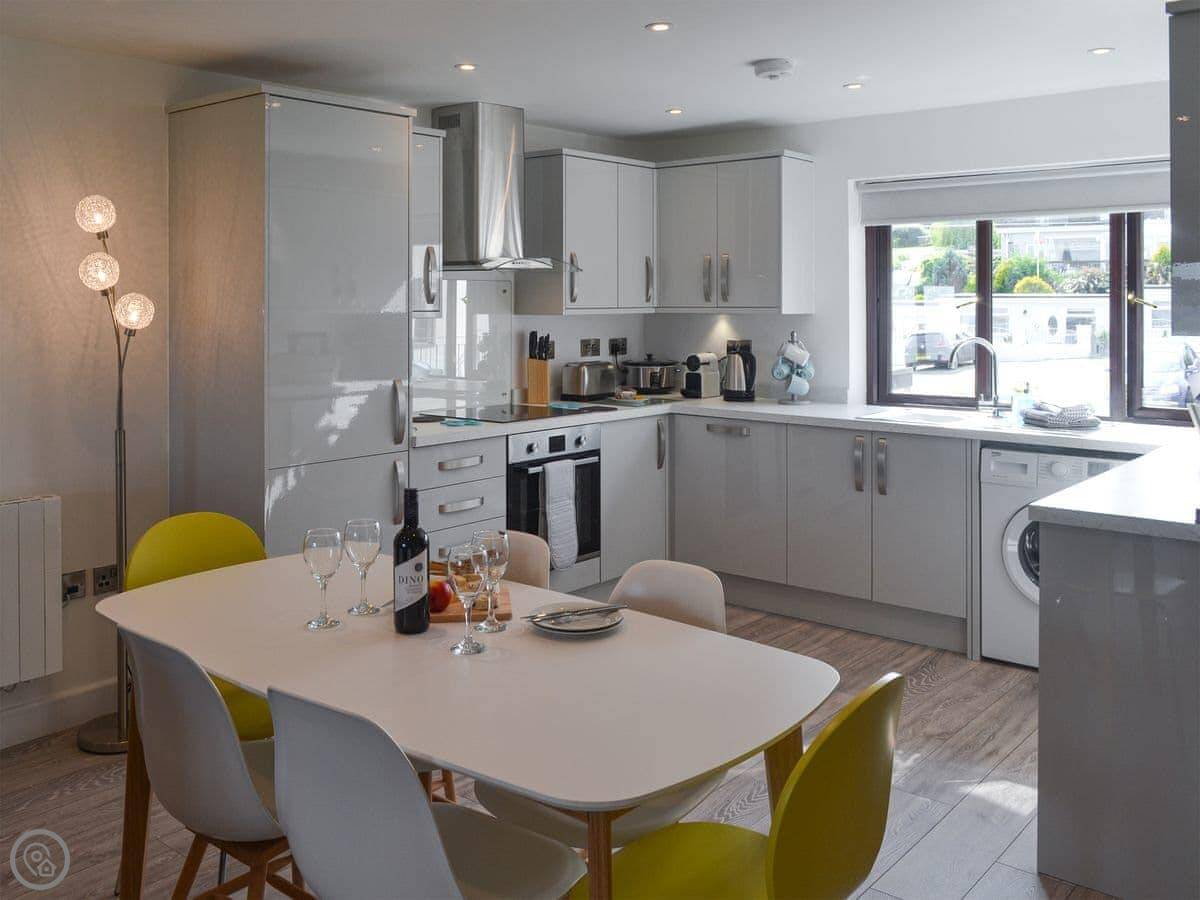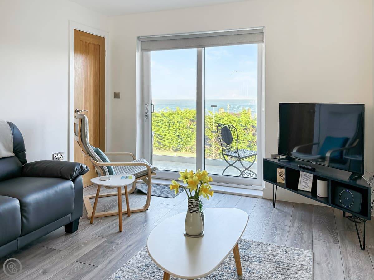The Holiday House is in Benllech on the east coast of Anglesey. It's what they call an upside-down house. That means the living area and kitchen are upstairs, so you get the views from up there. There's a private balcony off the living room. You look out over the bay.