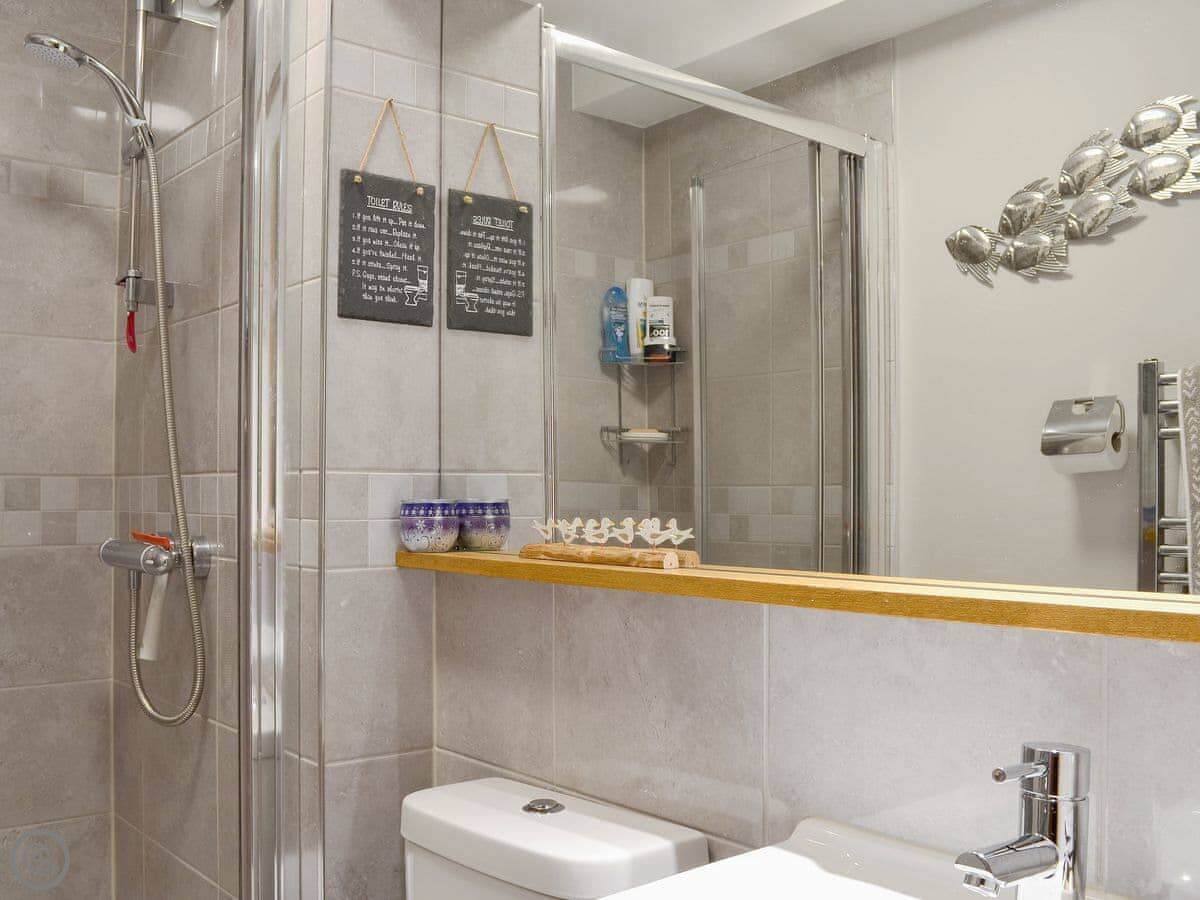 Inside, it's a 4 Star place. That means it's comfortable and well looked after. The bed is a kingsize. The shower is good. There's a corner sofa in the living room, and the kitchen has a dishwasher. You get WiFi and parking.