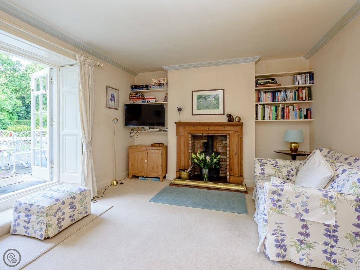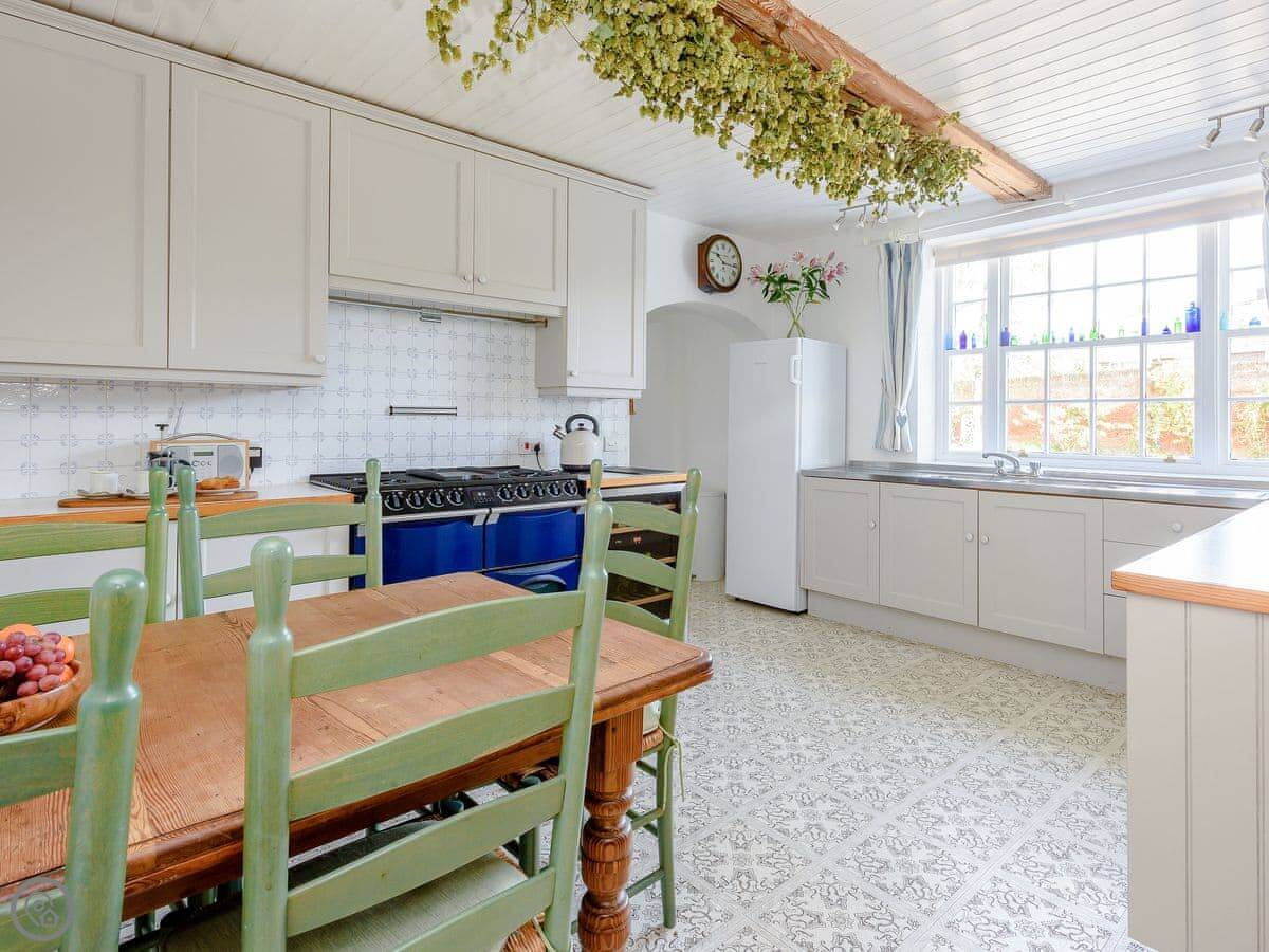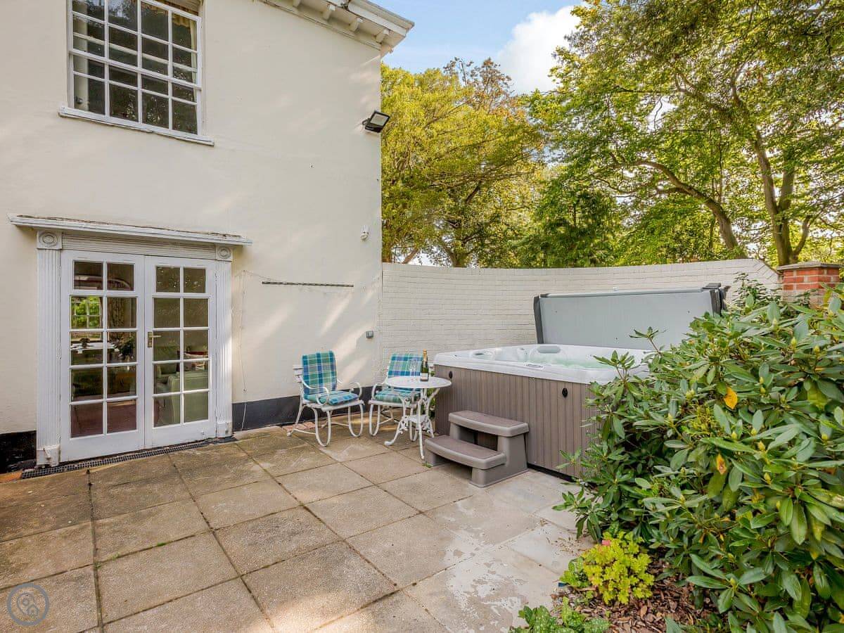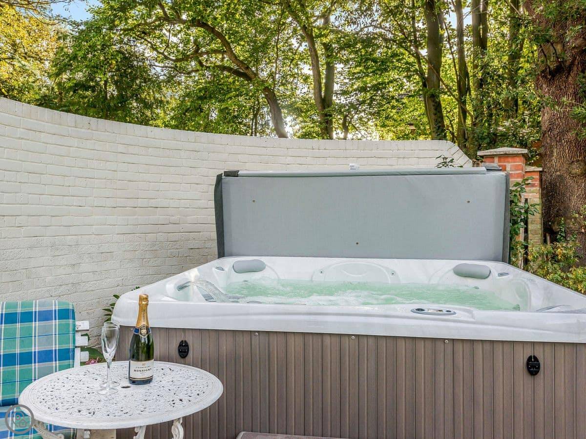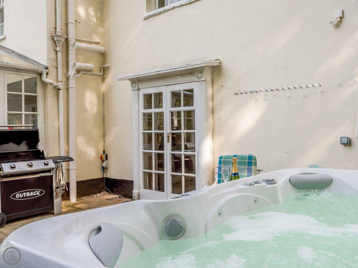 The garden wraps around the house. It's fully enclosed and landscaped. There's a hot tub out there. Inside, there's a woodburning stove, a formal dining room, and a kitchen with a breakfast table.