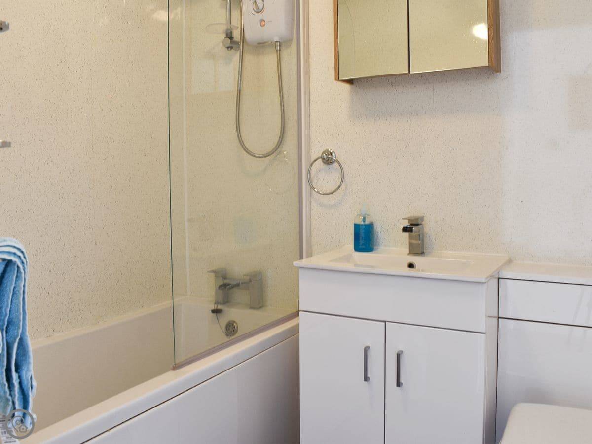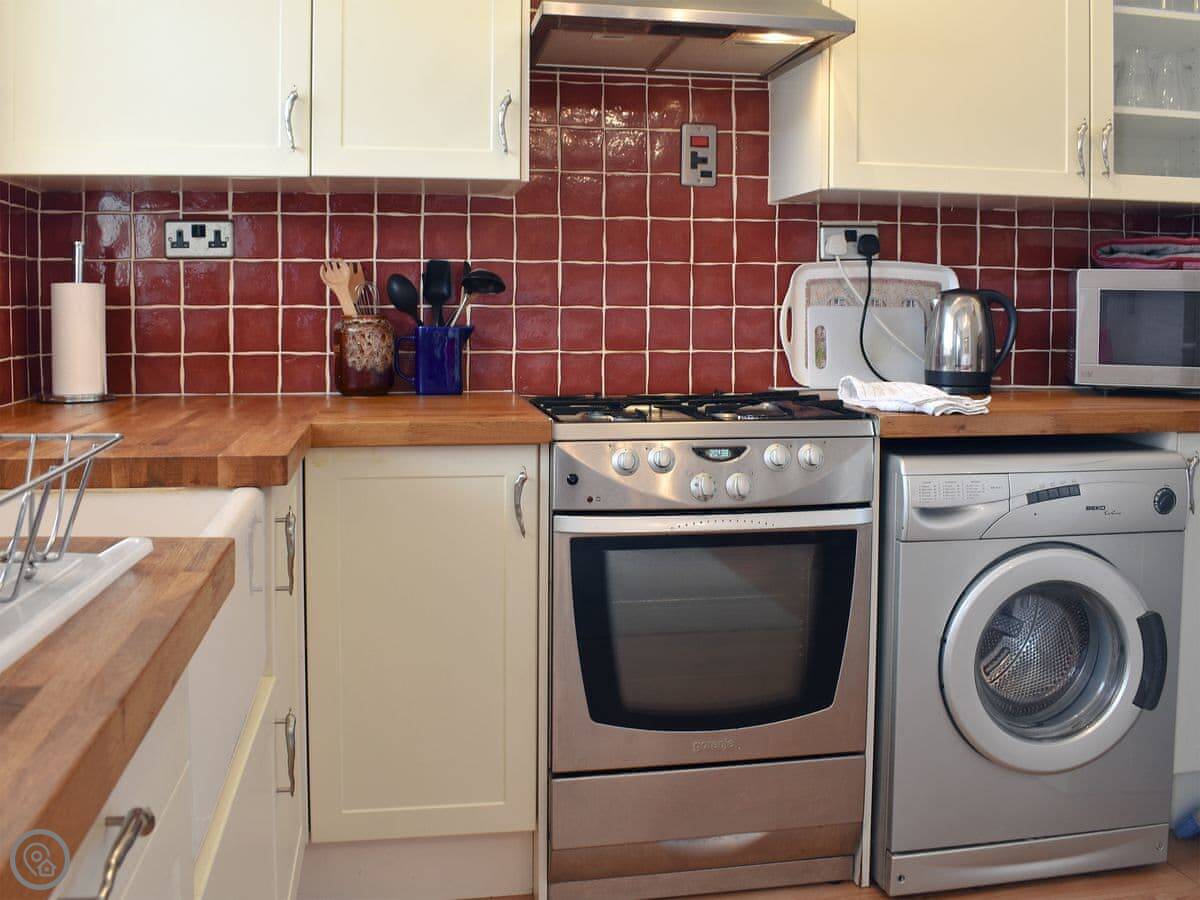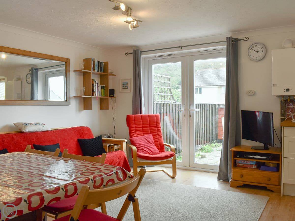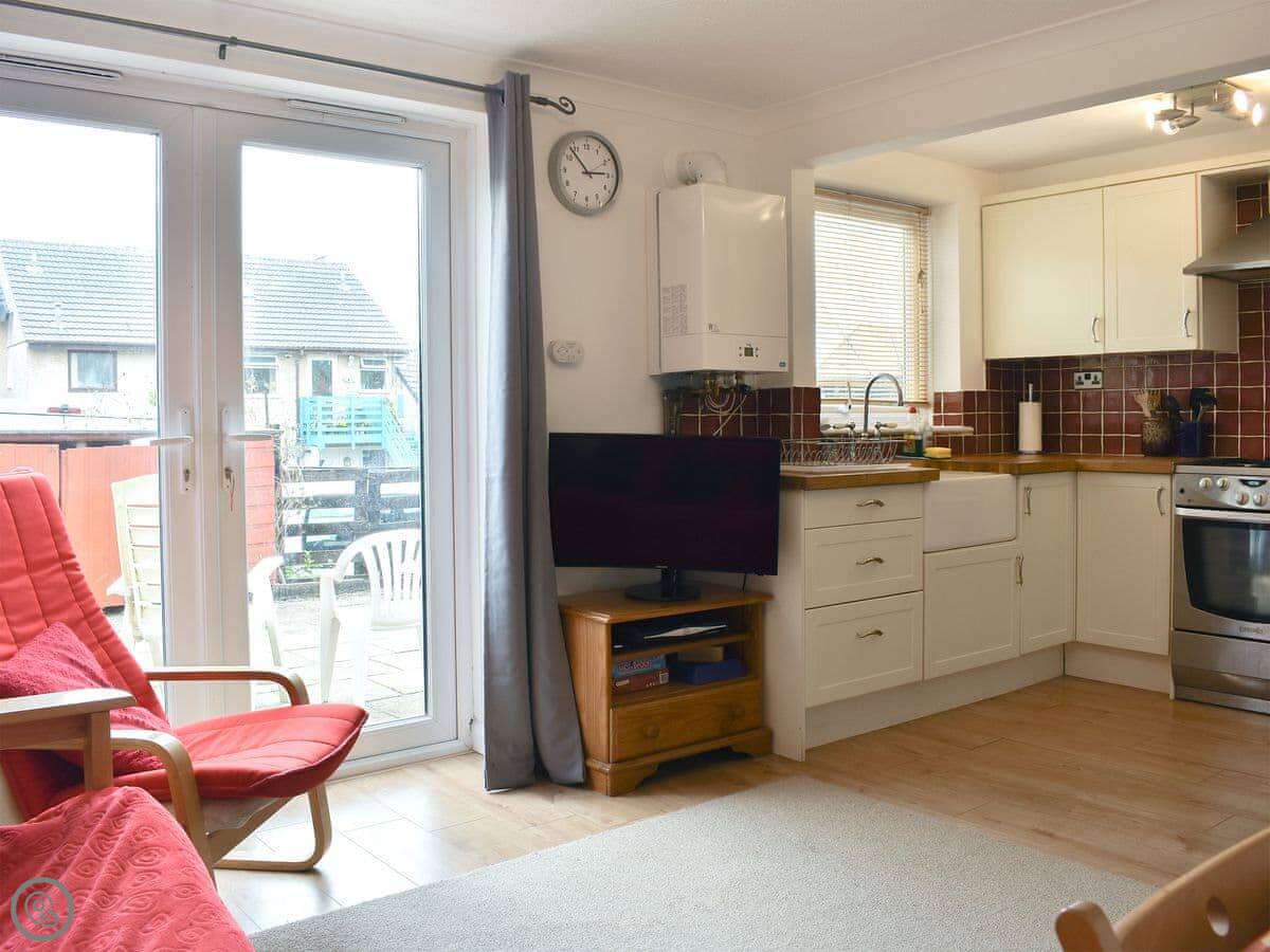Inside, it's all open plan living, kitchen and dining area. There's a TV, wifi, a washing machine, and a cot and highchair if you need them. All the bedding and towels are included.