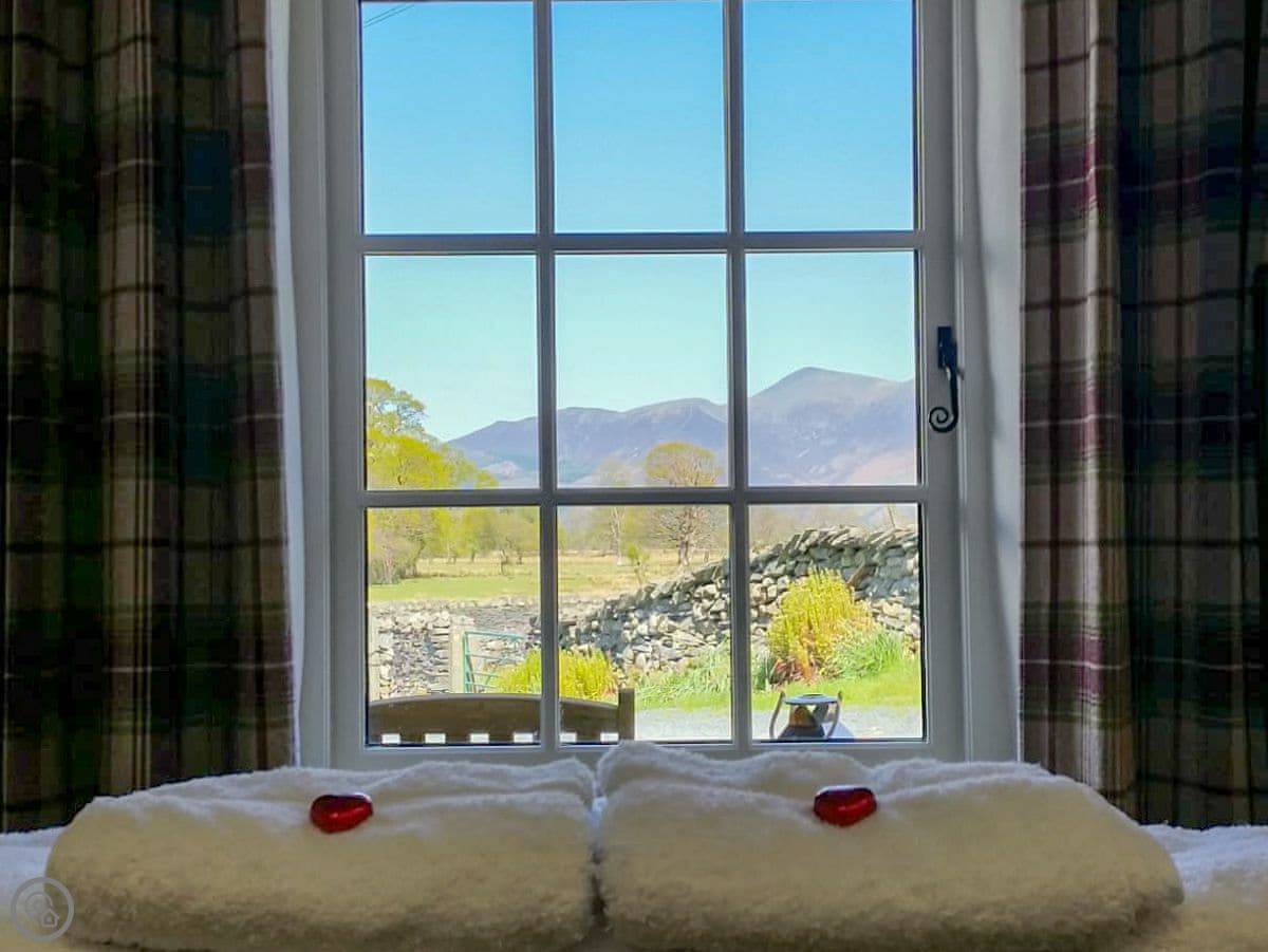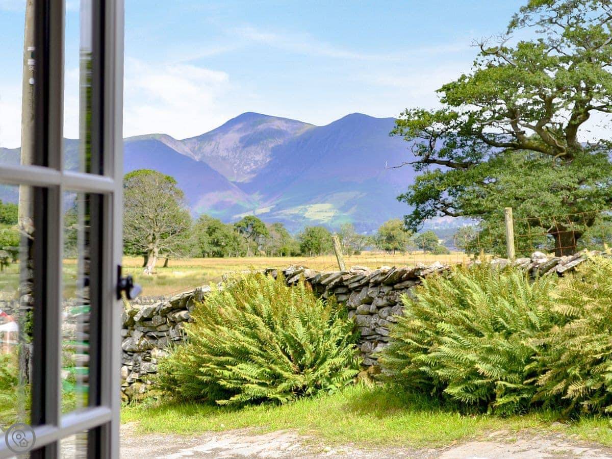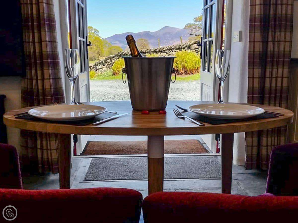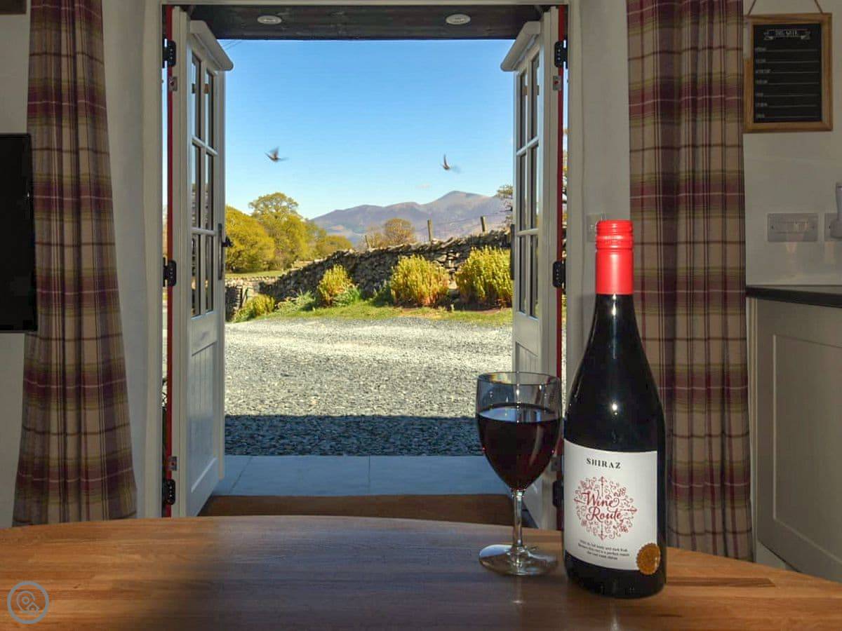 The space is all open-plan. You walk in and everything's there: the kitchen area, a sitting area, and the bed. The main thing is the view. The big doors look straight down the valley towards Derwent Water and Cat Bells. You can sit with a cup of tea and just look at it.
