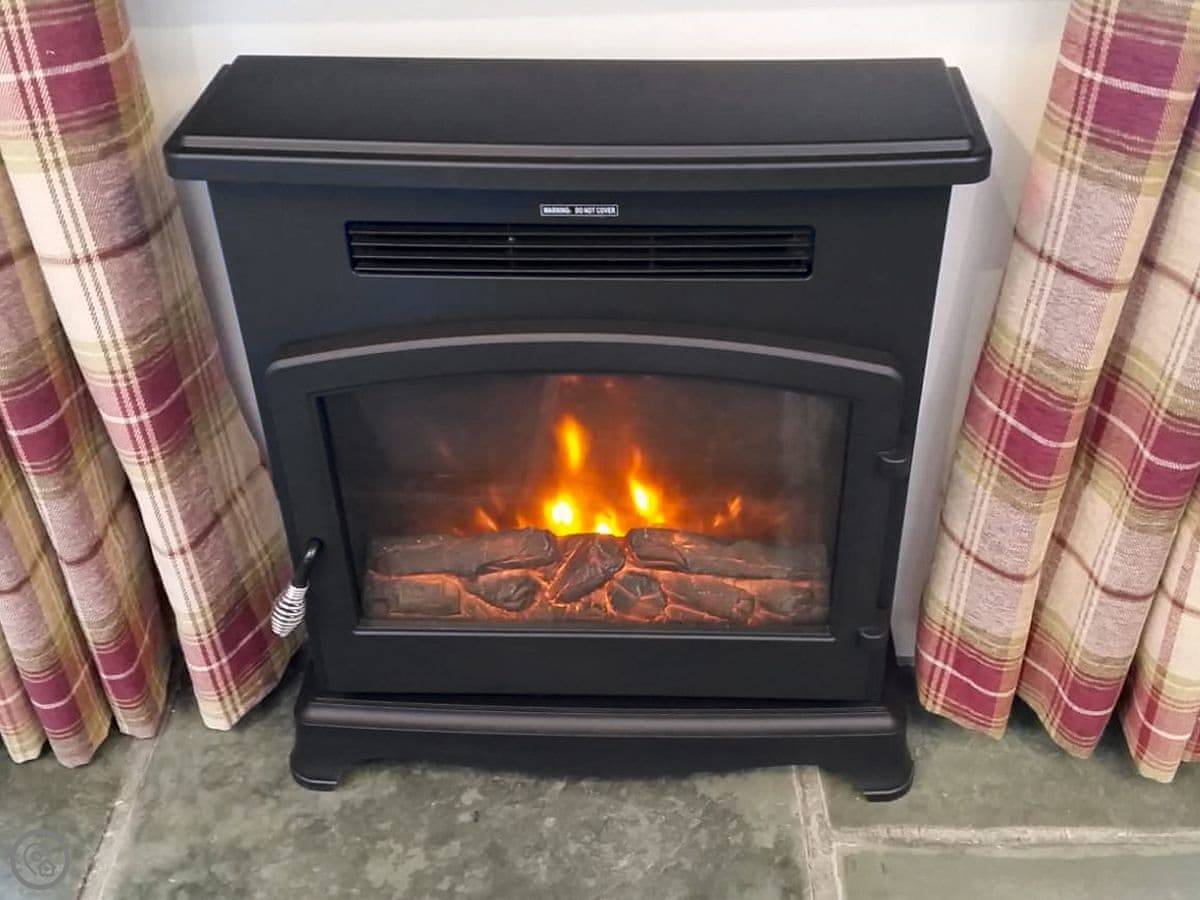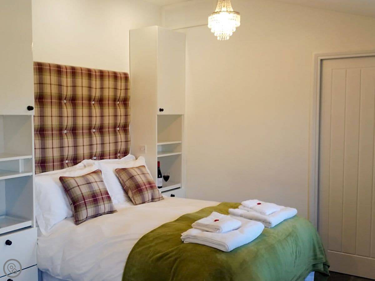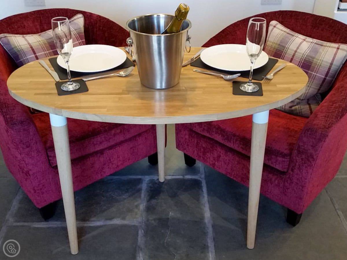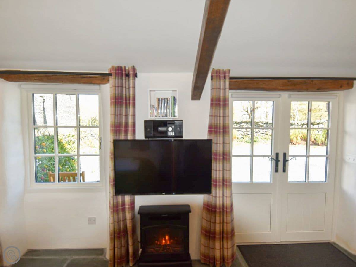 Outside, there’s a small patio area with a table and a BBQ. It’s yours to use. The setting is quiet, just fields and the crags behind.