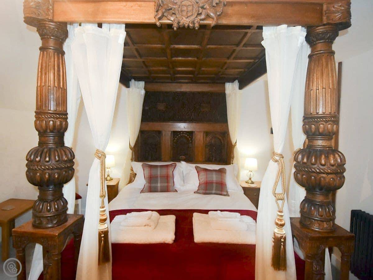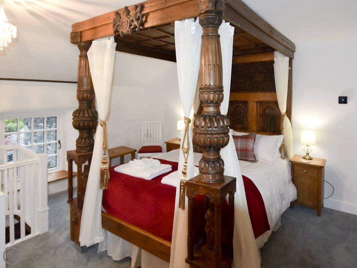 Inside, it's open plan. There's a wood burner, which is nice in the evenings. The bed is a four-poster, and it faces the window so you wake up looking at the fells. The shower is good and powerful.