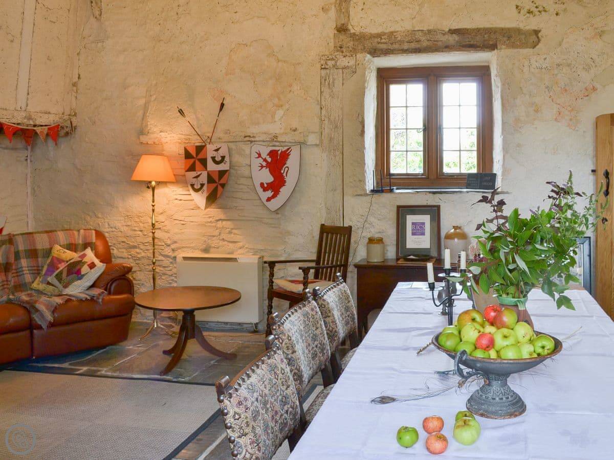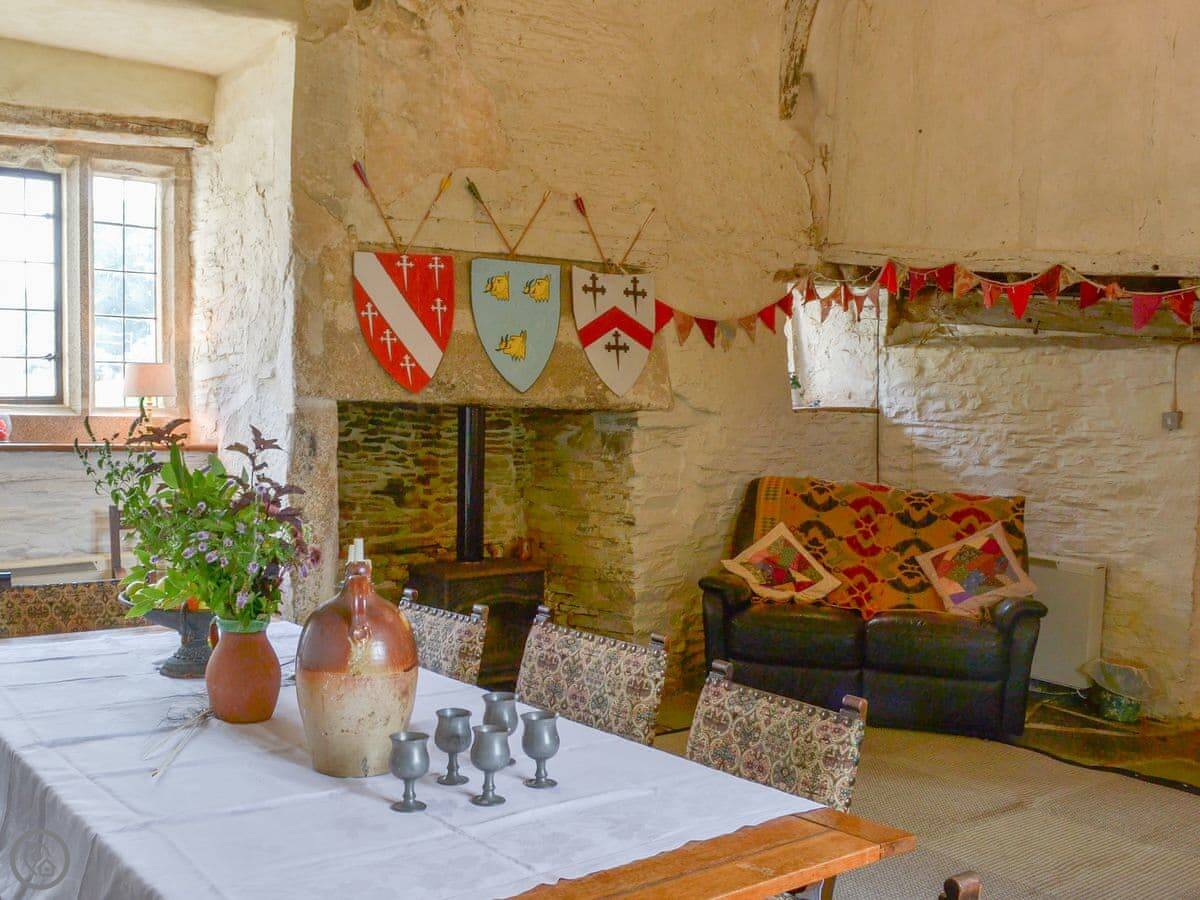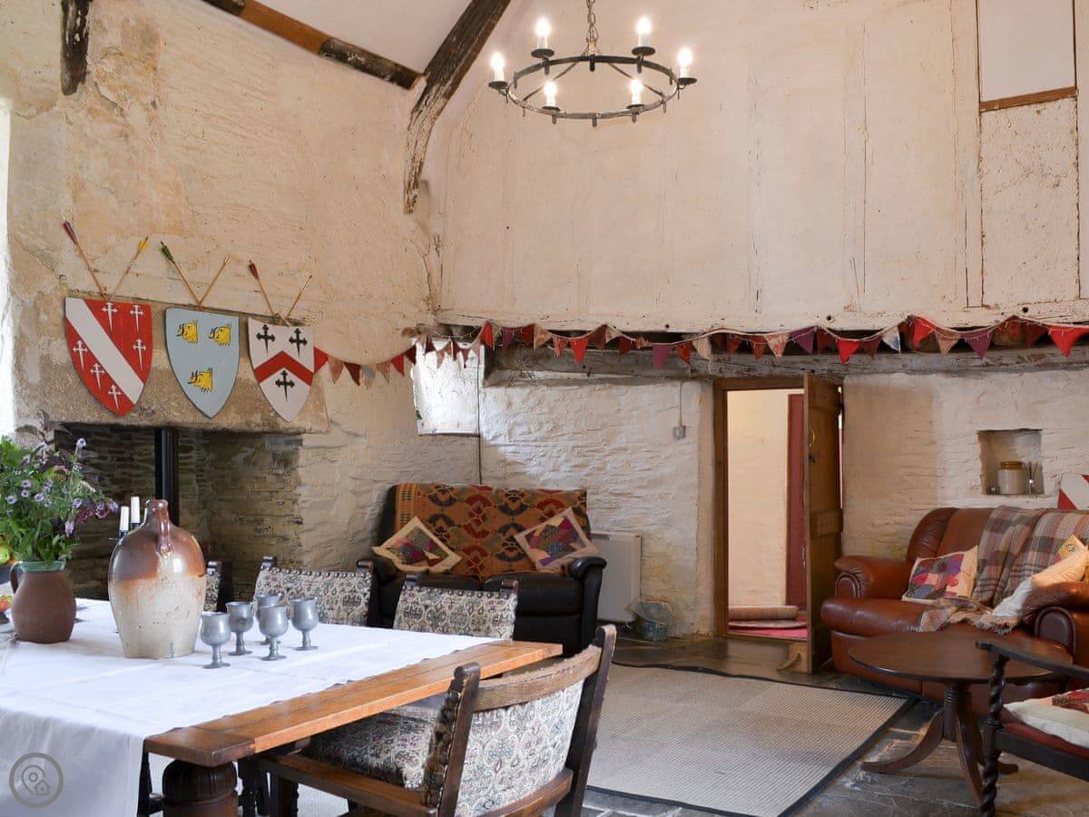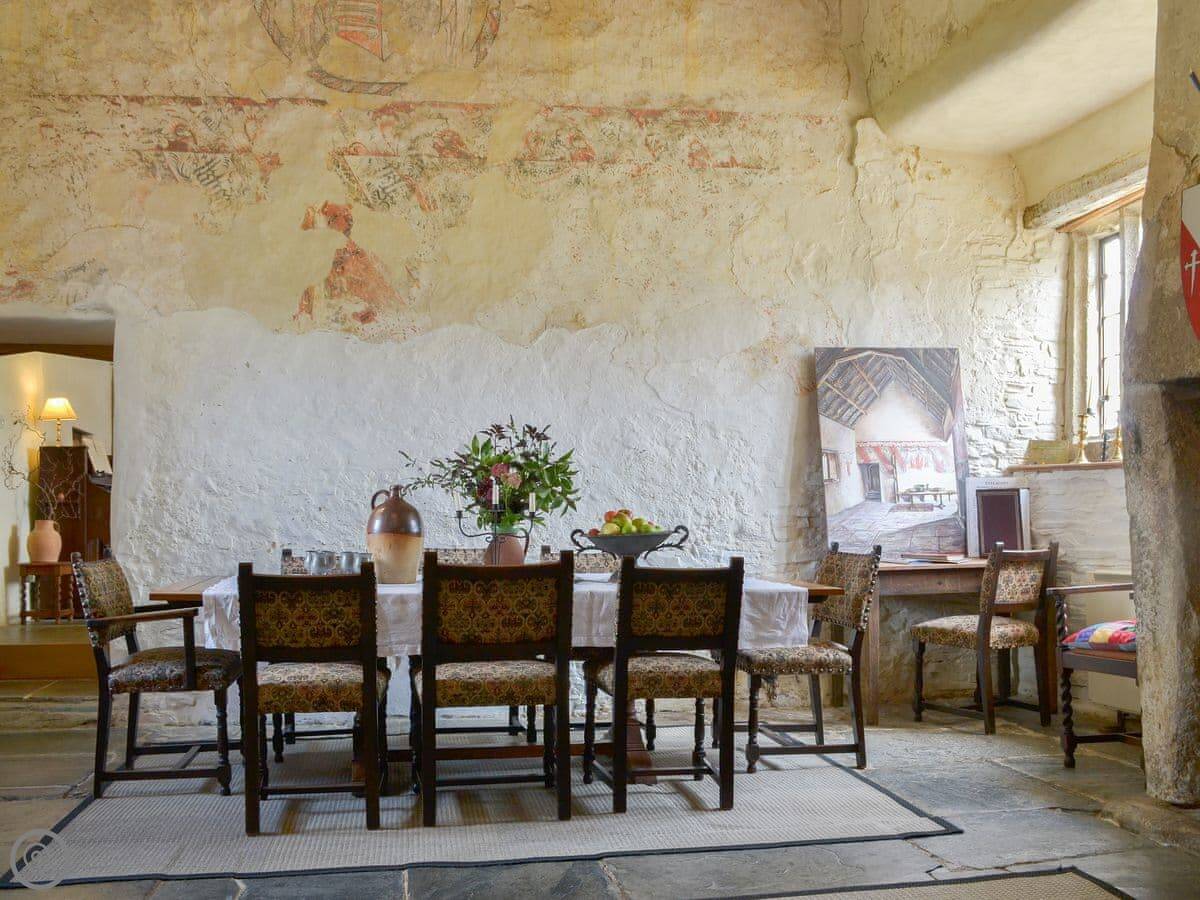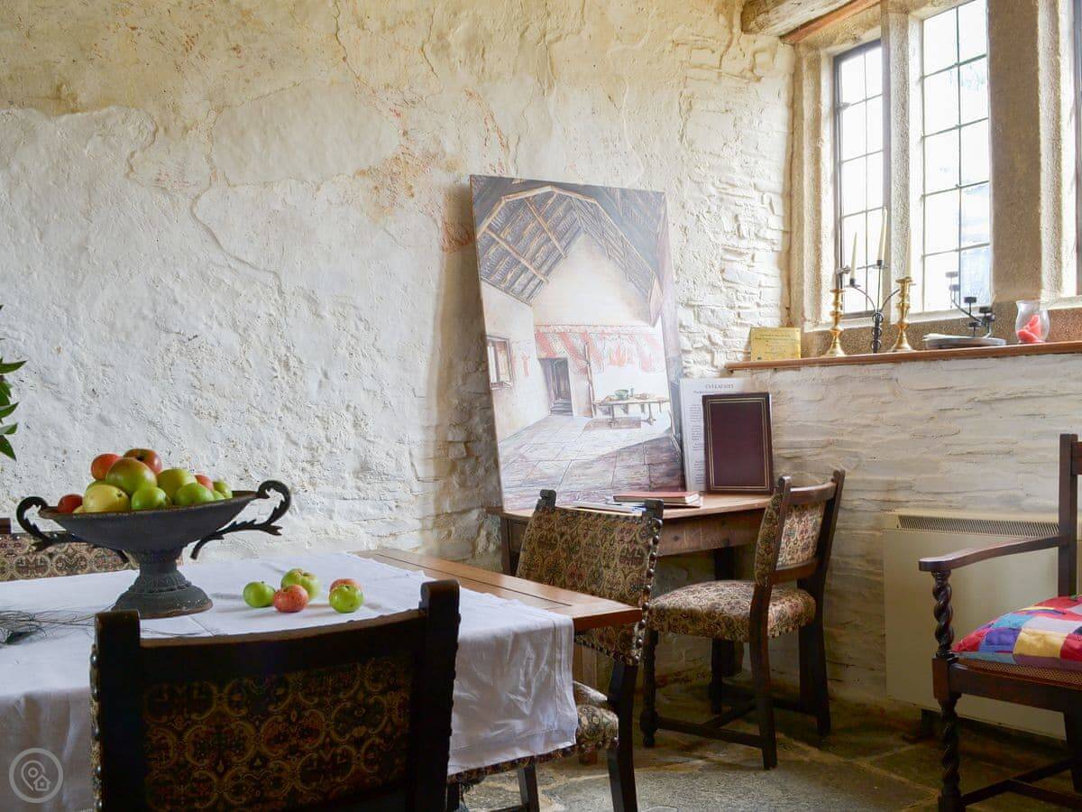 Cullacott Farm is a Grade I listed medieval hall house, truly one of the most extraordinary vernacular medieval properties in the whole of Cornwall. It is built of stone and cob with exposed walls, some showing remains of original wall murals dating back to the 1500s. The restoration of the property won the Royal Institute of Chartered Surveyors National Building Conservation Award in 1997. The Longhouse dates back to the 14th century whilst the Tudor Wing was updated in the 16th century. Some parts of the building have remained largely unaltered for 500 years. The main feature of The Longhouse is the Great Hall, on the roughly plastered wall are remains of a beautifully painted fictive tapestry depicting diagonal bands of writing within an ornate pattern. Above it in clear definition is the coat of arms of Henry VII/Henry VIII. On another wall is a figure thought to be St. James of Compostella. Two staircases lead to the first floor where one can view the remains of a painted mural of St. George on his horse fighting the dragon. From a viewing opening in the George and the Dragon room one can look into the Great Hall.