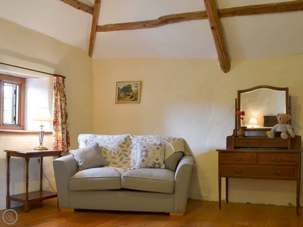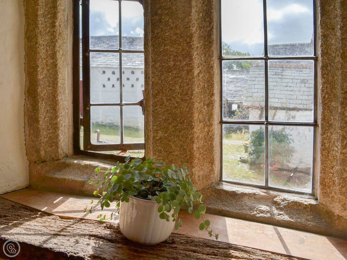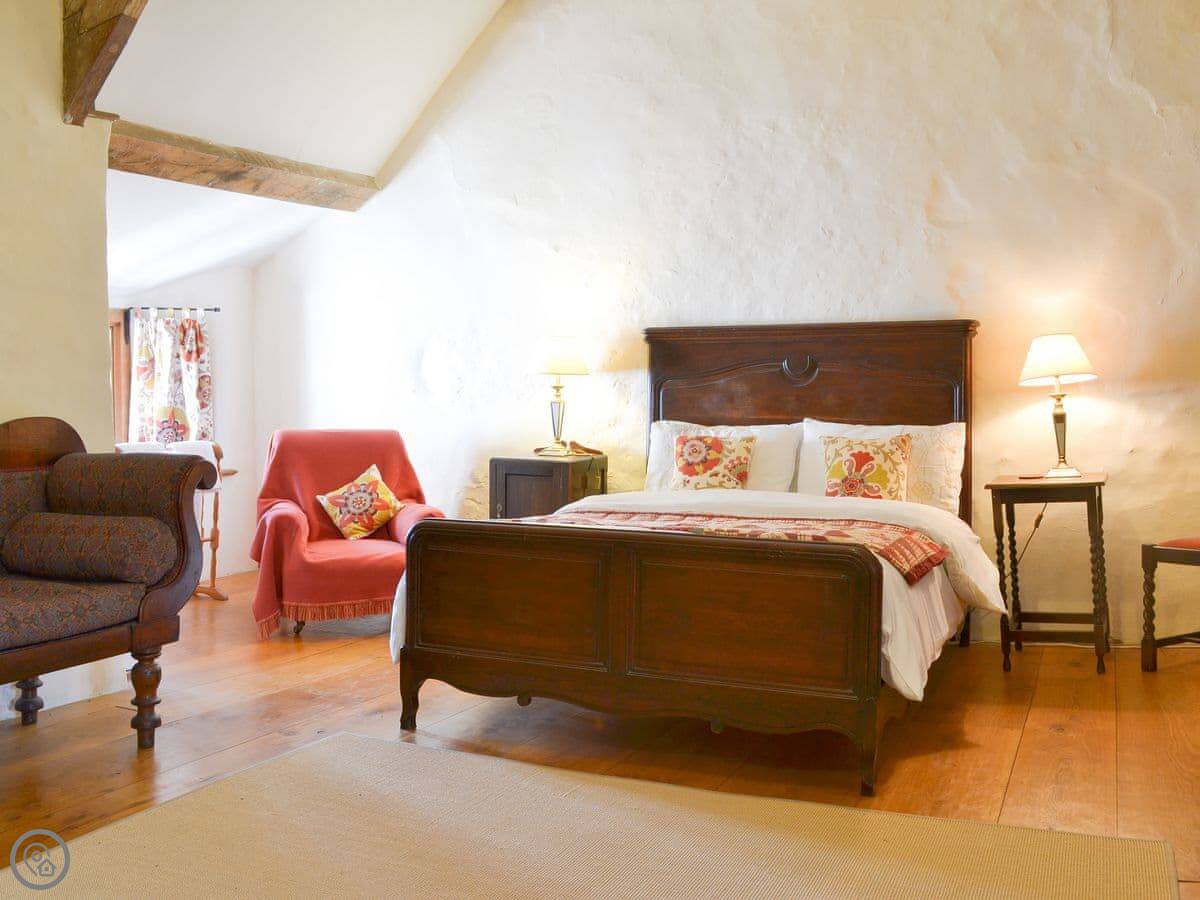 The Tudor Wing adjoins The Longhouse and is just as rich in history and character. It has granite mullion windows and a slate spiral turret staircase leading up to the first floor. The twin bedroom features a 15th-century ‘lavvy’, a state-of-the-art garderobe in its day, which is tucked behind a tiny door in the corner, but there is also a modern en-suite pod in the room. Many a medieval banquet with merrymaking has been partaken of here over the centuries.