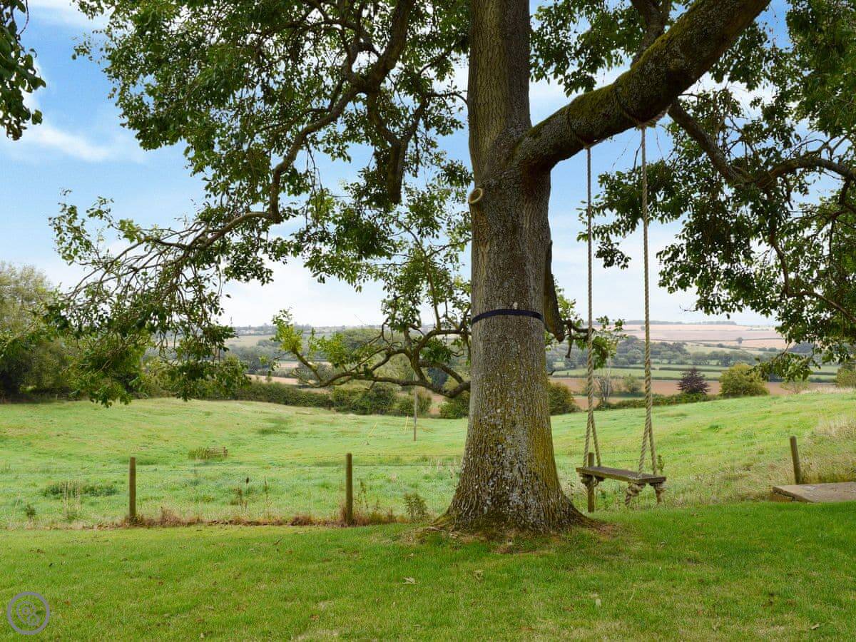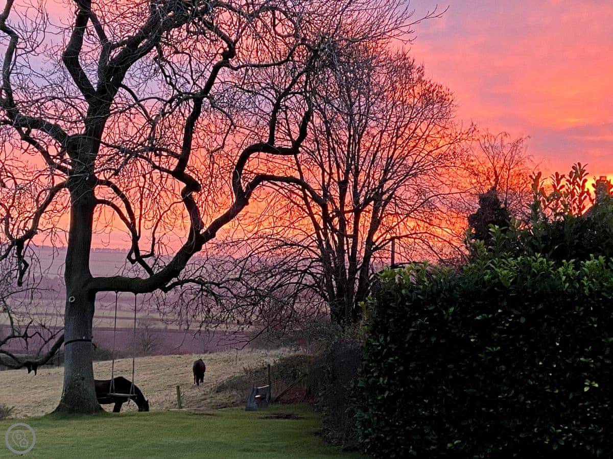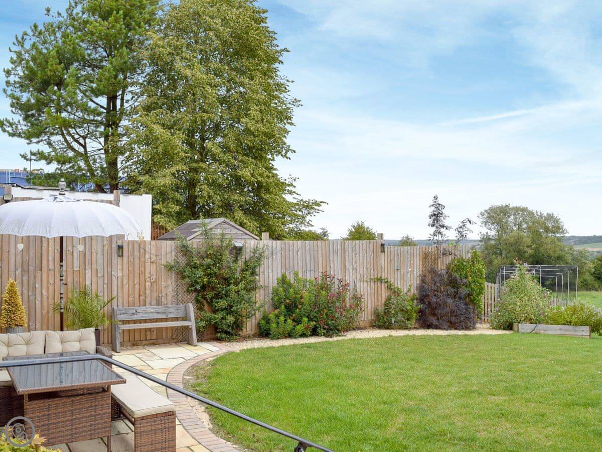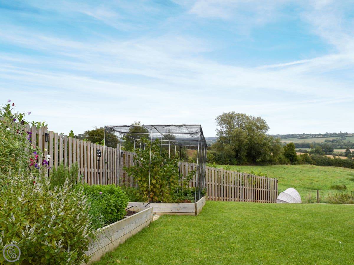 The living room is big with windows at both ends. It looks out over the fields at the back. The kitchen door goes straight out into the garden. The garden is enclosed, which is good for dogs and kids. There’s a bit of a hidden seating area at the bottom, past the lawn.