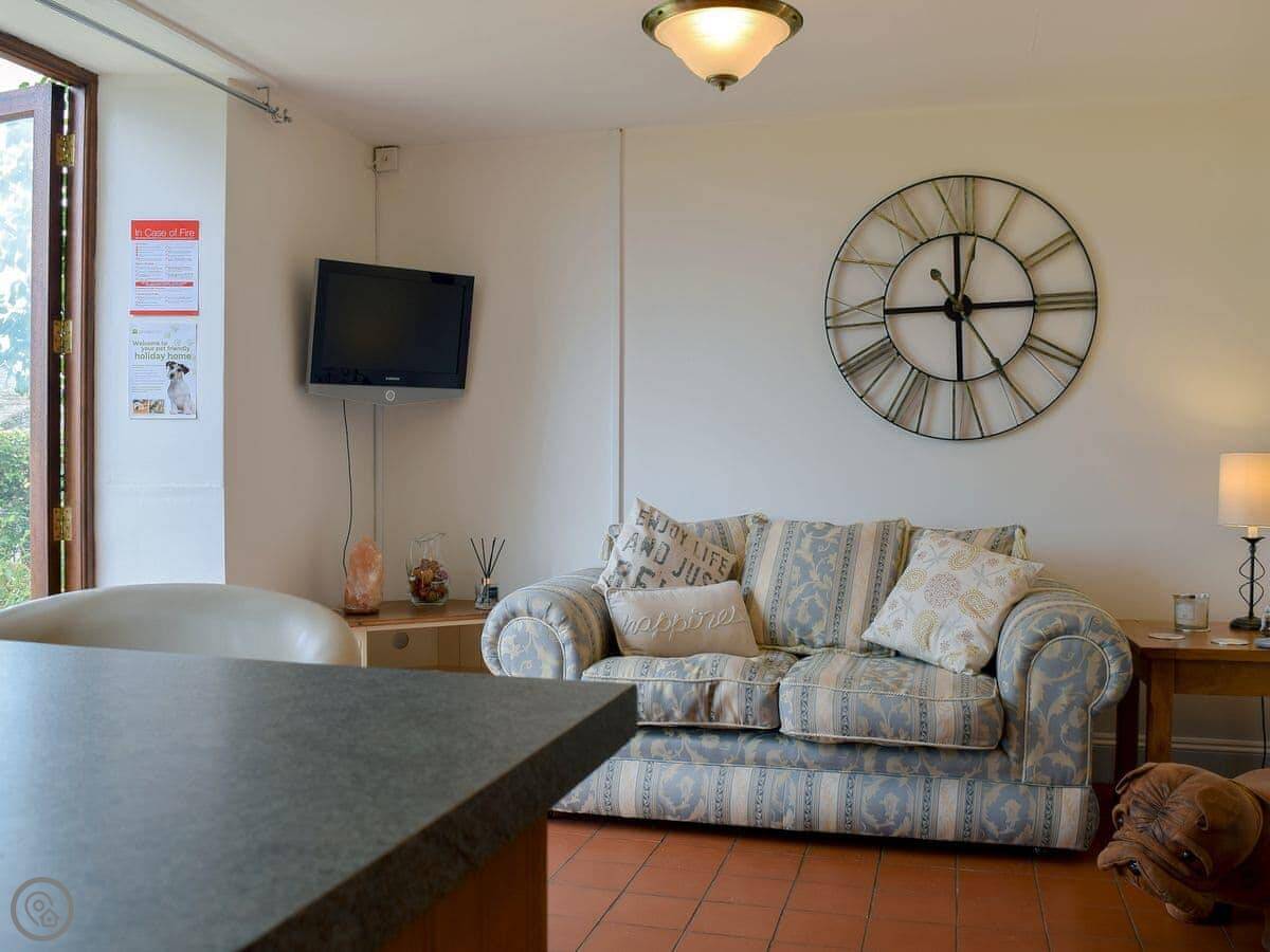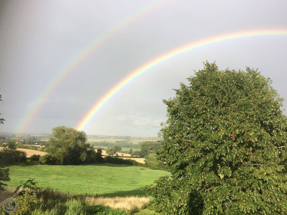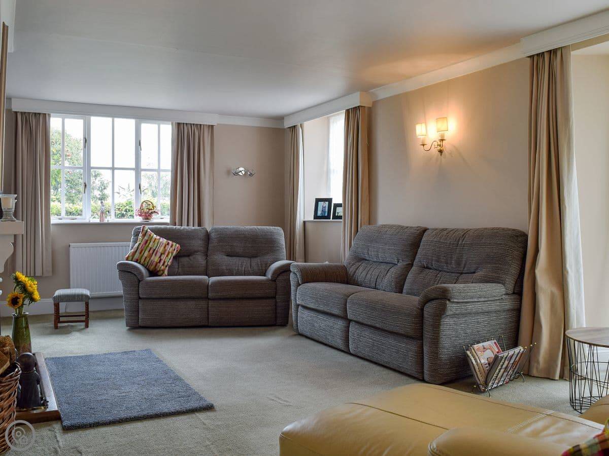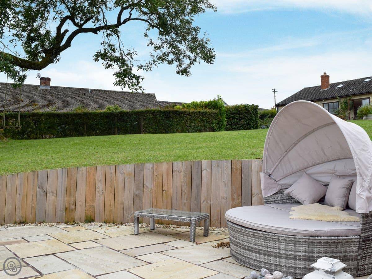 The living room is big with windows at both ends. It looks out over the fields at the back. The kitchen door goes straight out into the garden. The garden is enclosed, which is good for dogs and kids. There’s a bit of a hidden seating area at the bottom, past the lawn.