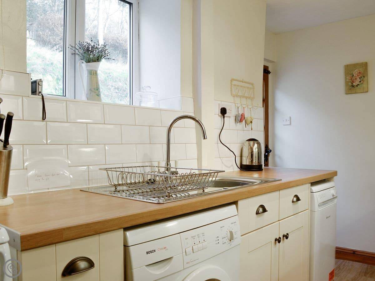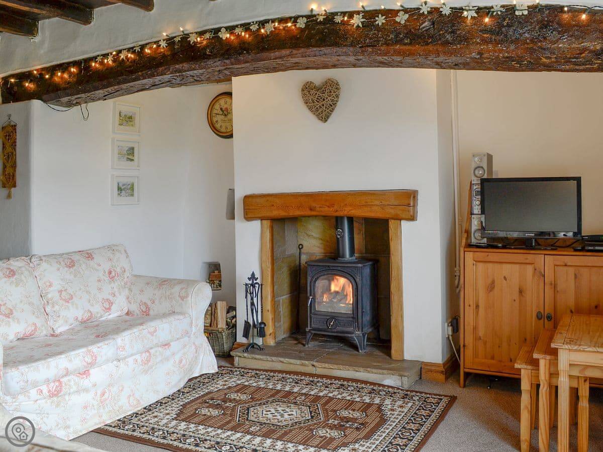 Downstairs is open plan, living room and dining area. We had it refurbished a few years ago. There's a wood burner. The kitchen is through an archway, it's fine for cooking holiday meals. The main bathroom is down there too.