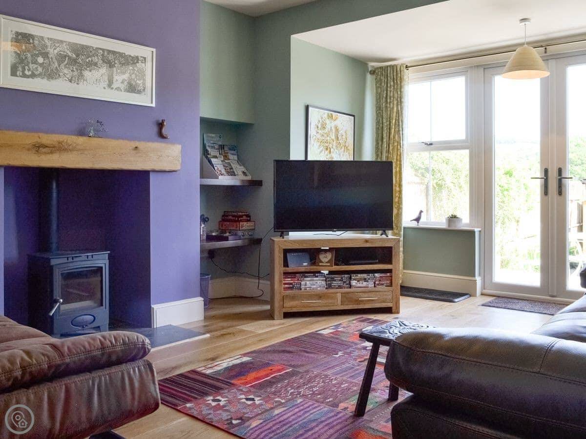 Downstairs, there's a living room with a wood burner. The kitchen is a decent size with a big oven and a dishwasher. There's a small utility room for boots and wet coats. You can get into the enclosed garden from the living room through French doors. It's a courtyard style, not massive, but it's there.