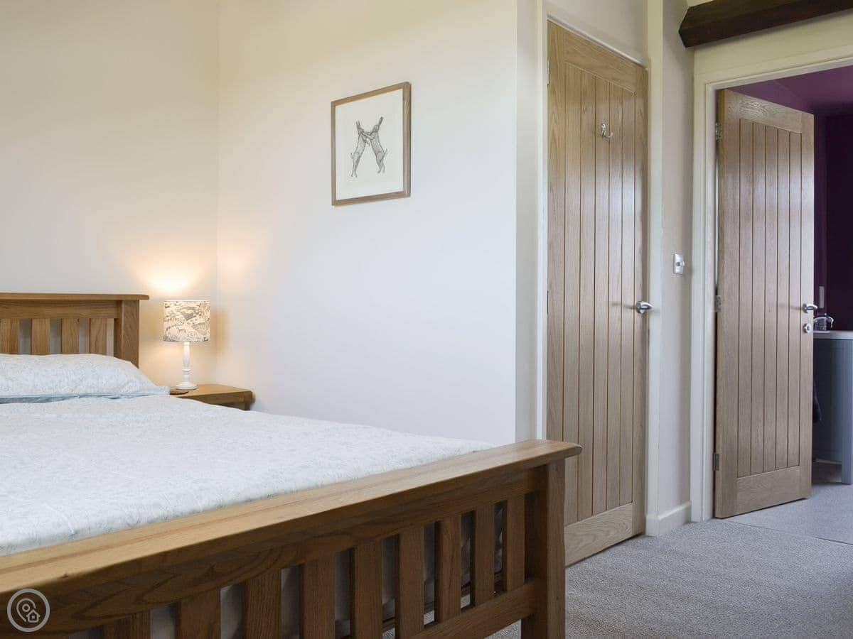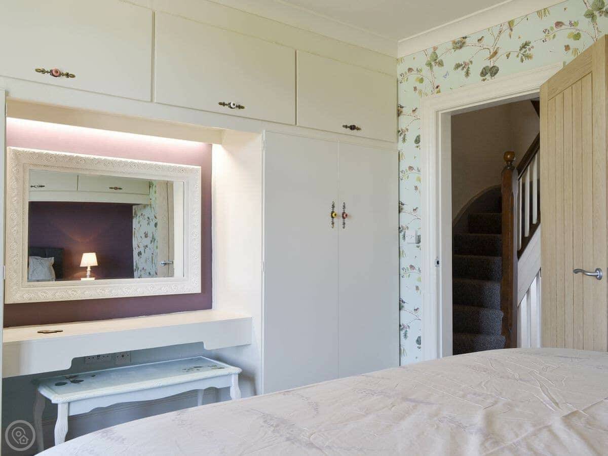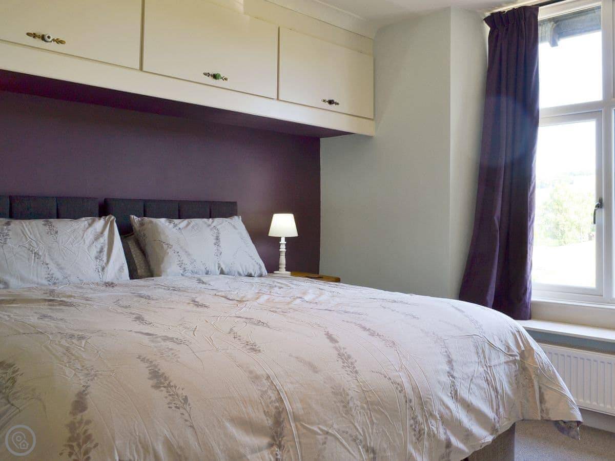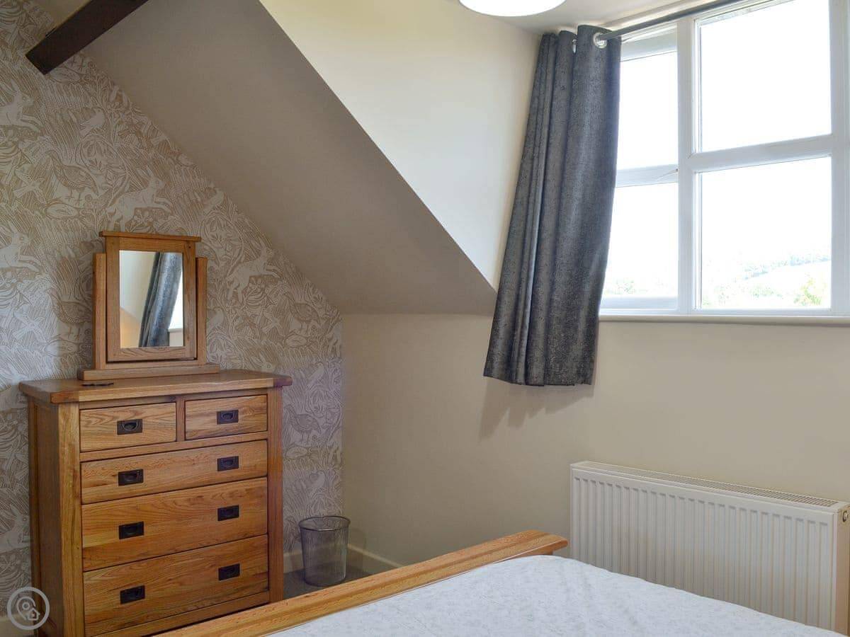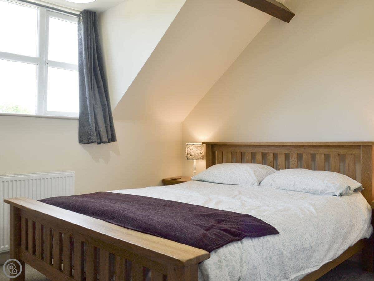 It sleeps four. There are two bedrooms and two bathrooms, which is handy. One bedroom is on the first floor, it's a twin that can be made into a super king. The bathroom on that floor has a bath with a shower over it. The other bedroom is up another flight of stairs on the top floor. It's a double with its own shower room. The stairs are proper cottage stairs, a bit steep and wind a little.