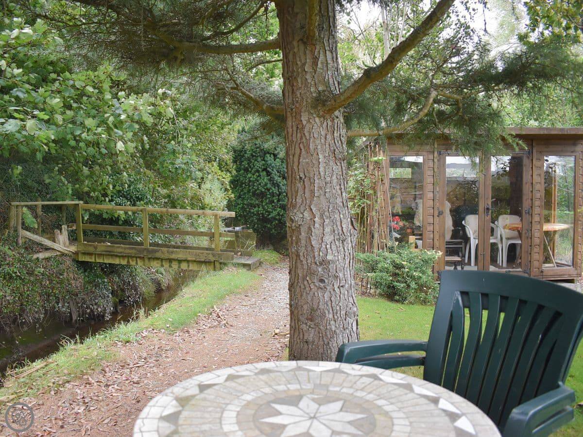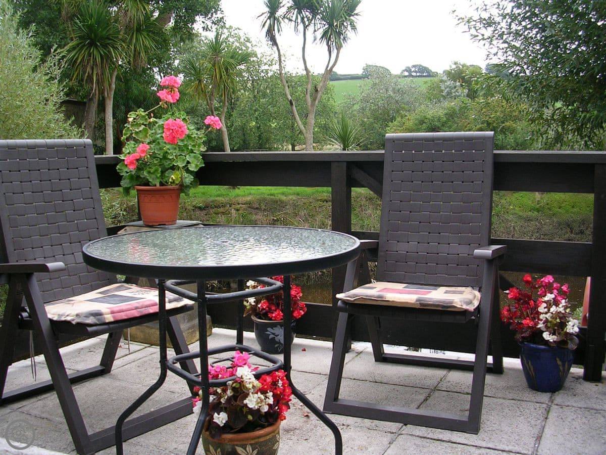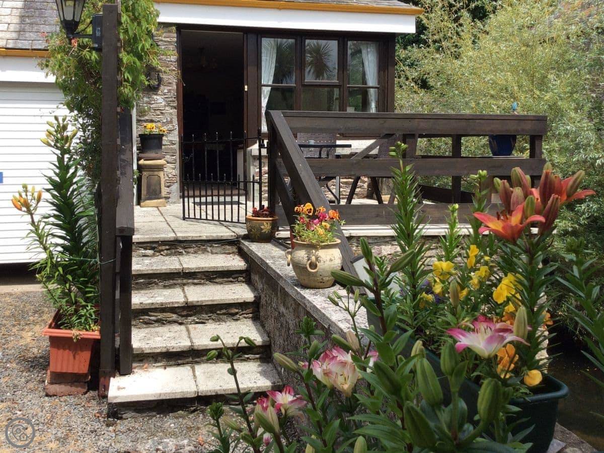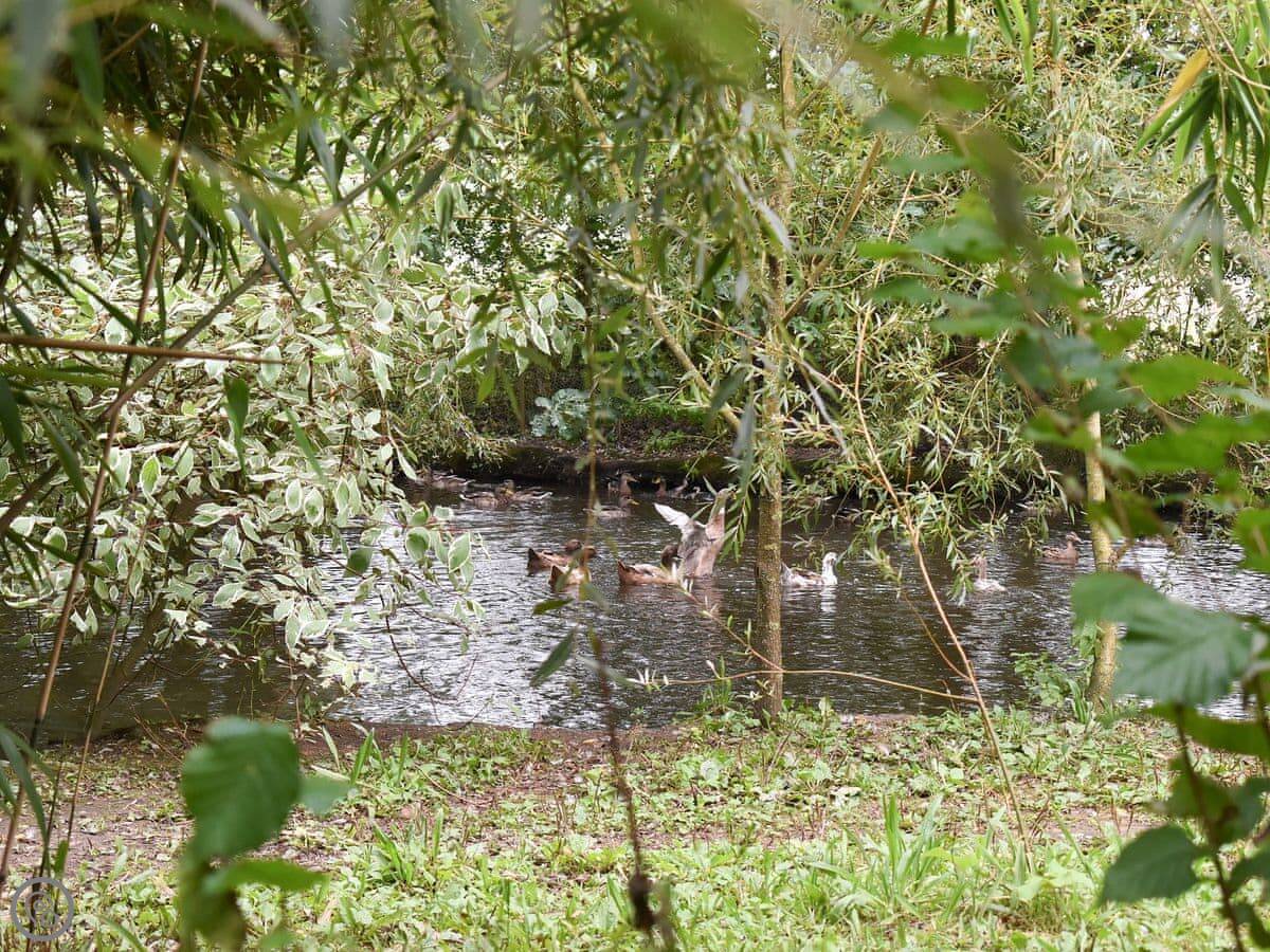 You get a private terrace at the front that faces south, over the mill pond. It's a sunny spot. The main gardens at the back are shared with us, the owners. They're nice to walk around. There's a mill stream and some chickens.