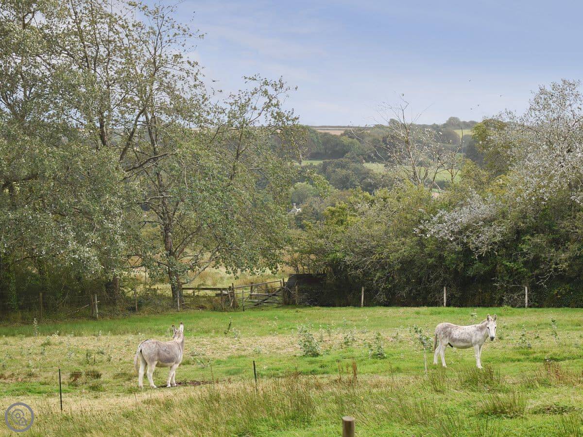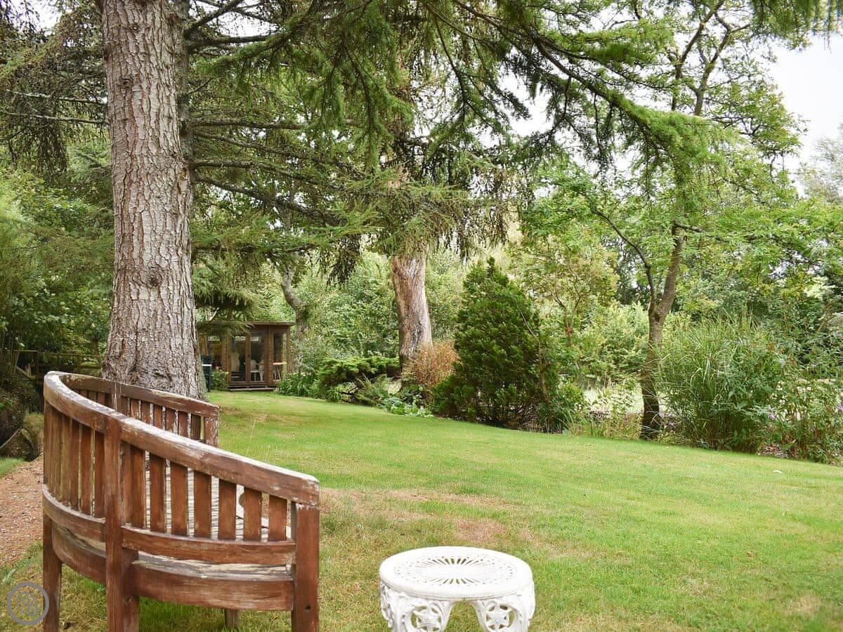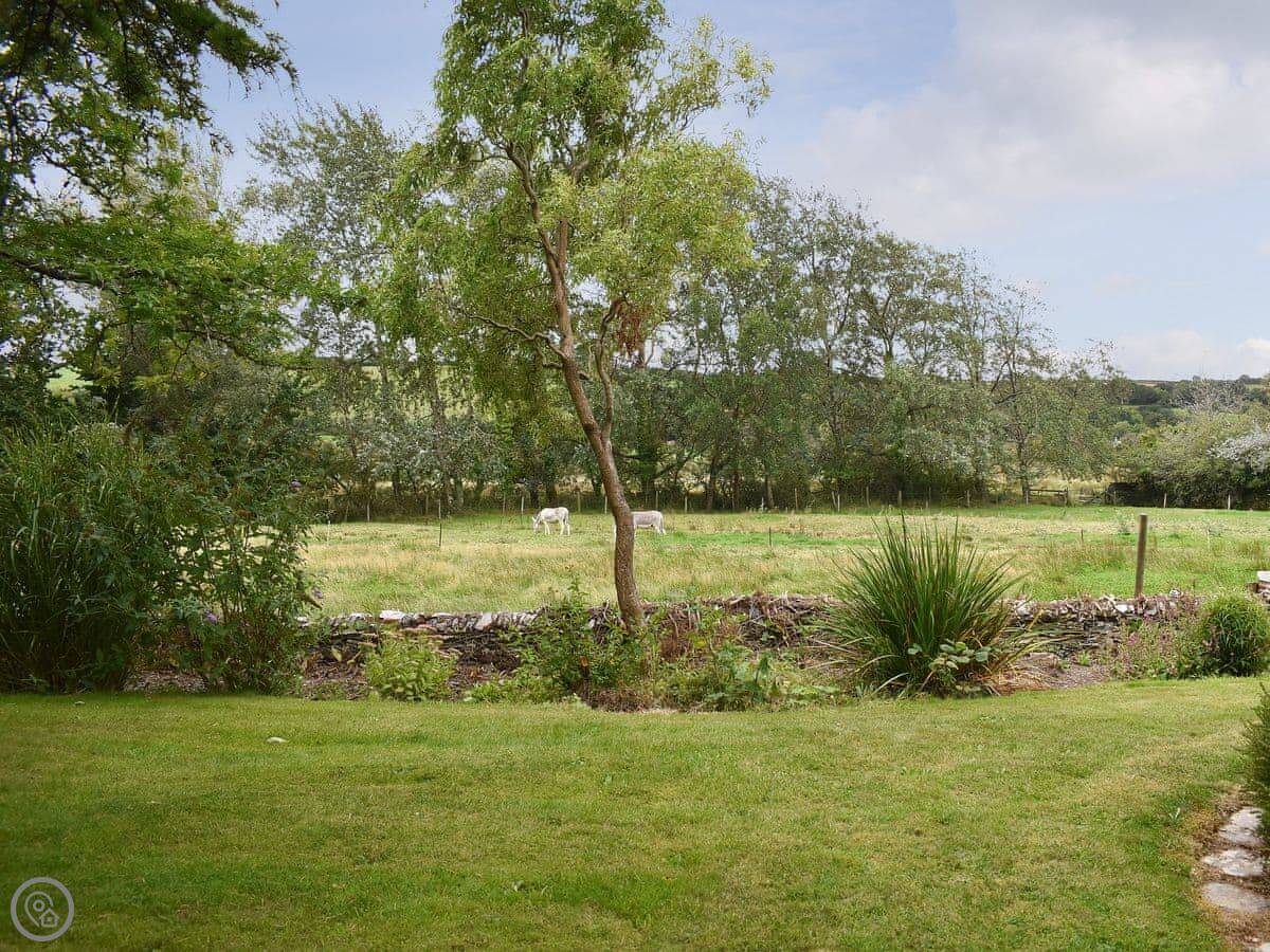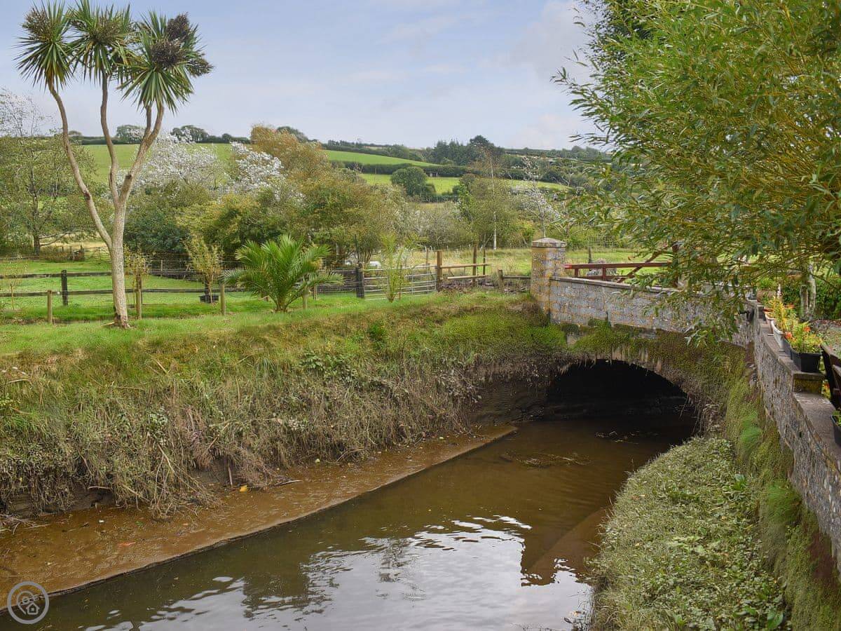 You get a private terrace at the front that faces south, over the mill pond. It's a sunny spot. The main gardens at the back are shared with us, the owners. They're nice to walk around. There's a mill stream and some chickens.