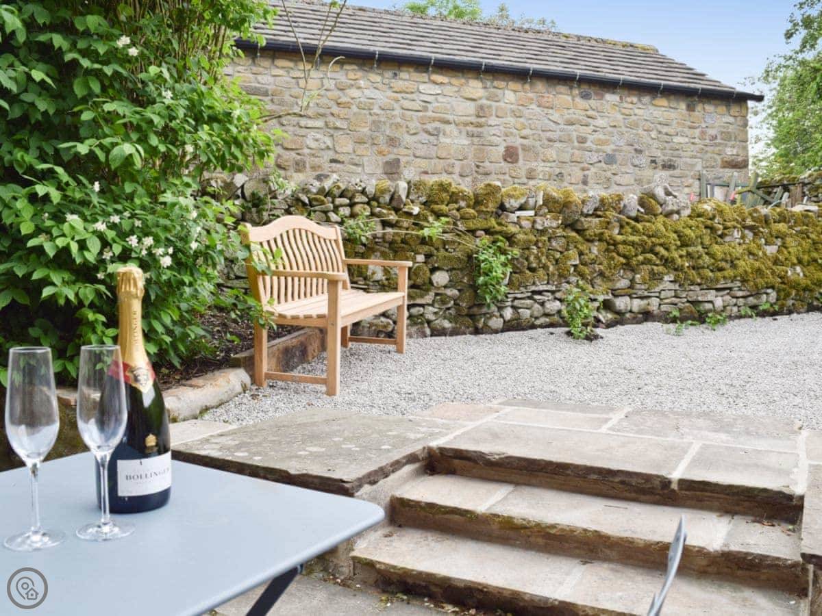 You can see the fields and hills from the windows. There's a small enclosed garden with a patio and a table.