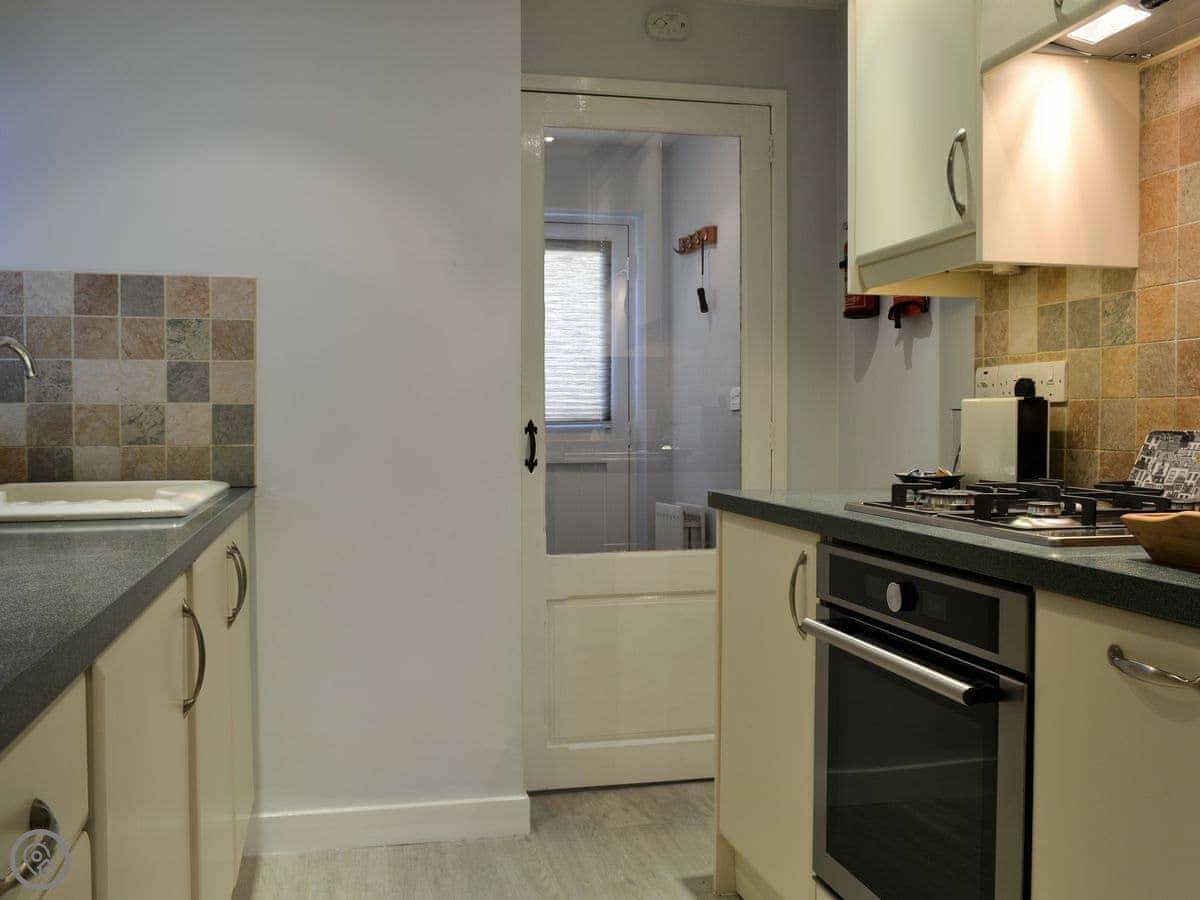 The kitchen is small but has what you need, including a dishwasher. The shower is good and powerful. There's an electric stove that looks like a wood burner for warmth. A small private patio area out the back has a table and chairs.