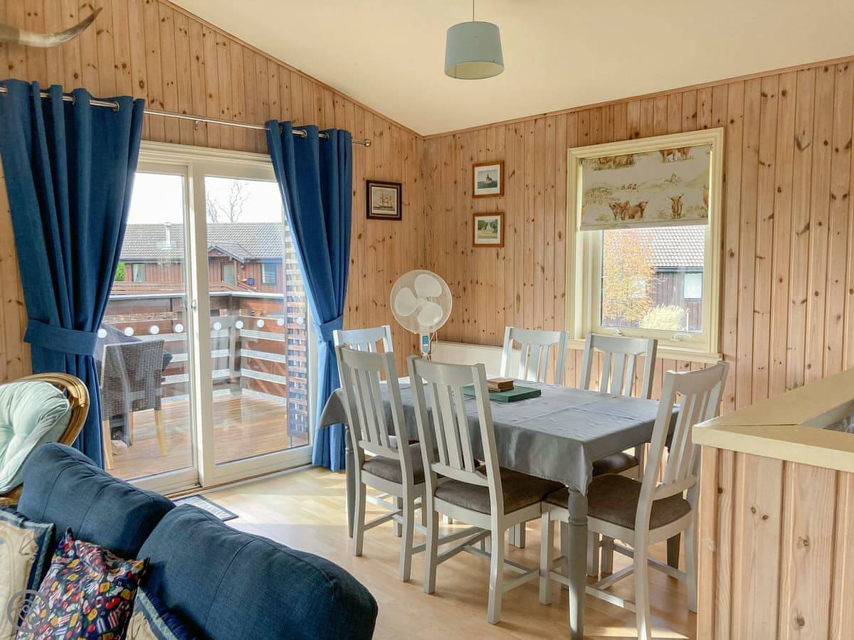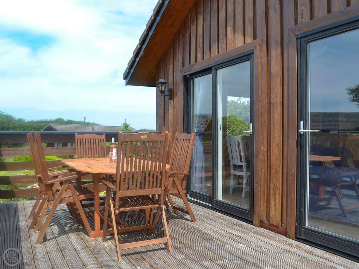 The main room is all open plan. There's a kitchen, a dining area, and the living space all together. It works for a family. Big doors open out onto a deck with a table and chairs.
