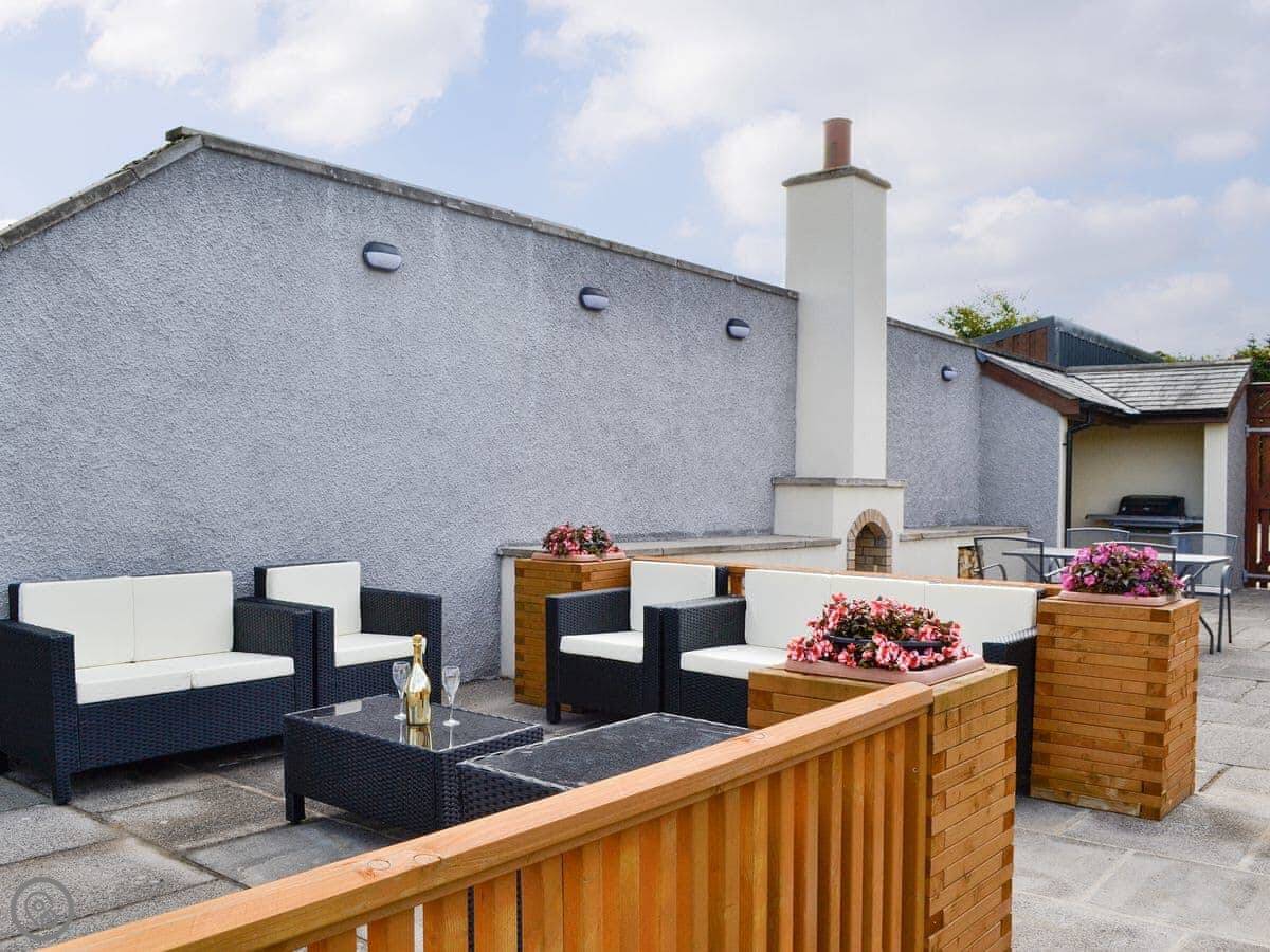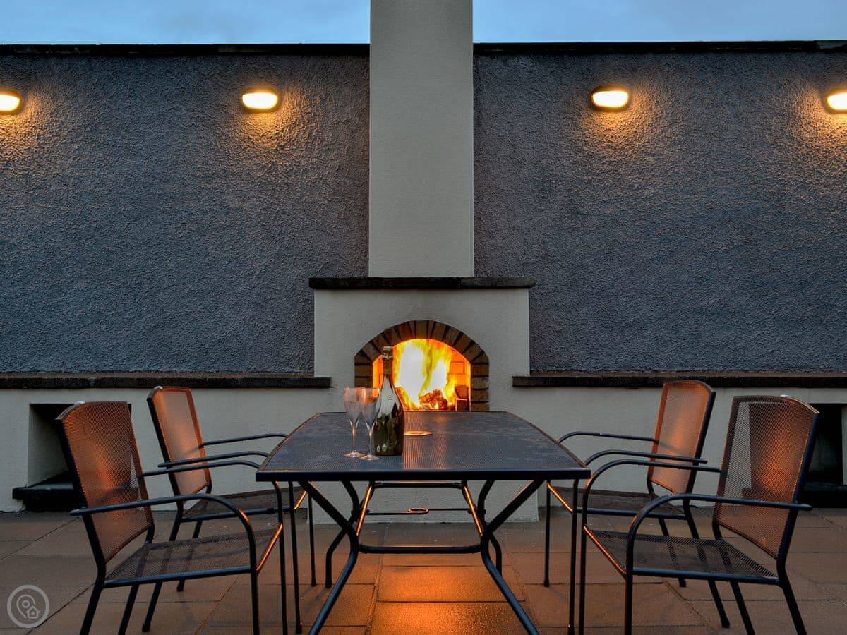 Outside there's a garden that's enclosed. It has a barbecue, a hot tub, and a sauna. They're there if you want them.