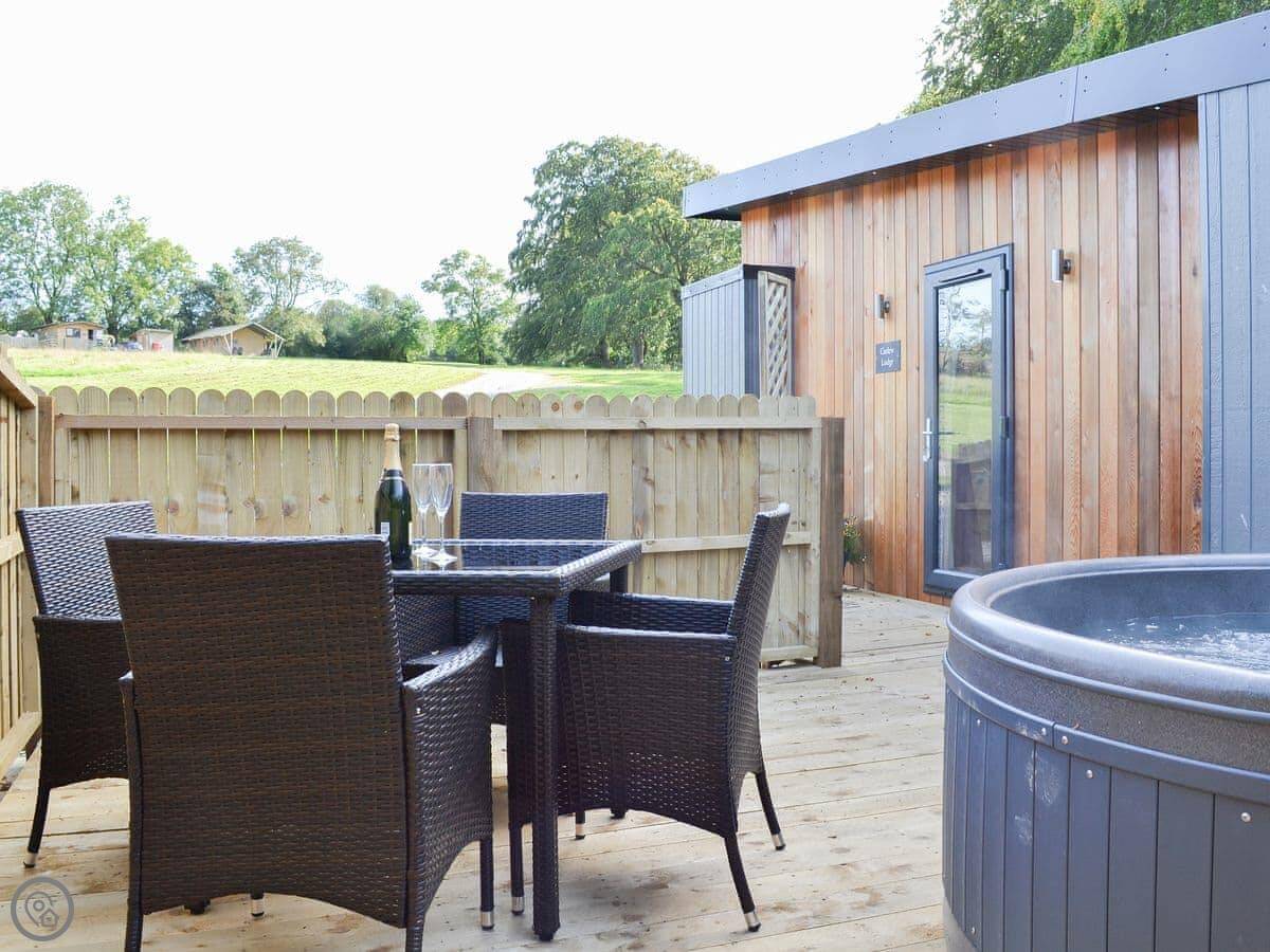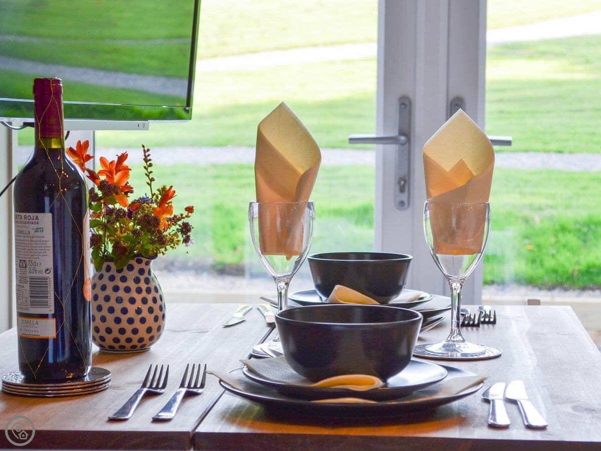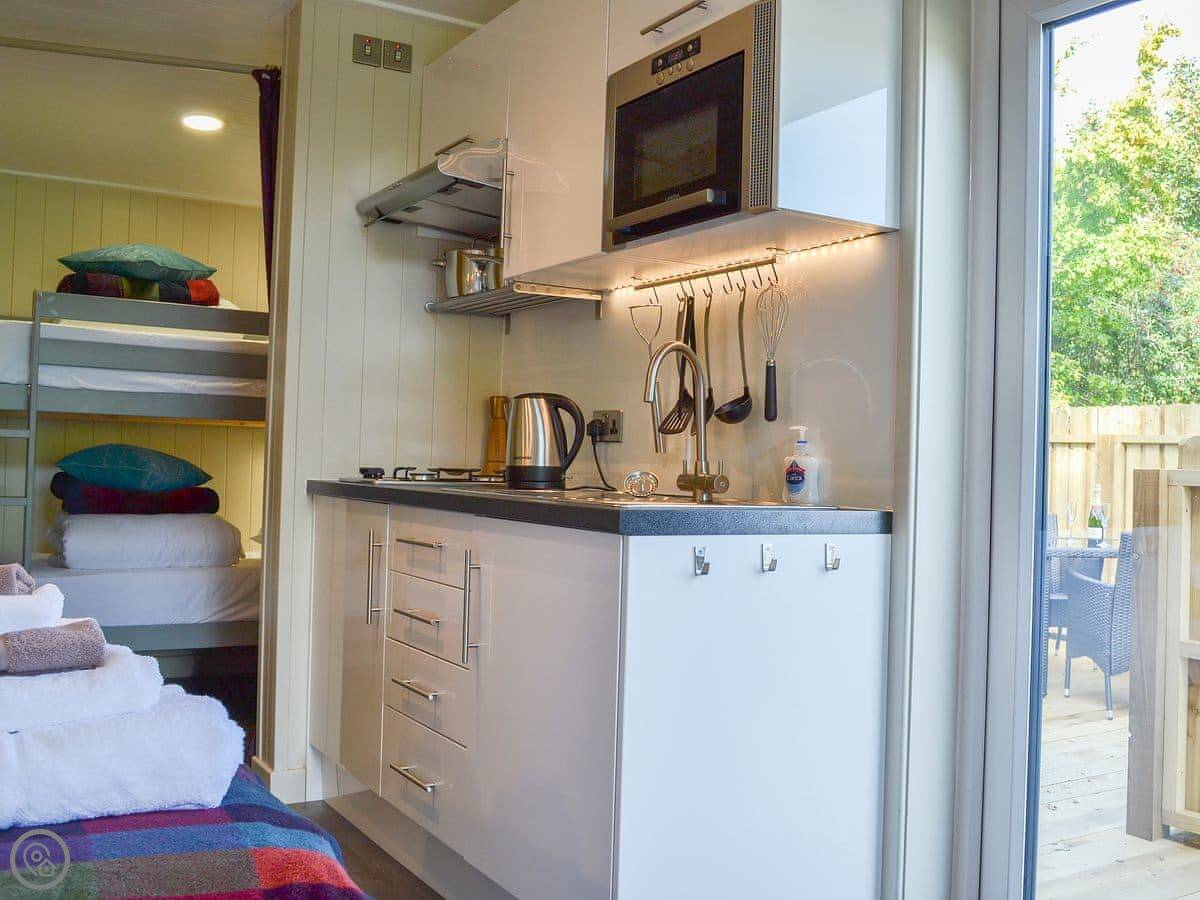 The main doors are large and face out over the site. You can open them up if the weather's good. There's a TV, WiFi, and a kitchen with what you'd need. The garden bit is enclosed. You can park right next to it.