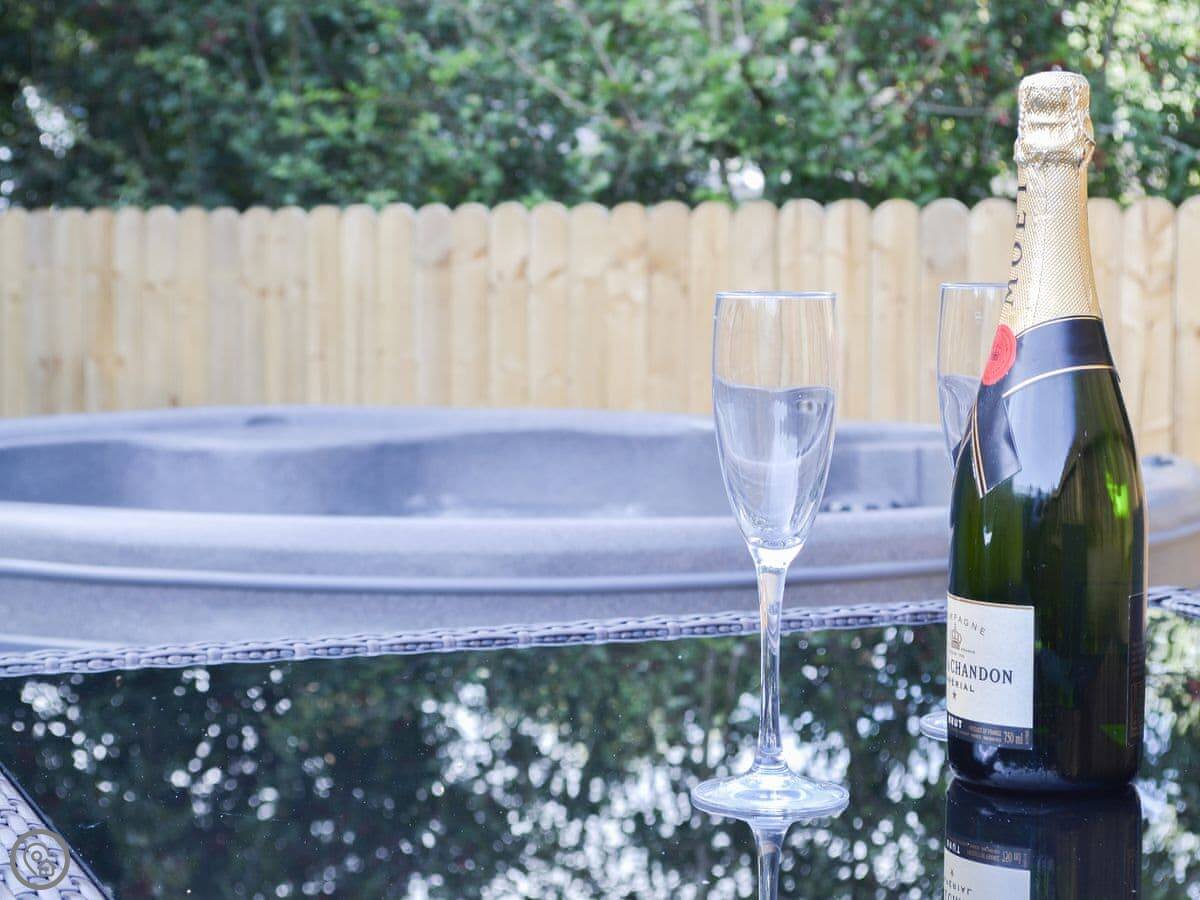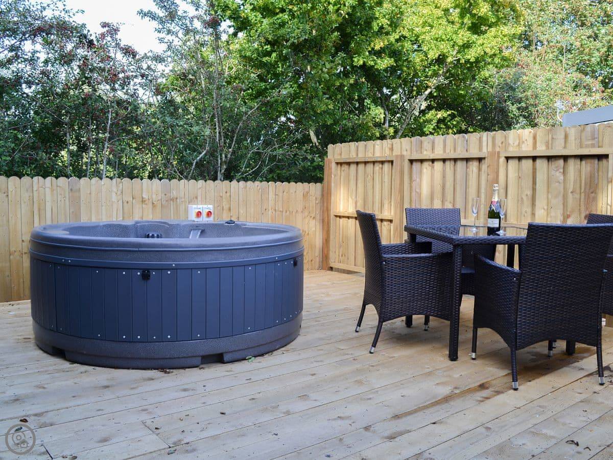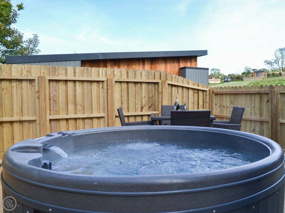 The main doors are large and face out over the site. You can open them up if the weather's good. There's a TV, WiFi, and a kitchen with what you'd need. The garden bit is enclosed. You can park right next to it.