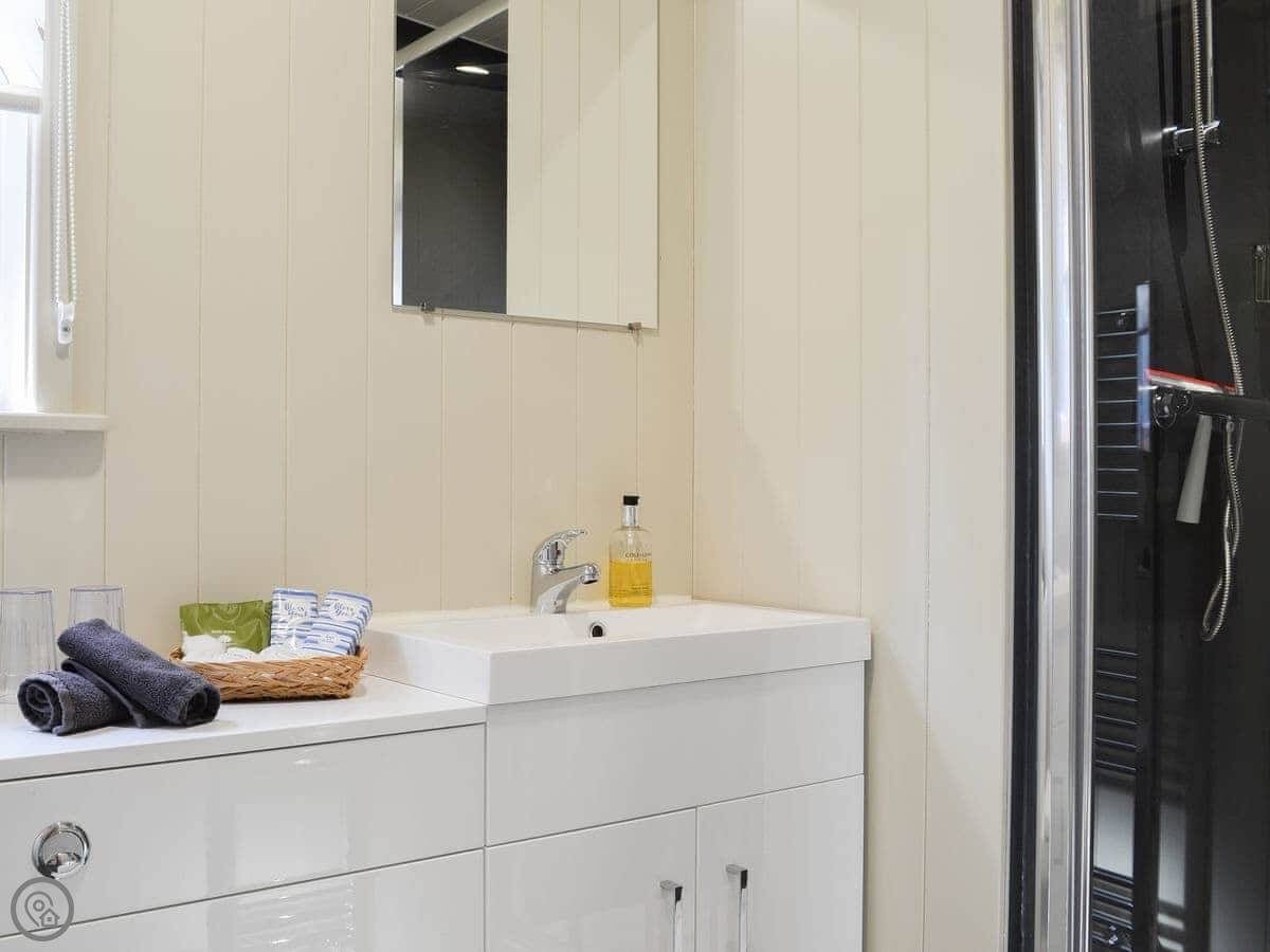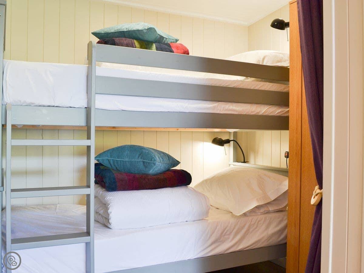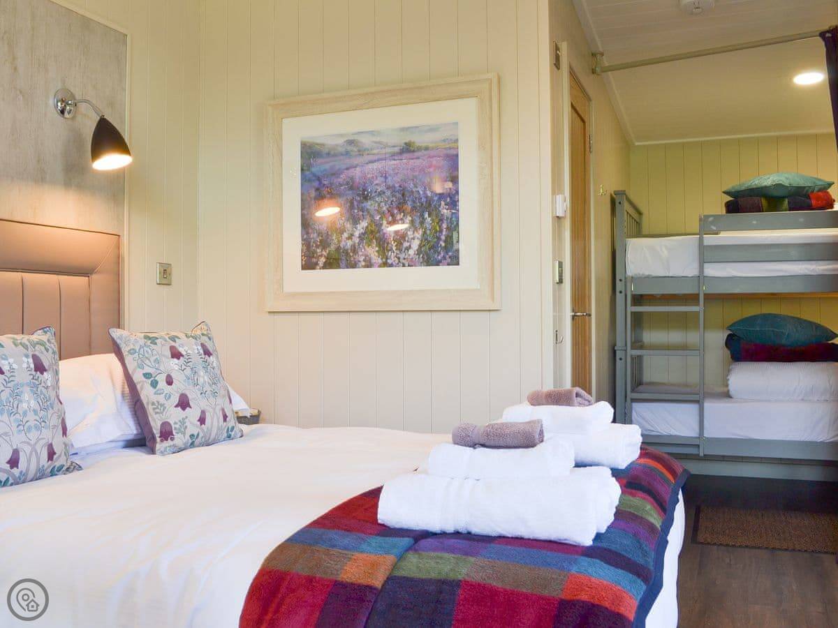 It sleeps four. There’s a double bed and one set of bunk beds, all in the same open-plan room. One bathroom with a shower. It's rated 4 Star. It’s clean and comfortable, but it's compact. The whole place is open plan, so there's no separate bedrooms.