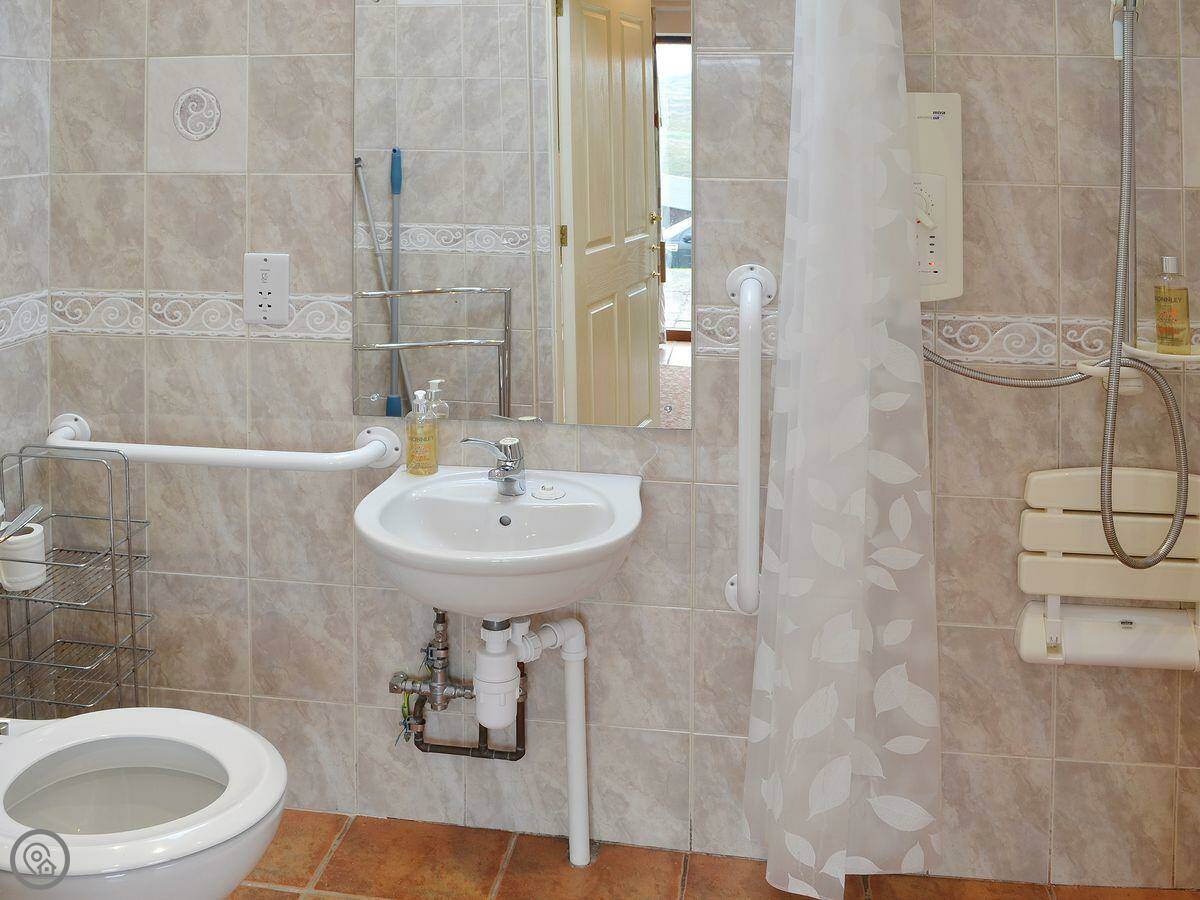 It sleeps two. One room with the bed and living space together. One bathroom with a walk-in shower. It's got a 3 Star rating. Everything works, it's clean and warm, but it's simple. It's all on the ground floor and has been set up to be wheelchair accessible. There are grab rails in the shower.