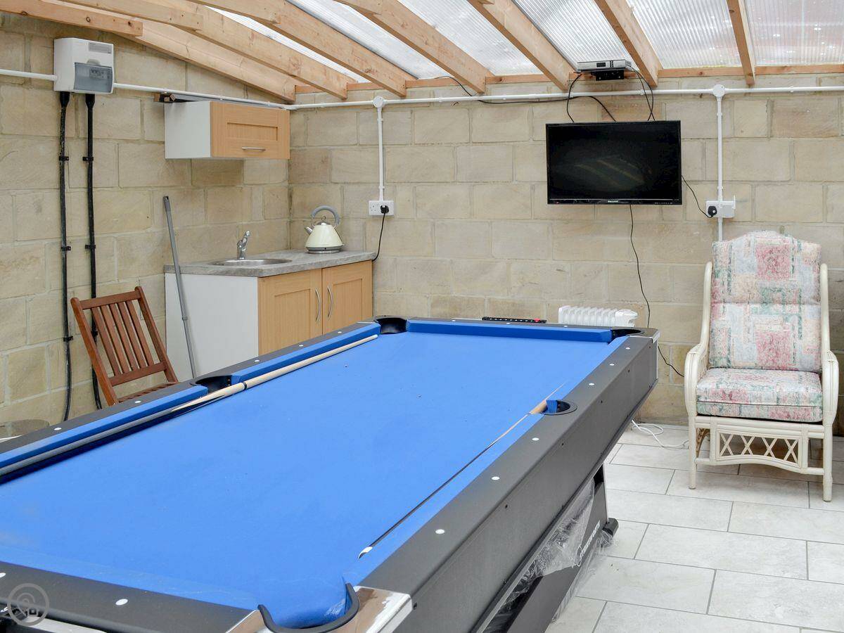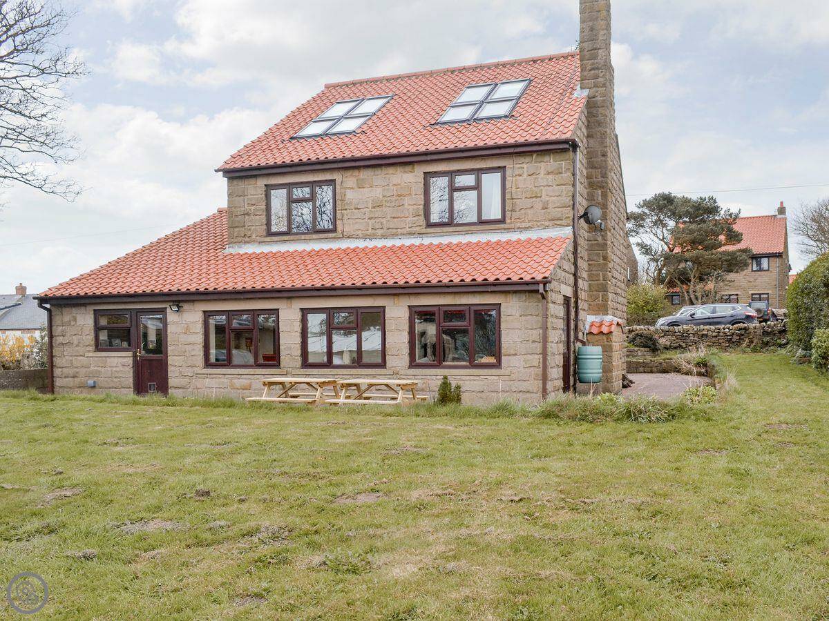 Denton House, in the hamlet of Ravenscar, stands in an elevated position 600 feet above sea level overlooking Robin Hood’s Bay and the North York Moors. The horizon is 33 miles distant on a clear day. This detached home was built in 1993 from locally quarried stone blocks and has oil central heating and two log burning stoves. A garden room, also constructed from stone blocks is heated by electric oil radiator, and contains a sink unit, garden chairs, television with built in DVD player. The main feature of the room is a games table which can be used for either American pool, air hockey and table tennis. A lockable garage may be used for the storage of bikes. The garden, which overlooks a field immediately behind the house and towards the valley and bay, has two patio areas, one behind the house and the other next to the garden room. Both enjoy a sunny aspect for the majority of sunny days. Sheep graze in the field at certain times of the year and dog owners need to be aware that this is sheep country. There is a modern kitchen and a handy downstairs shower room. The second floor has an open plan landing with sofa looking out towards the moors.