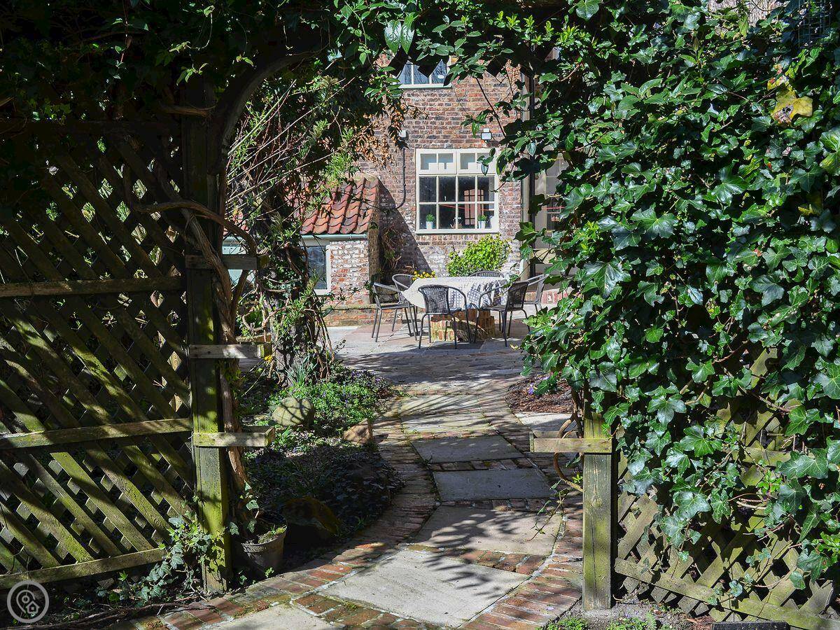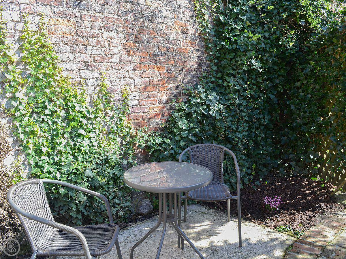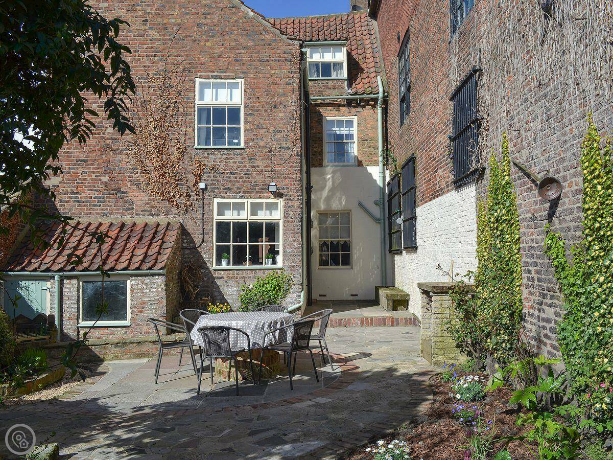 Outside, there’s an enclosed patio area at the back. It gets the sun in the evening. Good for a BBQ.