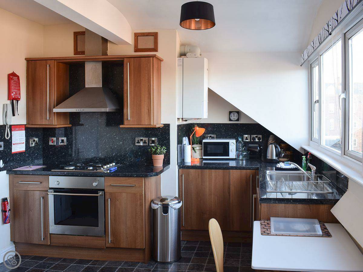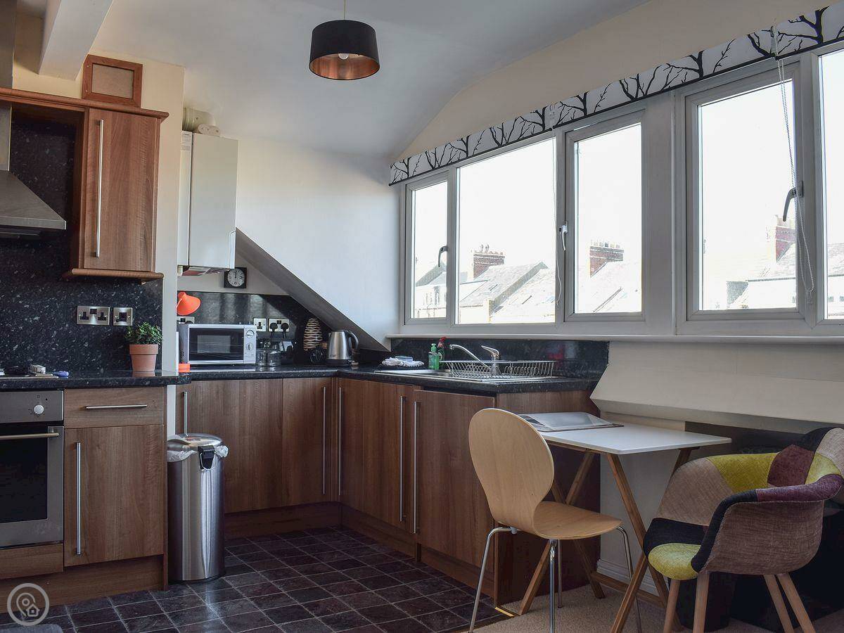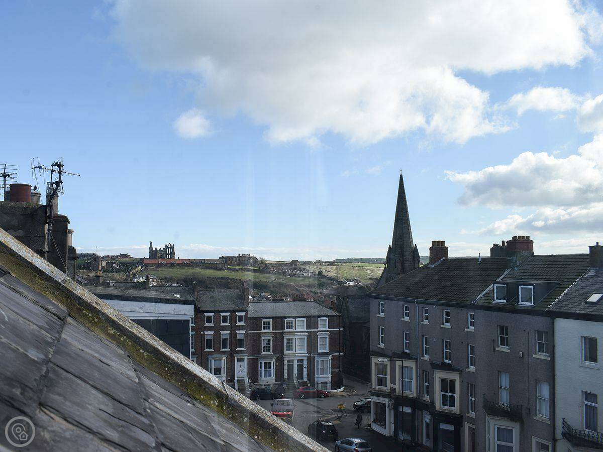 Moonshine Loft is a top floor flat in a Victorian house on Whitby's West Cliff. It's up two flights of stairs, so be ready for that. It's not huge, but it's fine for two people.