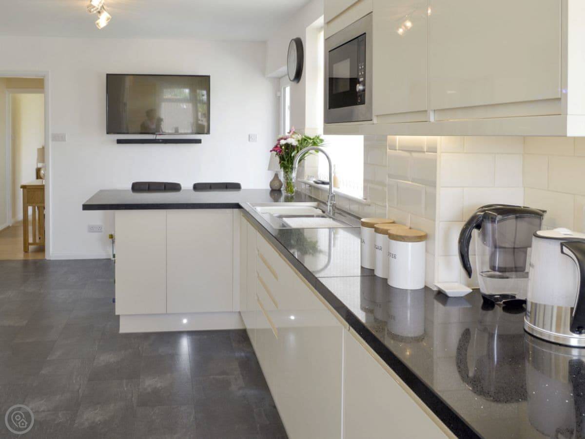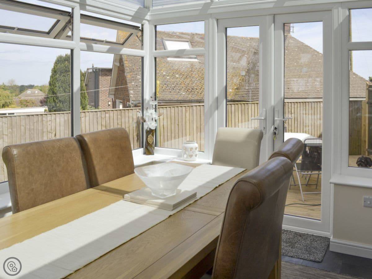 In terms of what's there: it's got a woodburning stove, a dishwasher, a washing machine, WiFi, and parking for a couple of cars on the drive. Bedding and towels are included. There's a cot and a highchair if you need them. The conservatory looks out over the garden. You can bring up to two dogs.