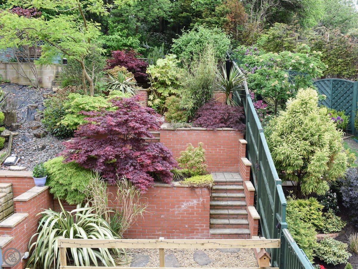 The back garden is on three little levels. There's a table and chairs on the bottom bit and a bench up the top.