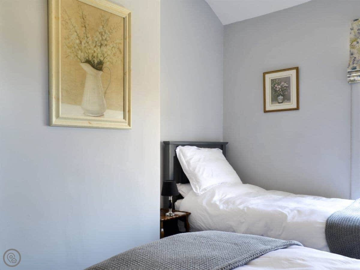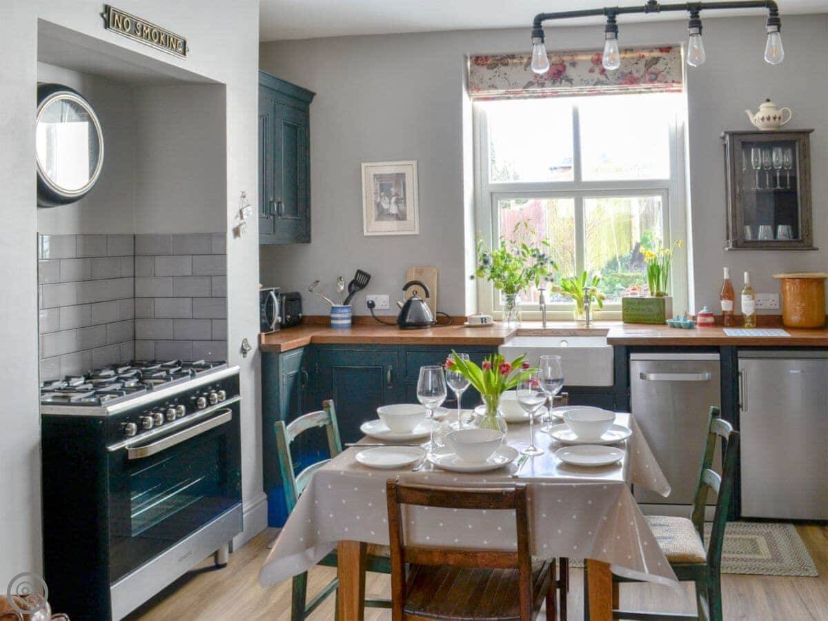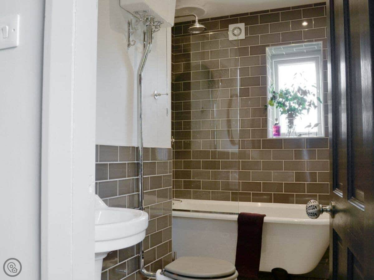 It sleeps four, two bedrooms. One bathroom with a roll-top bath and a shower over it. It's got a 5 Star rating, which honestly just means everything is really good quality and very clean. The kitchen is nice, oak worktops and a Belfast sink.