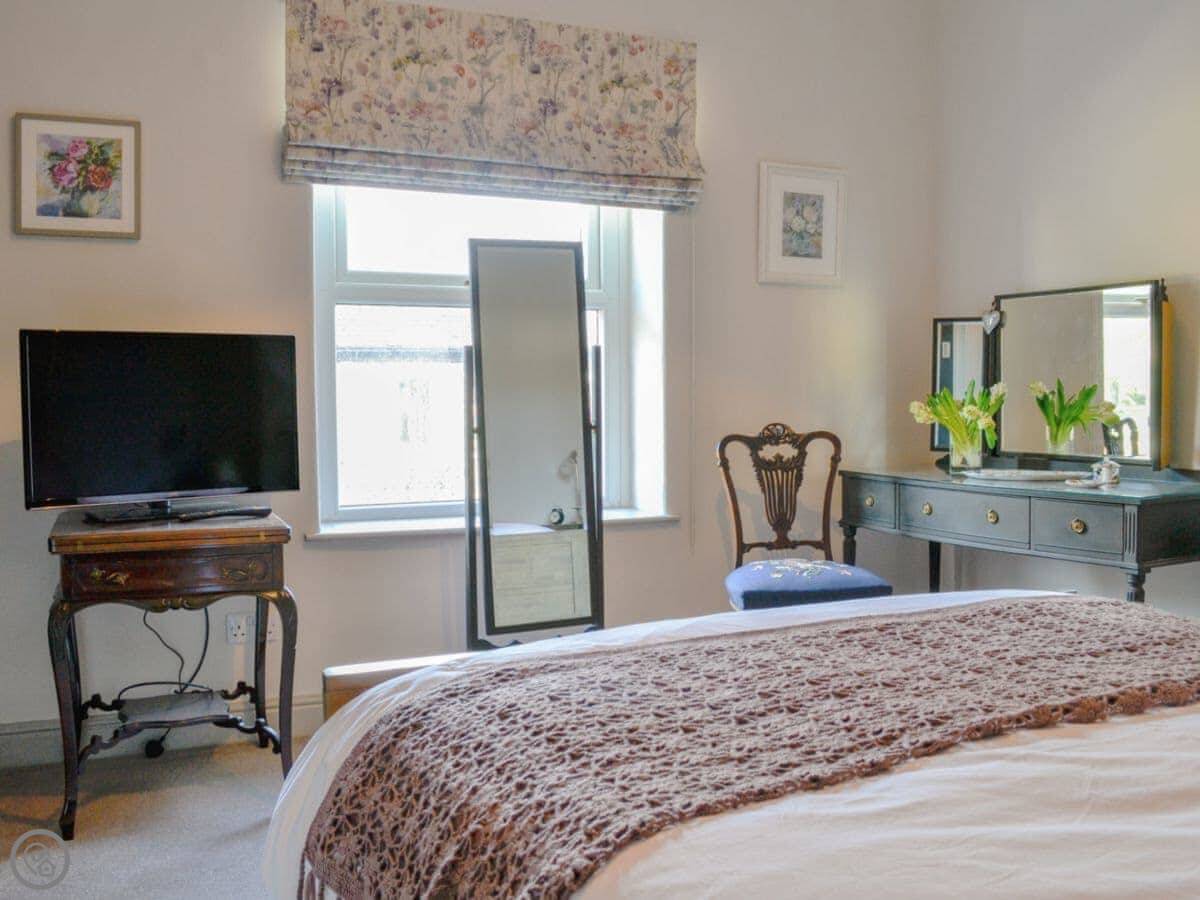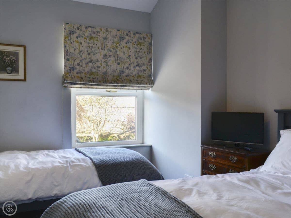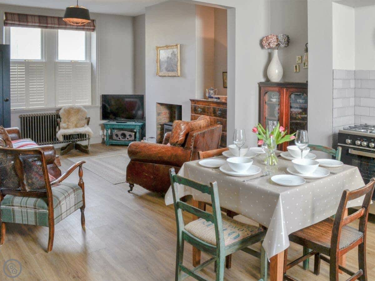 It sleeps four, two bedrooms. One bathroom with a roll-top bath and a shower over it. It's got a 5 Star rating, which honestly just means everything is really good quality and very clean. The kitchen is nice, oak worktops and a Belfast sink.
